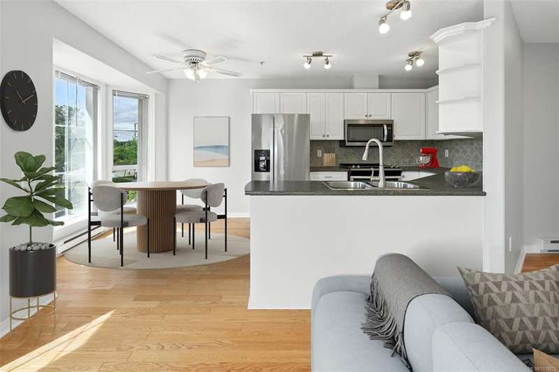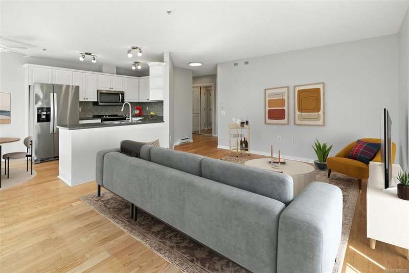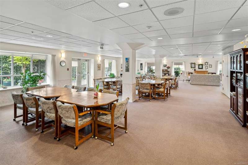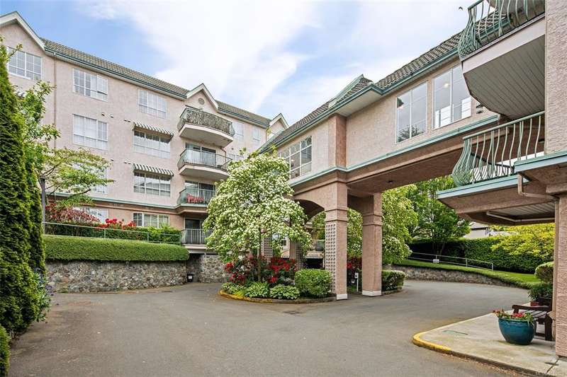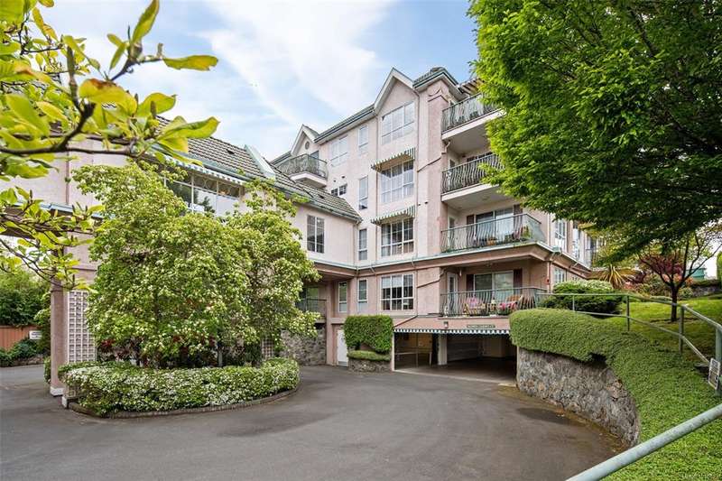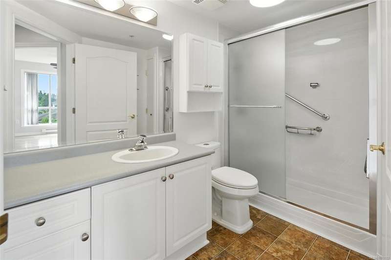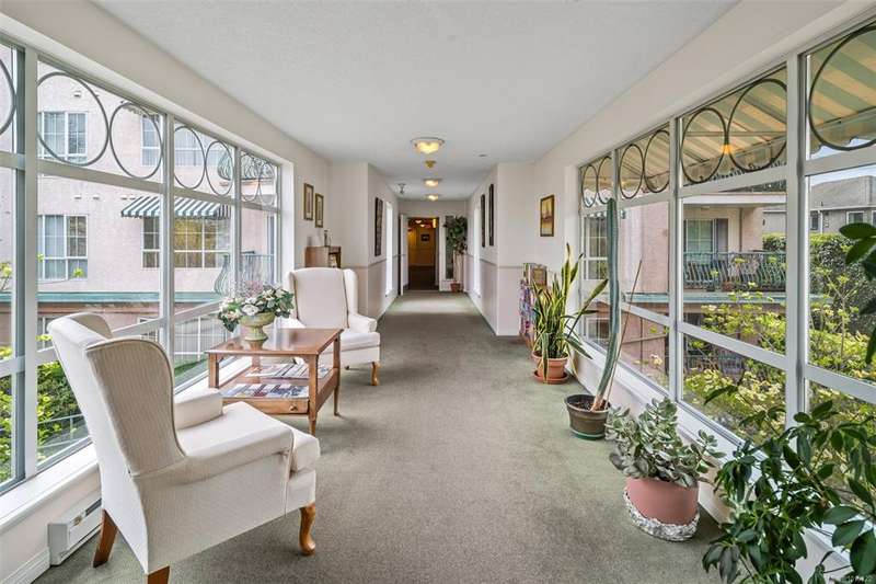 Welcome to Montague House! This top floor, southwest-facing suite is bathed in natural light, creating a bright and welcoming living space. Freshly painted, this spacious 2 bedroom layout features an open concept design, perfect for comfortable living and entertaining friends and family. Located in a well-maintained 55+ building, you'll enjoy access to fantastic amenities, including a social room, exercise area, and a rentable guest suite. Conveniently situated near trails along the Gorge, parks, shopping, banks, the library, coffee shops, and groceries, with transportation right at your doorstep. The building offers covered visitor parking, additional storage, and is well managed, with a waitlist for resident parking. One small furry friend (up to 25 lbs) is welcome. This is an ideal choice for downsizing or retirement, combining comfort and convenience in this exceptional community! PRICED REMARKABLY WELL FOR A PROMPT SALE!