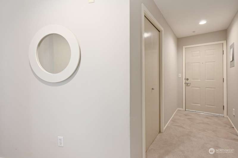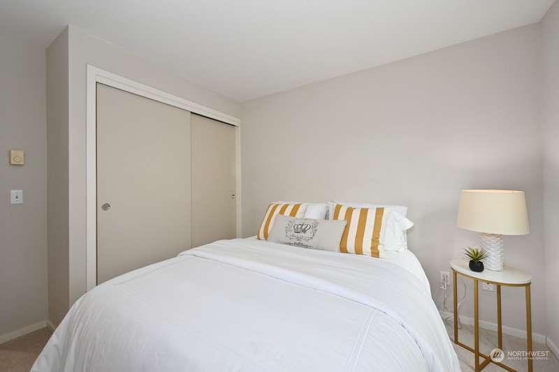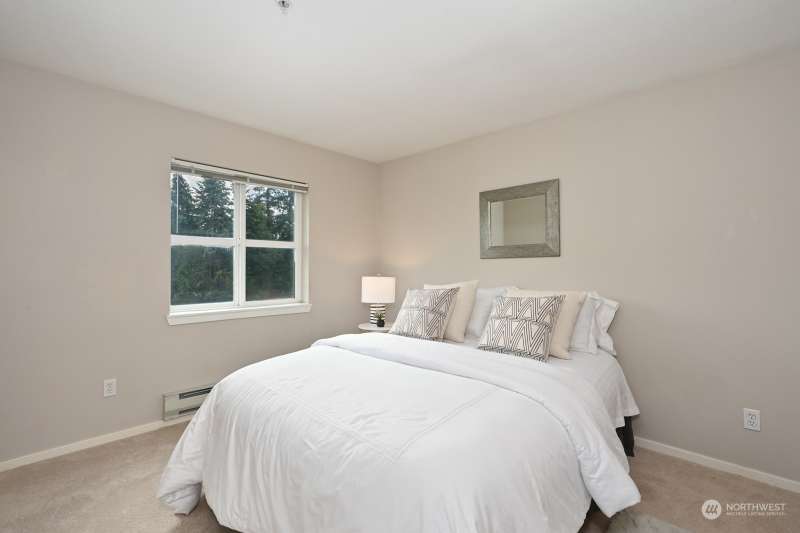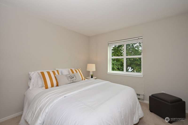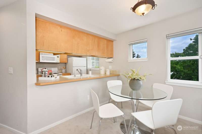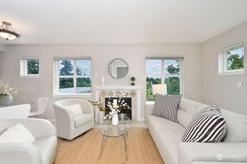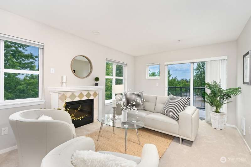 TOP FLOOR, corner unit, filled w/natural light and a desirable floor plan. Great value at this new price - amazing home in NE Seattle awaits! Move-in ready with new carpet, meticulously maintained & full-size W & D. Two spacious bedrooms, separated by the living spaces allow flexibility and privacy; ideal for roommate or home office. Cozy up near the fireplace or enjoy the territorial & mountain views from your balcony! Incredibly convenient location w/multiple light rail stops nearby, and close to numerous retail options + walk score = 73, “very walkable”. Secure lobby, level entry, elevator and BONUS - two parking spots in gated common garage. Dog and Cat Friendly - bring them both. Quiet, Convenient and one not to miss. Easy to tour!