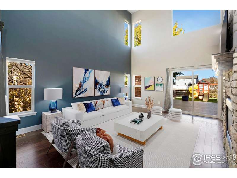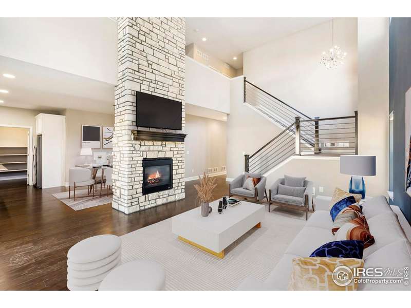 Welcome to this stunning contemporary two-story home, built in 2017, located in the desirable Stone Creek subdivision of Loveland. This property offers an incredibly open main level, featuring a spacious kitchen that seamlessly flows into the dining and living areas, anchored by a breathtaking two-sided fireplace adorned with exquisite stonework. The main floor also includes a versatile bedroom/study, perfect for working from home or as a guest room. Recently updated with new carpet and fresh exterior paint, this home feels both inviting and modern. Upstairs, you'll find three well-appointed bedrooms, including a large primary suite, alongside an additional bathroom and a flexible loft area ideal for relaxation or play. With upgraded hand-troweled wall texture throughout, this home exudes quality and style. Step outside to discover a backyard masterpiece, featuring a newer Trex deck with reinforced supports and electrical for a hot tub, providing an ideal space for outdoor gatherings. The elevated deck overlooks expansive open space, creating a serene retreat. Situated on a quiet cul-de-sac, it is conveniently located next door to the Stone Creek pool, workout facility, and clubhouse, making it an ideal choice foractive living.