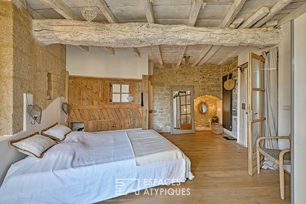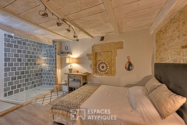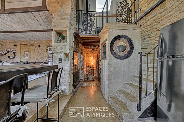 Behind its antique door, the entrance opens onto a generous summer lounge, bathed in light, where a jacuzzi invites relaxation. From there, a spiral staircase, a witness to a centuries-old past, leads to the upper floors.