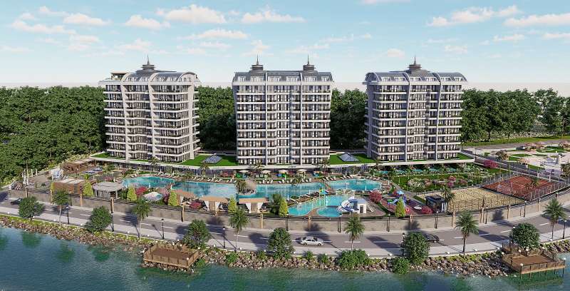 Built on a 20,500 m² land area, the project consists of 3 blocks. The complex features indoor and outdoor swimming pools, an aquapark pool, a children’s pool, barbecue areas, outdoor fitness areas, foot billiards, an amphitheater, a winter garden, a jacuzzi, children’s playgrounds, a beach volleyball court, football pitch, basketball court, tennis court, mini golf, relaxation areas, walking paths, a bicycle path, a charging station, a botanical garden, a pool bar, parking areas, giant chess, gazebos, a lobby reception, a children’s playroom, a fitness center, a cinema room, table tennis, a massage room, a Turkish bath, sauna, steam room, Russian sauna, market, laundry facilities, car rental service, shuttle service to the beach, and cleaning services.