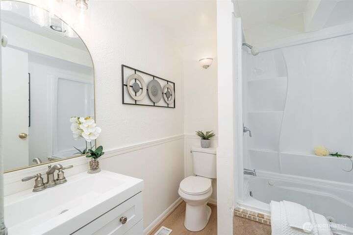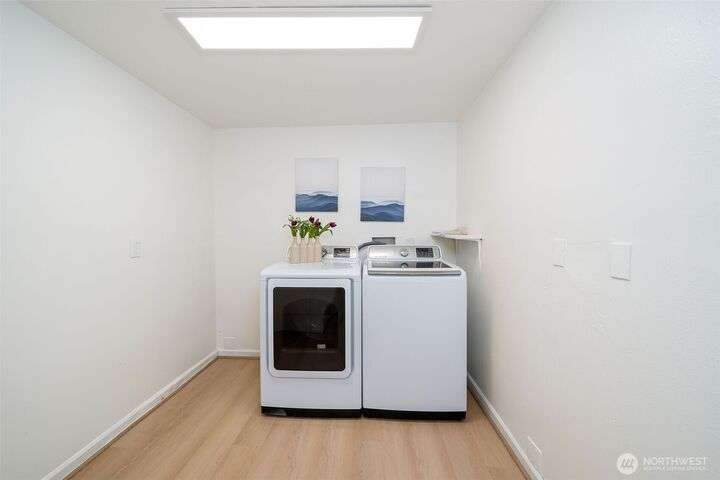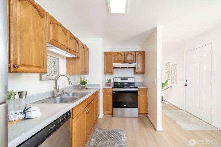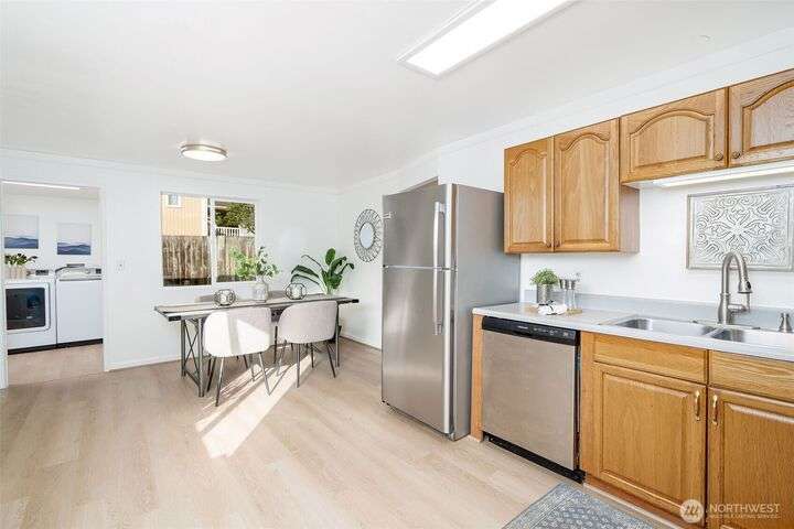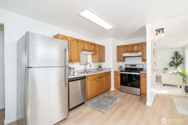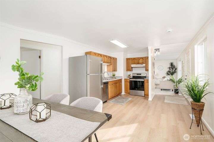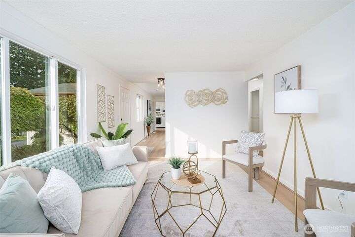 Discover this beautifully refreshed rambler in desirable Kingsgate! Just 4 minutes from Totem Lake Village, this move-in ready 3-bed, 2-bath home offers incredible value in an unbeatable location. Step inside to find a freshly painted interior, brand new flooring throughout, & updated light fixtures creating a warm, welcoming feel. You'll love the cozy living room with its classic wood-burning fireplace, while the primary bedroom features a private en suite bath & opens to a back deck—perfect for morning coffee or evening relaxation. All on a huge 11,550 sqft lot with potential for a DADU (buyer to verify), sports court, or gardener's paradise - endless possibilities. Centrally located with quick access to I-405 just minutes away.