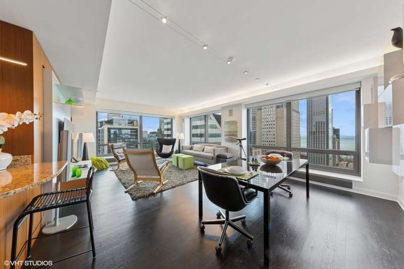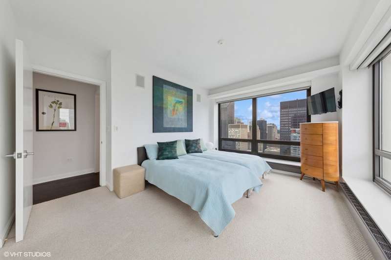 Discover urban elegance in this highly upgraded 3BR/3BA residence on the 41st floor of the Heritage, perfectly positioned on Chicago's Cultural Mile for downsizers and second home buyers seeking proximity to theater, Millennium Park, Lake Michigan, and the Museum Campus. Breathtaking North/East/West corner views of the city skyline, lake, and park unfold through floor-to-ceiling windows, amplifying the 2157 sq ft layout. Custom motorized shades, cove lighting, and bespoke cabinetry elevate the sophisticated interiors. The open kitchen, dining, and living areas feature upgraded hardwood flooring, abundant counter space, a breakfast bar, and access to a spacious recessed balcony-ideal for relaxing or entertaining. The primary suite boasts a Jacuzzi bath, separate shower, walk-in closet, and custom Abitare cabinetry. A dedicated laundry room (not a closet), guest suite, and third bedroom/home office with tailored desk and shelving add practicality and charm. Enjoy Crestron-controlled Lutron lighting and Boston Acoustics surround sound for effortless ambiance. Building amenities include an indoor pool, hot tub, saunas, fitness center, community rooms & co-working space, dog run, 24/7 door staff, and direct pedway access to rail transit for seamless O'Hare connections. Steps from world-class theater, Symphony Center, Art Institute, Museum Campus, and lakefront trails, this home offers vibrant city living with the serenity of a well-appointed retreat. Stroll to Millennium Park's Lurie Gardens, sail from Monroe Harbor, or dine along the Magnificent Mile-all just outside your door.