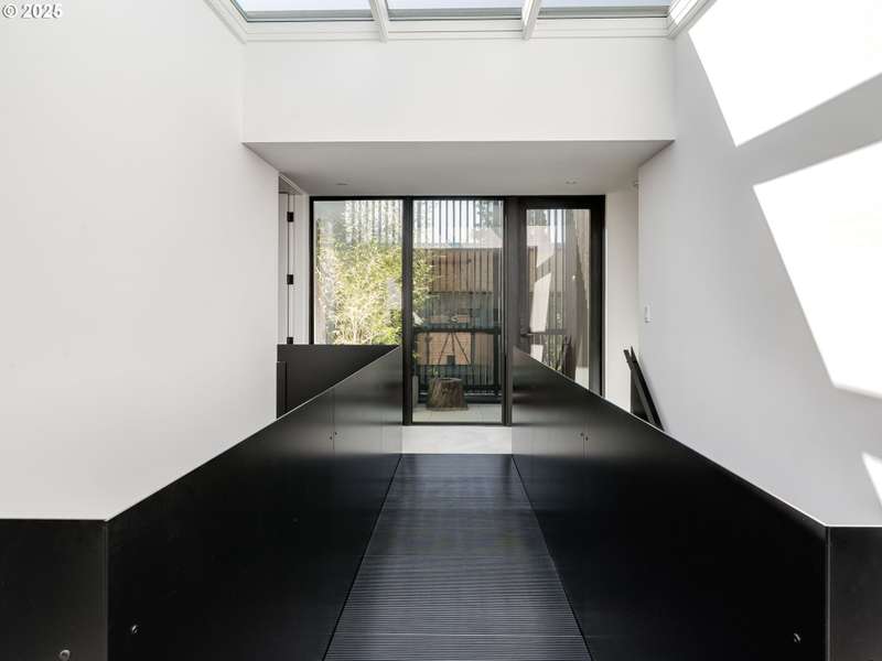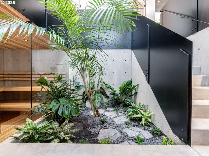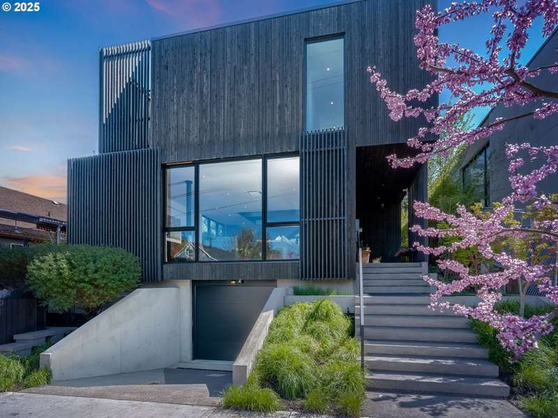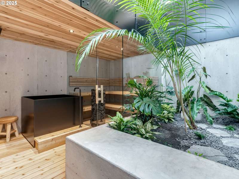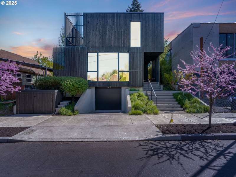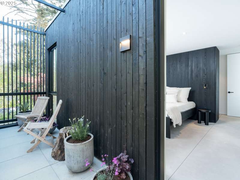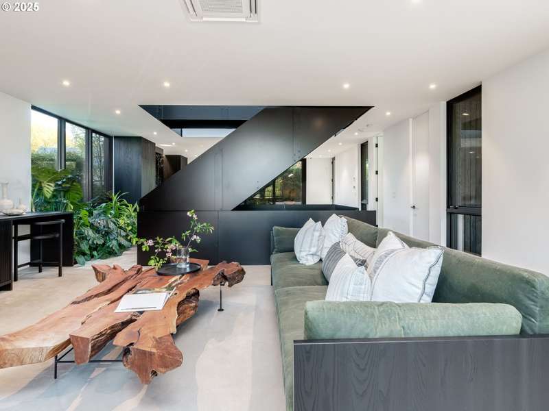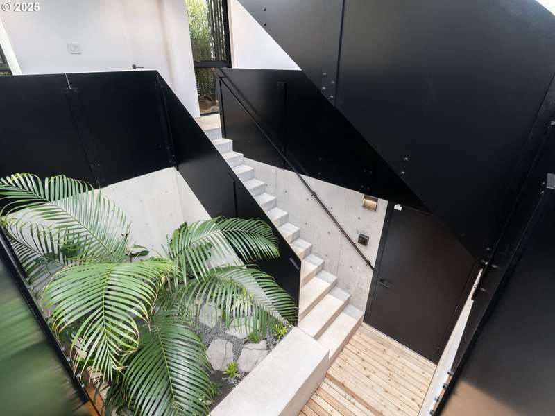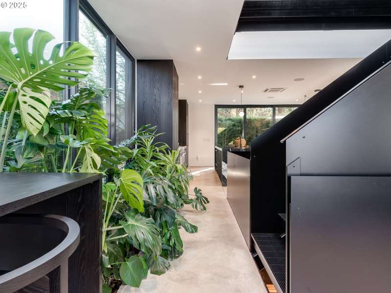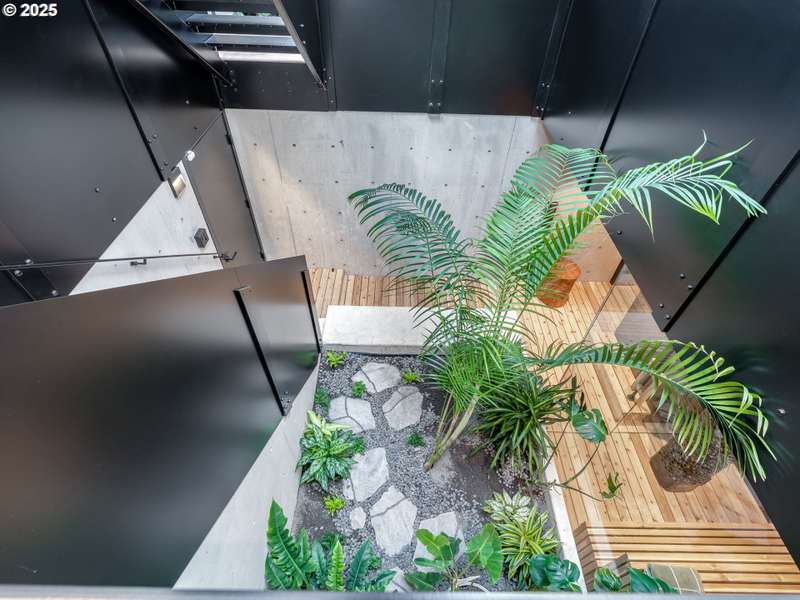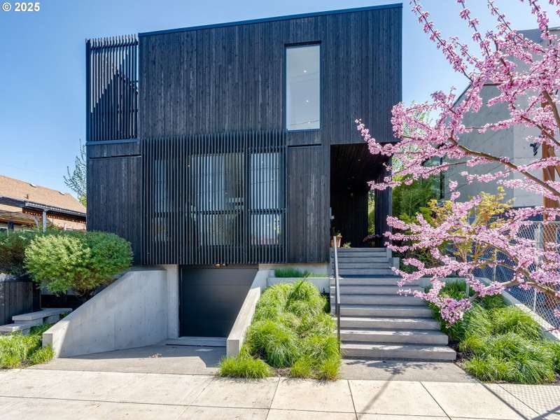 The Atrium House is a rare architectural gem in the heart of the Richmond neighborhood, just blocks off trendy Division St. This infill project by Capsule Development brings custom-quality design to the Eastside—where creativity, craftsmanship, and nature meet. This modern masterpiece features soaring ceilings, heated concrete floors, & a stunning three-story atrium. Anchoring the living space is a steel staircase, fabricated locally in Portland, spanning all 3 levels. The lower level boasts a cedar dry sauna paired with a custom steel cold plunge & shower, creating a private wellness retreat. Lush, curated greenery surrounds the space, enhancing the sense of calm & relaxation. On the main floor, the chef’s kitchen is equipped with high-end, built-in appliances from Bertazzoni and Fisher & Paykel. Throughout the home, the custom ash cabinetry was charred using traditional Japanese Shou Sugi Ban technique, offering enduring beauty and a refined timeless aesthetic. Luxury materials like Maori Brazilian granite slabs elevate the kitchen & baths. Just off the dining room, sliding doors open to the back patio for seamless entertaining. In the living room, a RAIS wood stove serves as both a cozy heat source and a striking sculptural centerpiece. One of the most distinctive features of the house is that it comes fully furnished, with pieces specifically crafted to reflect and elevate the home's modern, natural aesthetic. Upstairs, you’ll find all 3 bedrooms, a dedicated laundry area, and a guest bath. Each bedroom features its own balcony—perfect for enjoying fresh morning air or a relaxing evening breeze. Floor-to-ceiling windows flood the space with natural light, enhancing the open, airy feel throughout. Out front, rolling shutters add a dramatic architectural touch while offering both privacy and adjustable light control. A truly one-of-a-kind property that celebrates thoughtful design & modern living in one of Portland’s most sought-after neighborhoods. [Home Energy Score = 8. HES Report at https://rpt.greenbuildingregistry.com/hes/OR10191104]