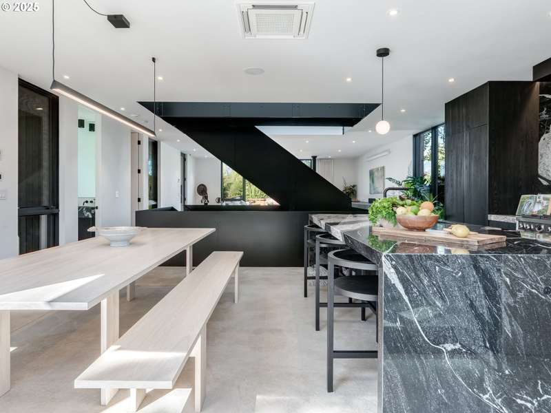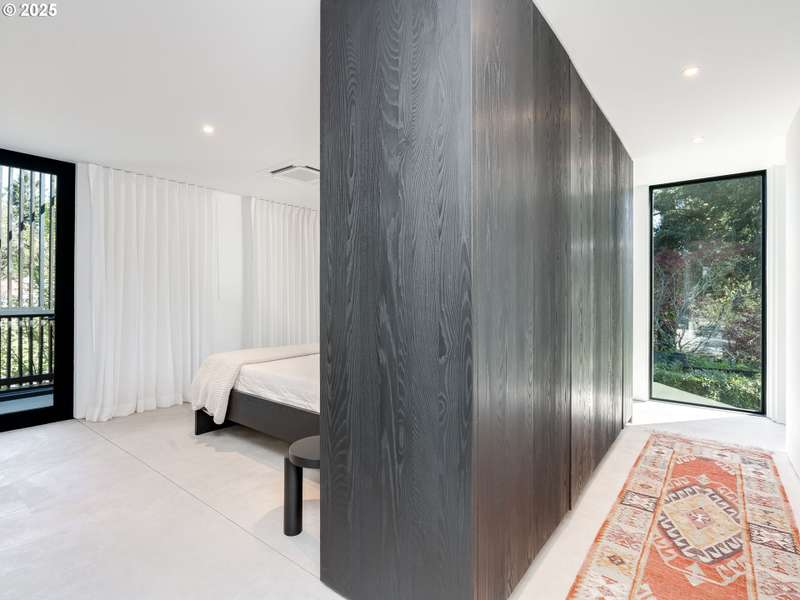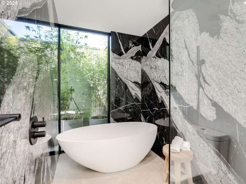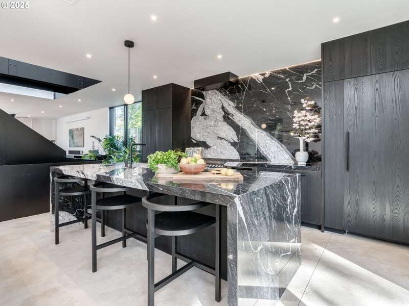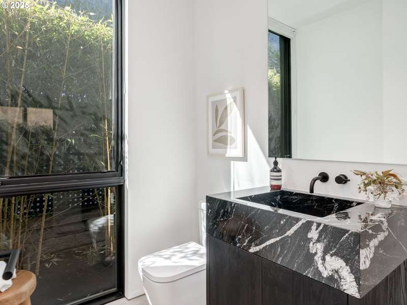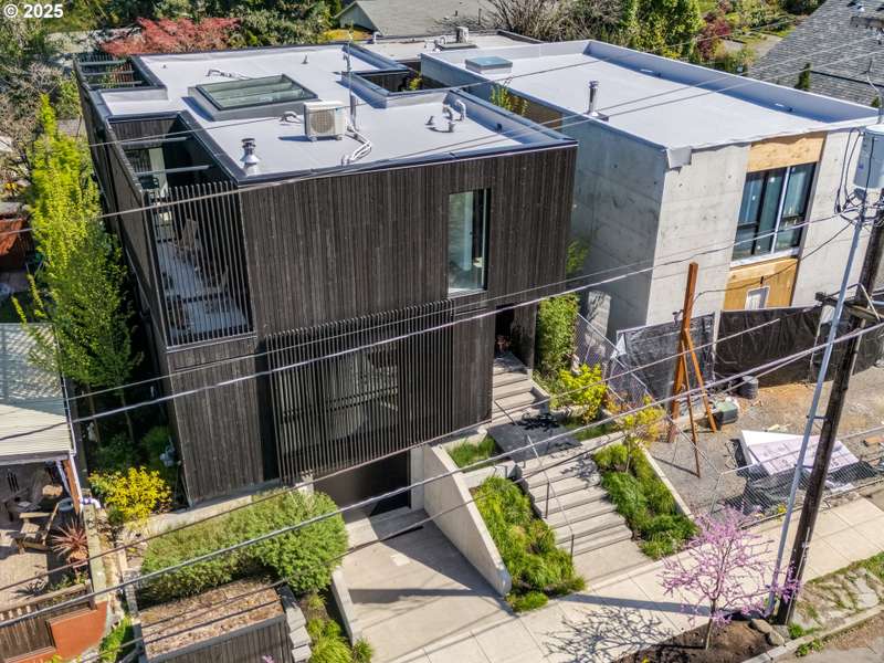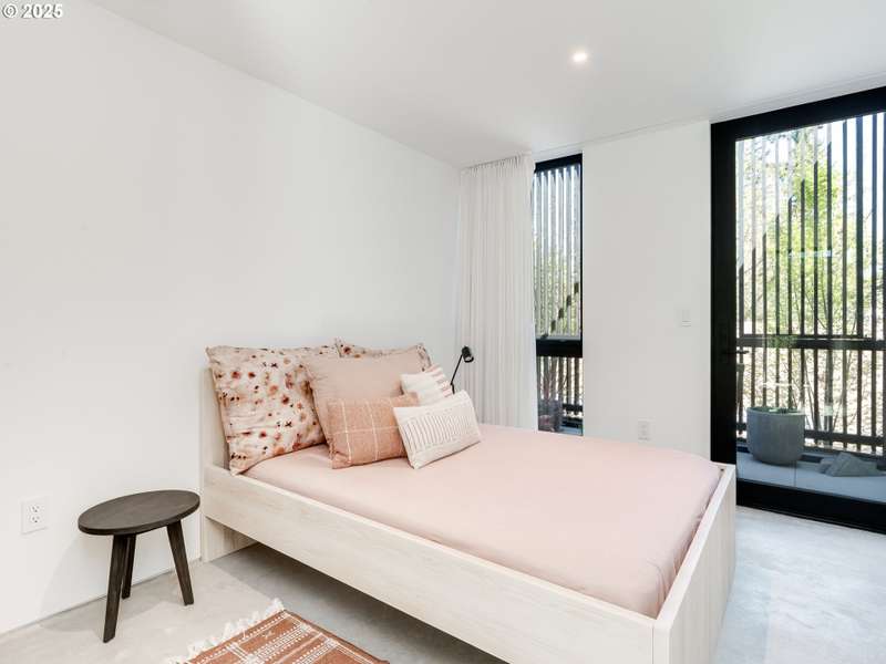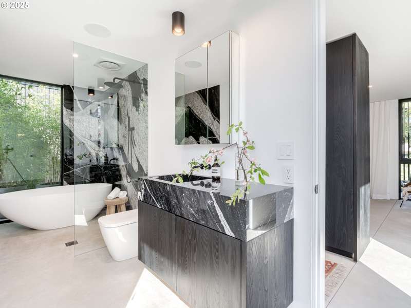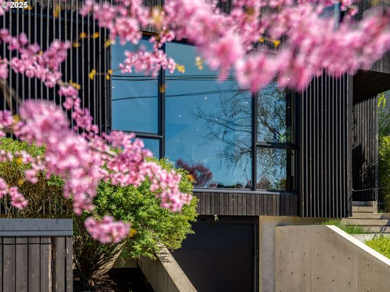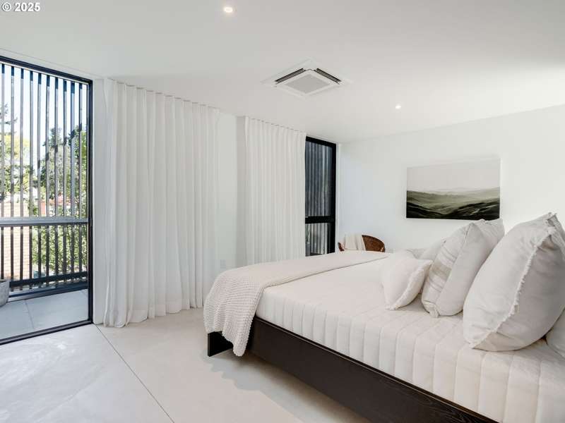 The Atrium House is a rare architectural gem in the heart of the Richmond neighborhood, just blocks off trendy Division St. This infill project by Capsule Development brings custom-quality design to the Eastside—where creativity, craftsmanship, and nature meet. This modern masterpiece features soaring ceilings, heated concrete floors, & a stunning three-story atrium. Anchoring the living space is a steel staircase, fabricated locally in Portland, spanning all 3 levels. The lower level boasts a cedar dry sauna paired with a custom steel cold plunge & shower, creating a private wellness retreat. Lush, curated greenery surrounds the space, enhancing the sense of calm & relaxation. On the main floor, the chef’s kitchen is equipped with high-end, built-in appliances from Bertazzoni and Fisher & Paykel. Throughout the home, the custom ash cabinetry was charred using traditional Japanese Shou Sugi Ban technique, offering enduring beauty and a refined timeless aesthetic. Luxury materials like Maori Brazilian granite slabs elevate the kitchen & baths. Just off the dining room, sliding doors open to the back patio for seamless entertaining. In the living room, a RAIS wood stove serves as both a cozy heat source and a striking sculptural centerpiece. One of the most distinctive features of the house is that it comes fully furnished, with pieces specifically crafted to reflect and elevate the home's modern, natural aesthetic. Upstairs, you’ll find all 3 bedrooms, a dedicated laundry area, and a guest bath. Each bedroom features its own balcony—perfect for enjoying fresh morning air or a relaxing evening breeze. Floor-to-ceiling windows flood the space with natural light, enhancing the open, airy feel throughout. Out front, rolling shutters add a dramatic architectural touch while offering both privacy and adjustable light control. A truly one-of-a-kind property that celebrates thoughtful design & modern living in one of Portland’s most sought-after neighborhoods. [Home Energy Score = 8. HES Report at https://rpt.greenbuildingregistry.com/hes/OR10191104]