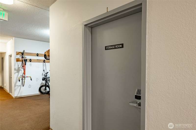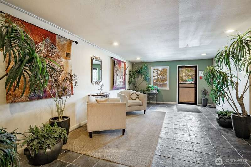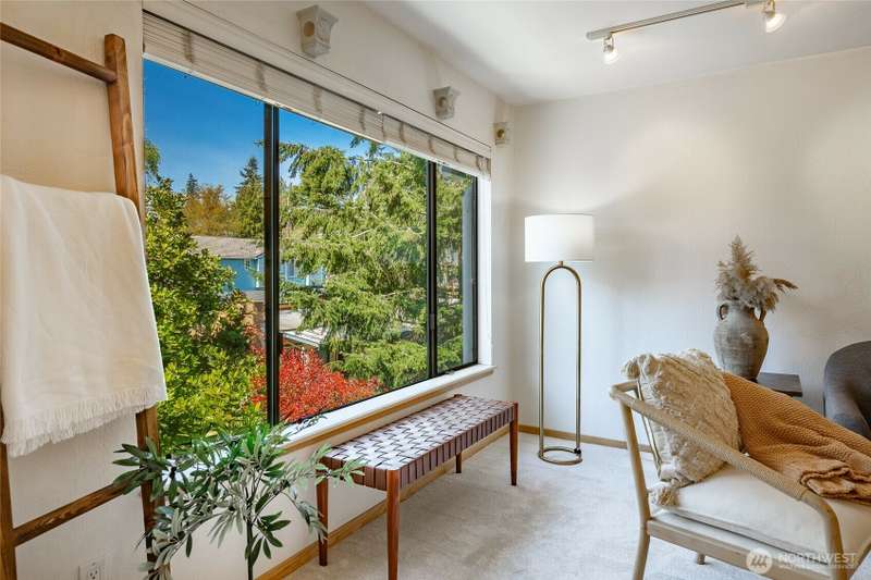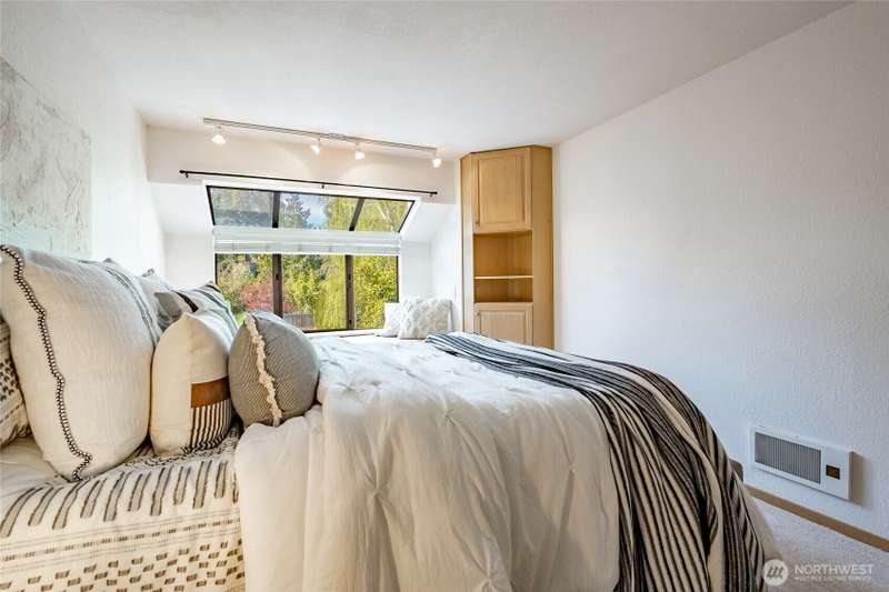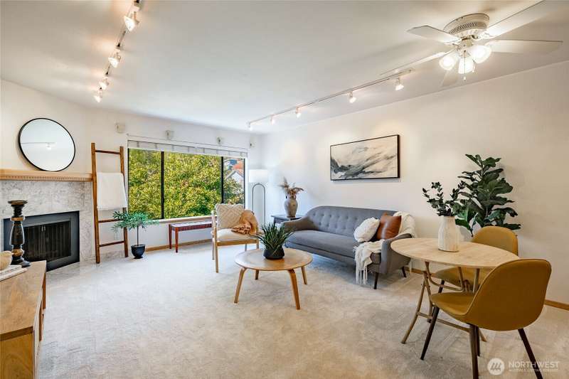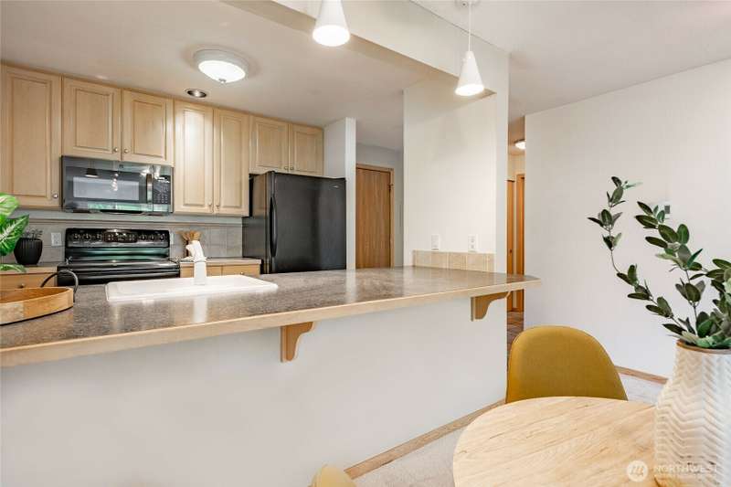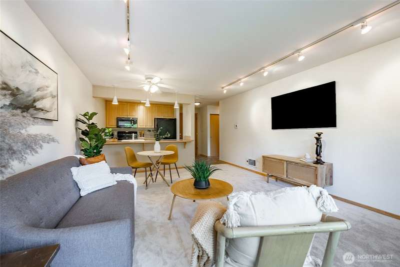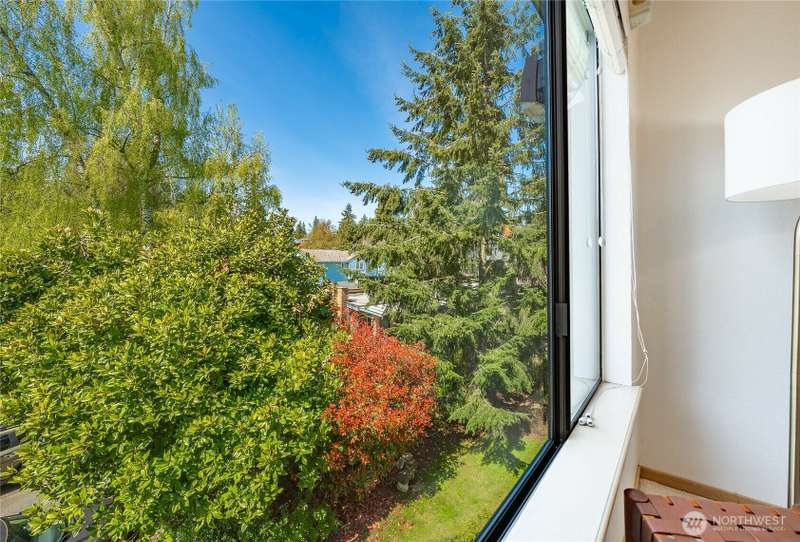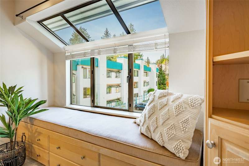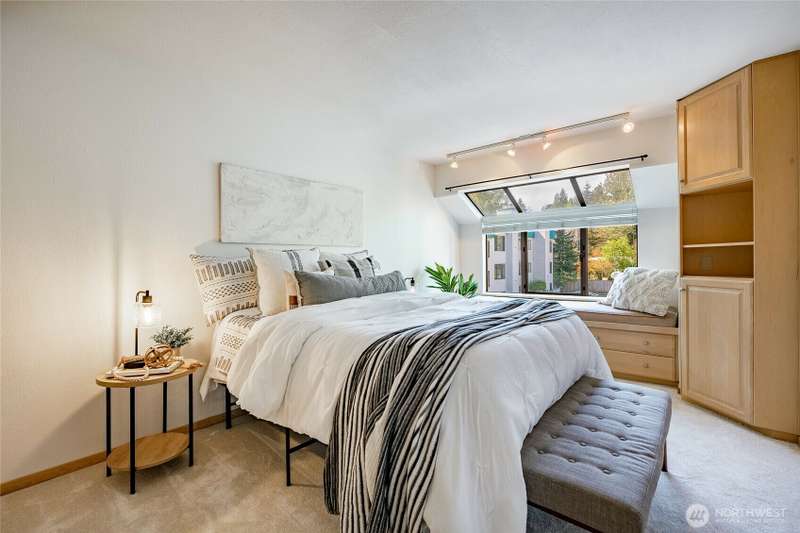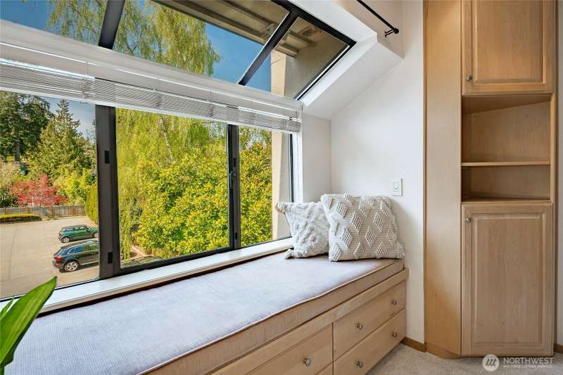 Discover this pristine TOP-FLOOR unit on the quiet side of the bldg, offering serene views overlooking the community park for utmost privacy. Ample storage, natural light & new carpeting in every rm. The kitchen opens to a spacious great rm, presenting seamless views of the DR & LR areas. Maple cabinetry in the kitchen, bthrm, and bdrm. The primary bdrm boasts exceptional storage solutions including a custom closet organizer and extensive built-ins. All appliances stay, in-unit W/D hookups, secure building entry, protected mailbox, private storage space, dedicated bike storage, & laundry rm. Prime location w/ easy access to dining & shops, Northgate, UW, I-5, bus lines, & light rail stations. Low-maintenance lifestyle. NO RENTAL CAP.