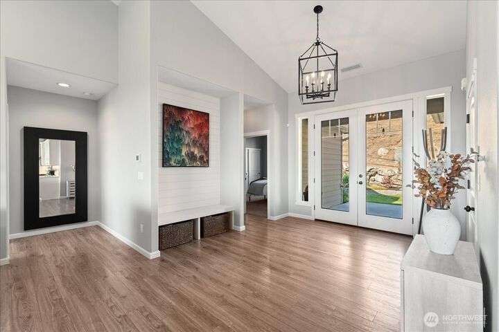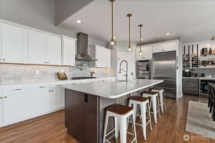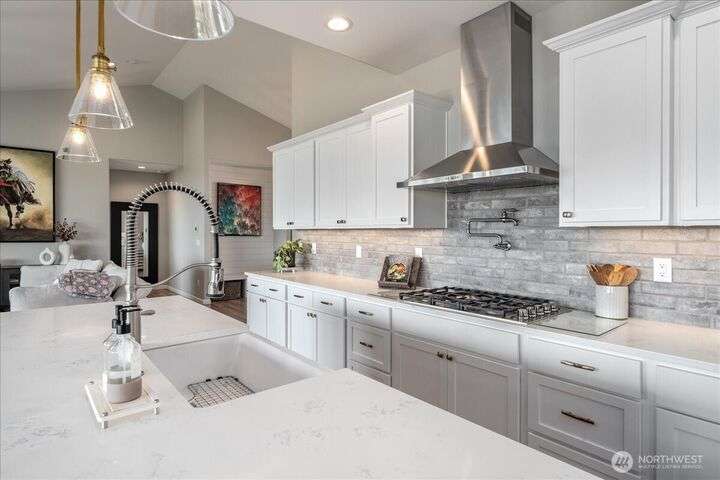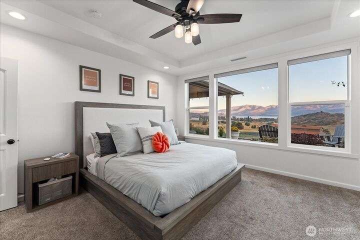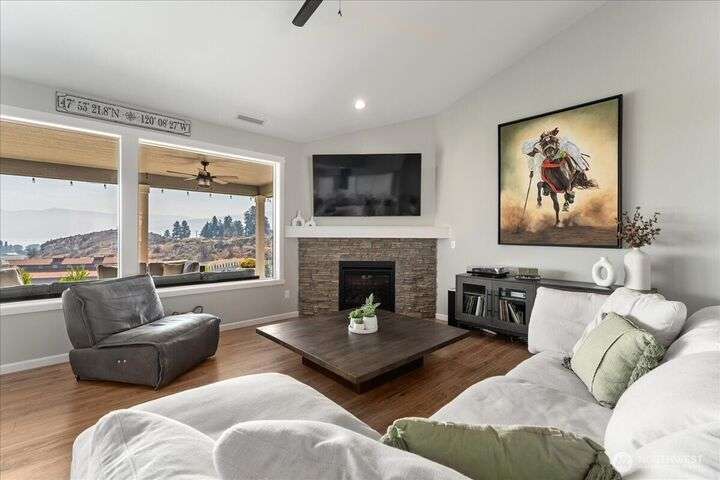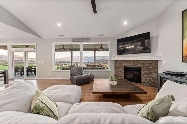 Enjoy sweeping views of Lake Chelan from this stunning 3bd/2bth 1,910sf rambler perfectly set on a 1.66 acre homesite. This home offers an open floor plan w/ abundant natural light & seamless indoor-outdoor living. The gourmet kitchen features quartz countertops, stainless steel appliances, spacious island & pantry. Entertaining is easy w/ the adjacent dining & living areas & a built-in bar. Sliding glass doors lead to a covered dining & lounge area, BBQ, fire pit & grassy lawn—all with panoramic lake views. The spacious primary suite features a walk-in closet & spa-like bath + 2 bedrooms & a den. The 3-car garage & RV Parking w/ hookups offer room for vehicles & lake toys. All just steps from Manson’s many shops, restaurants & wineries.