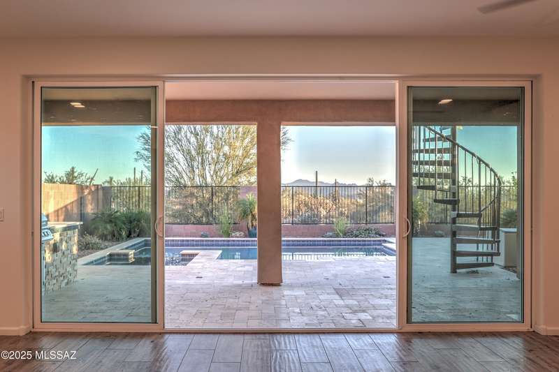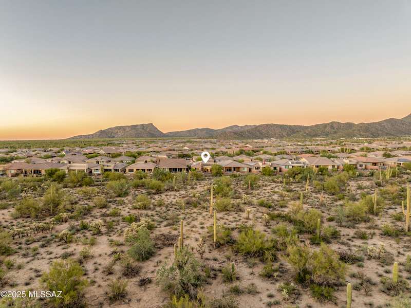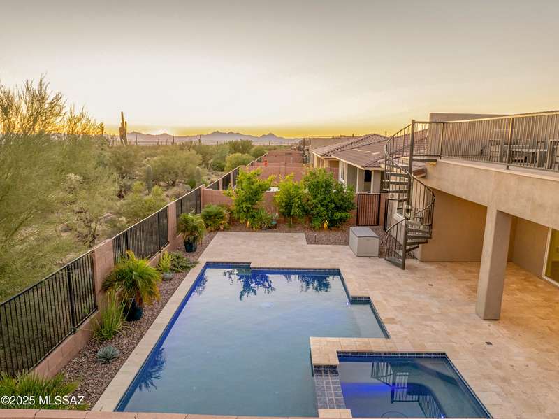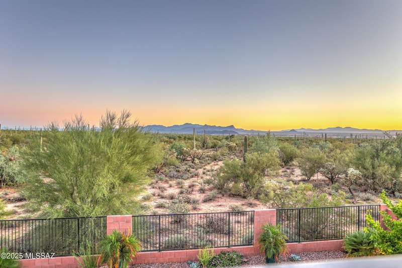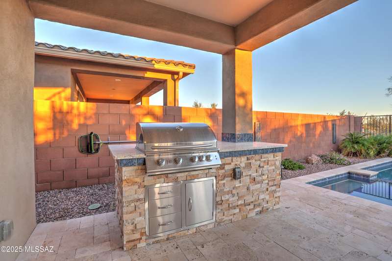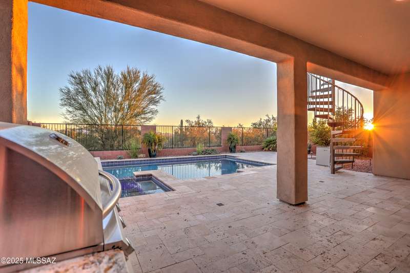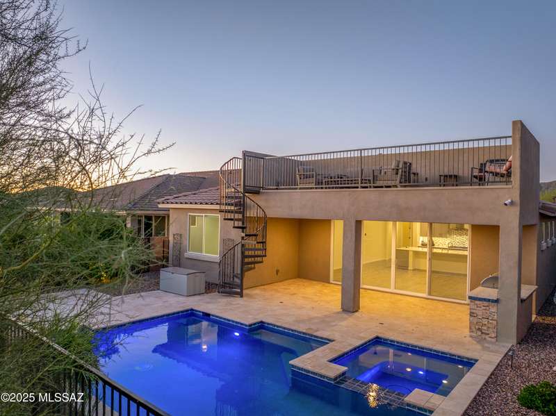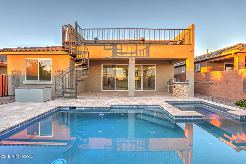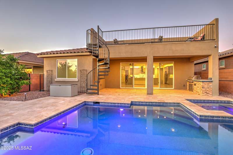 Presenting serene desert living in this exceptional home in the gated community of Blue Agave in Dove Mountain. An inviting open-concept layout showcases an oversized island flowing seamlessly into the great room, where 16-ft sliding glass doors blur the line between indoor and outdoor living. The primary suite offers a spa-like bath with an upgraded walk-in shower and a generous custom closet. A split floor plan provides guest privacy, while a den with glass doors creates the ideal home office or flex space. Step outside to your private backyard backing to a natural preserve, featuring a covered patio, sparkling pool and spa, built-in BBQ, citrus trees, and a winding staircase leading to an elevated sun deck with panoramic mountain and desert views.