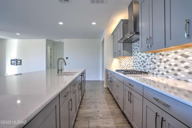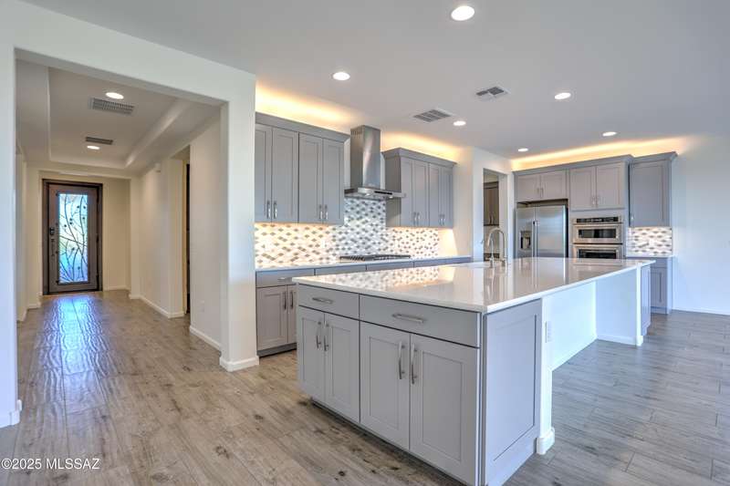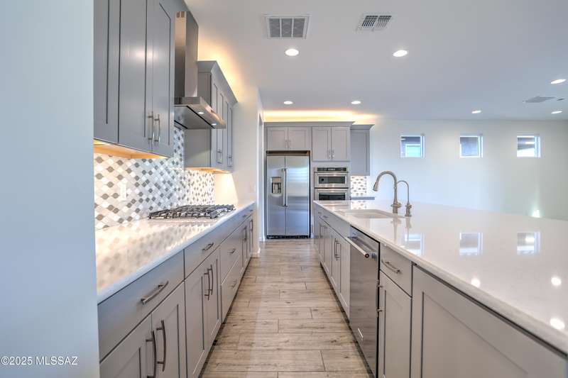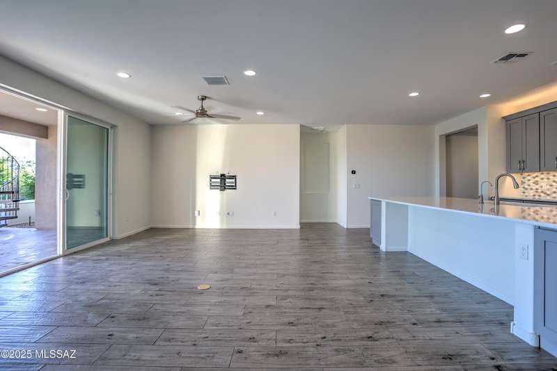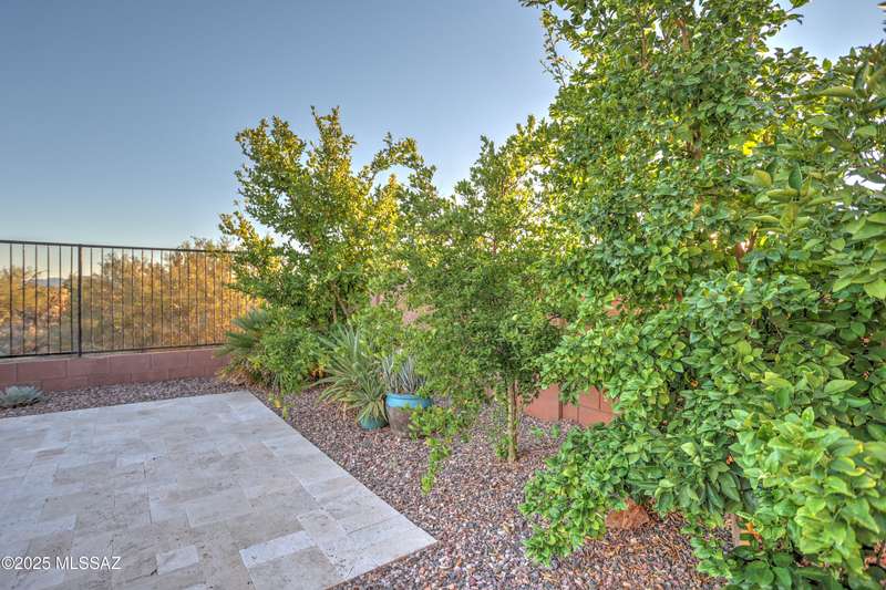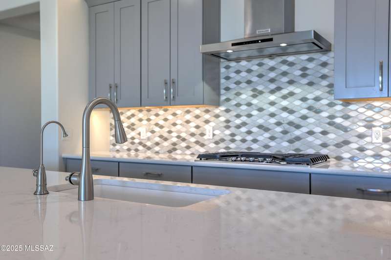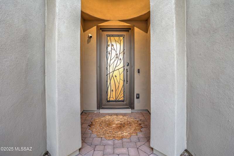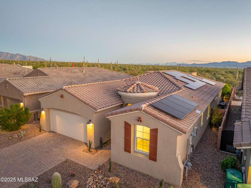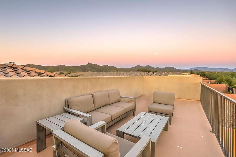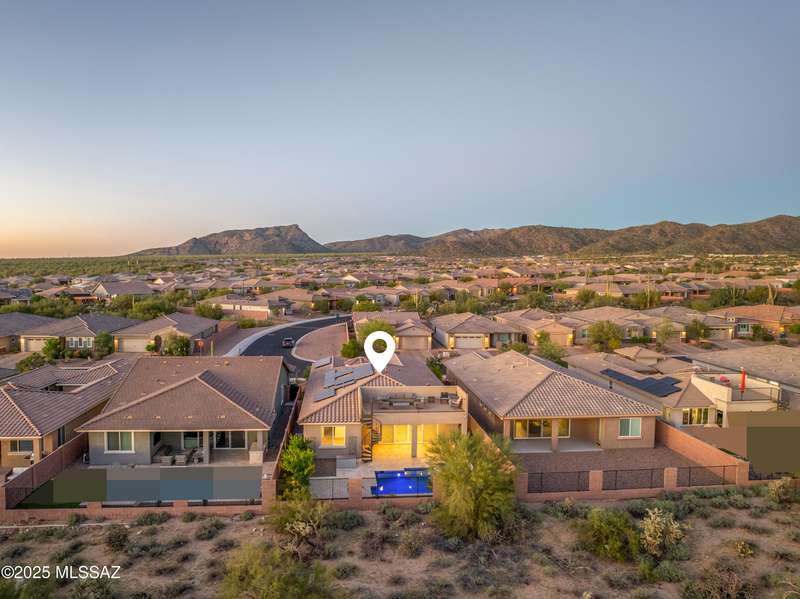 Presenting serene desert living in this exceptional home in the gated community of Blue Agave in Dove Mountain. An inviting open-concept layout showcases an oversized island flowing seamlessly into the great room, where 16-ft sliding glass doors blur the line between indoor and outdoor living. The primary suite offers a spa-like bath with an upgraded walk-in shower and a generous custom closet. A split floor plan provides guest privacy, while a den with glass doors creates the ideal home office or flex space. Step outside to your private backyard backing to a natural preserve, featuring a covered patio, sparkling pool and spa, built-in BBQ, citrus trees, and a winding staircase leading to an elevated sun deck with panoramic mountain and desert views.
