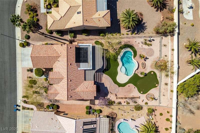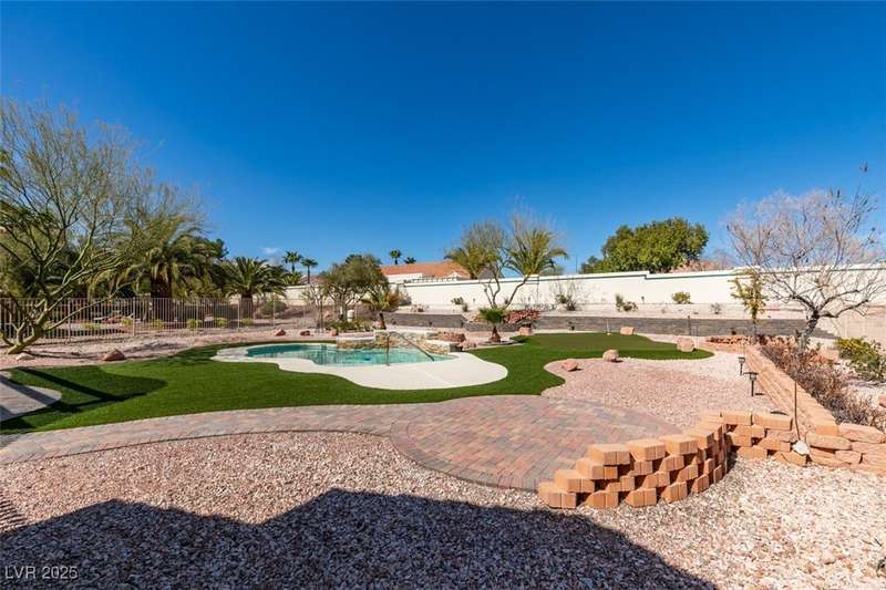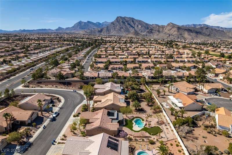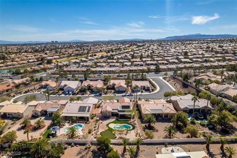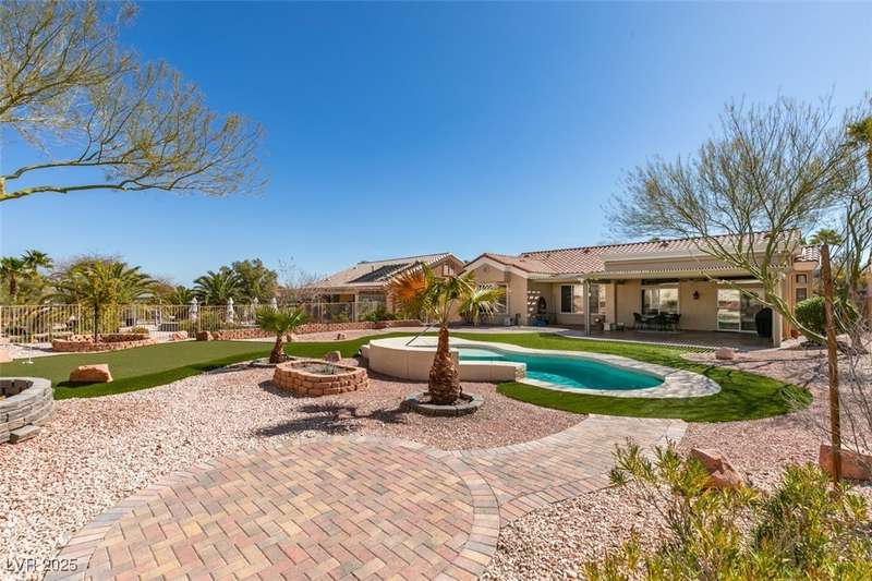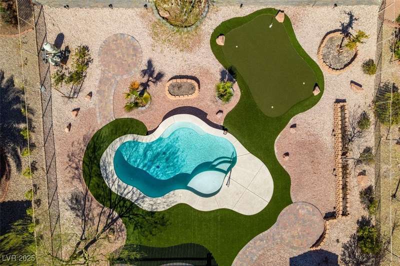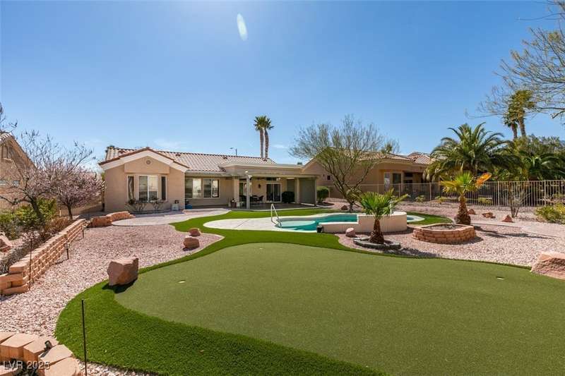 Nestled in a quiet cul-de-sac in Sun City Summerlin, this home sits on an expansive 11,000+ sqft lot with exceptional curb appeal. The entertainer's backyard features a saltwater pool with solar heating, in-floor cleaners, a putting green, and a spacious patio cover, perfect for relaxing or entertaining. Inside, the gourmet kitchen is a chef’s dream with granite countertops and a large breakfast bar. The open floor plan connects the kitchen to the family room, creating a spacious and inviting atmosphere. A separate dining area adds elegance to the space. The home offers two spacious bedrooms, two bathrooms, including an updated primary bath with modern finishes. Just off the kitchen, you'll find a versatile space ideal for crafting, extra storage, or a pantry. The two-car garage is equipped with built-in cabinets, overhead storage racks, and room for a golf cart. Sun City Summerlin is a premier 55+ active community offering world-class golf, top amenities, and a variety of activities.