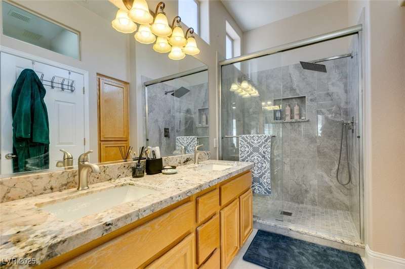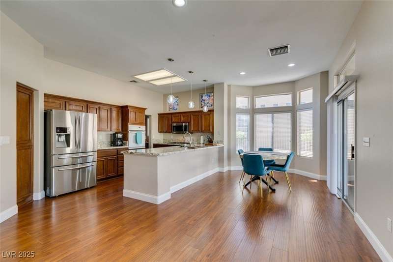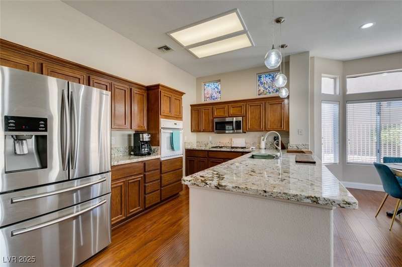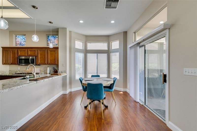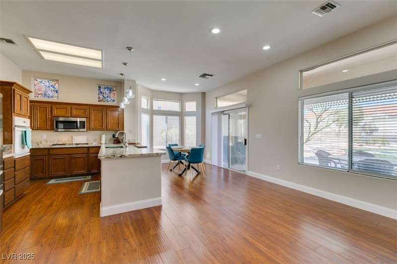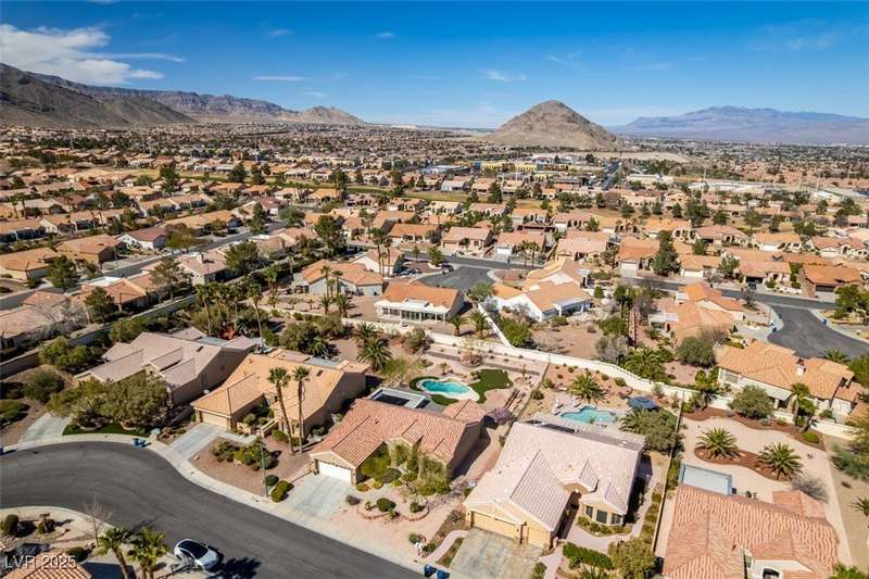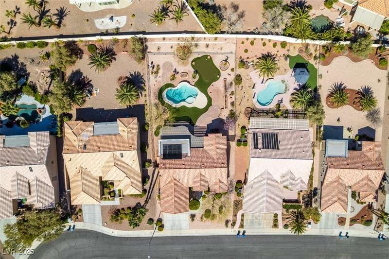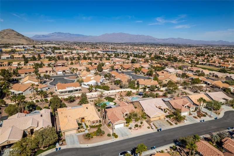 Nestled in a quiet cul-de-sac in Sun City Summerlin, this home sits on an expansive 11,000+ sqft lot with exceptional curb appeal. The entertainer's backyard features a saltwater pool with solar heating, in-floor cleaners, a putting green, and a spacious patio cover, perfect for relaxing or entertaining. Inside, the gourmet kitchen is a chef’s dream with granite countertops and a large breakfast bar. The open floor plan connects the kitchen to the family room, creating a spacious and inviting atmosphere. A separate dining area adds elegance to the space. The home offers two spacious bedrooms, two bathrooms, including an updated primary bath with modern finishes. Just off the kitchen, you'll find a versatile space ideal for crafting, extra storage, or a pantry. The two-car garage is equipped with built-in cabinets, overhead storage racks, and room for a golf cart. Sun City Summerlin is a premier 55+ active community offering world-class golf, top amenities, and a variety of activities.