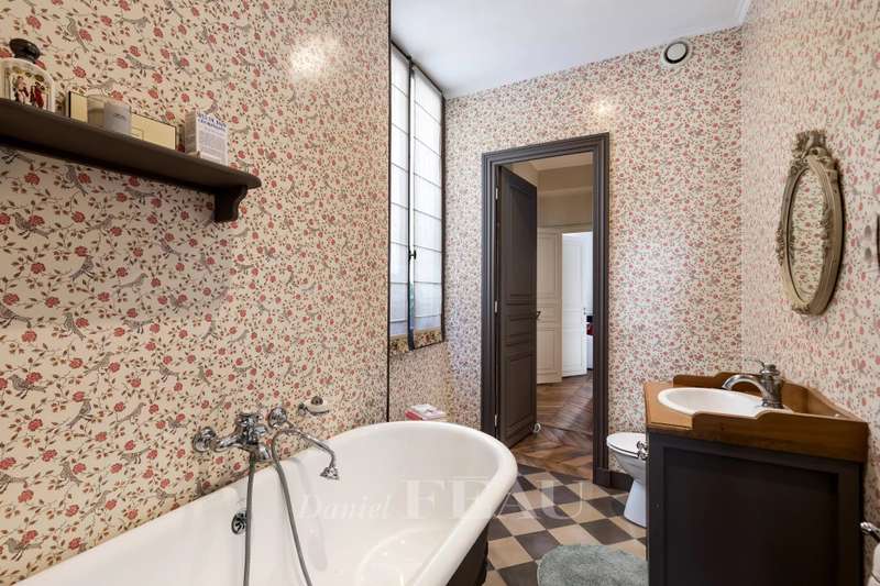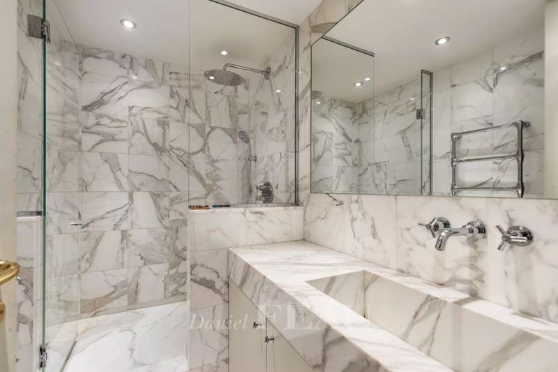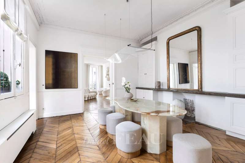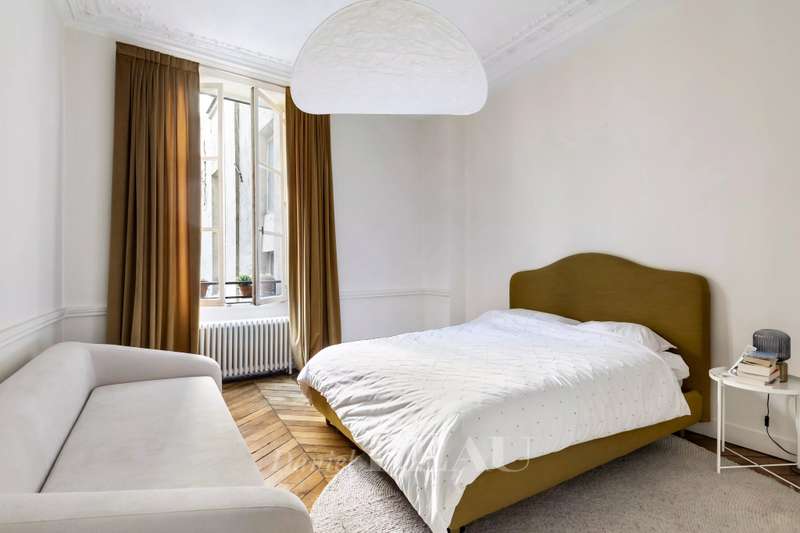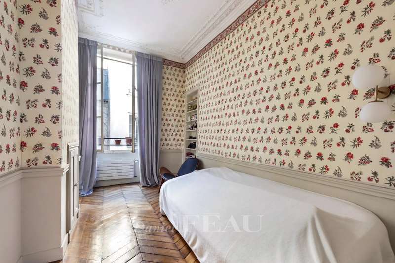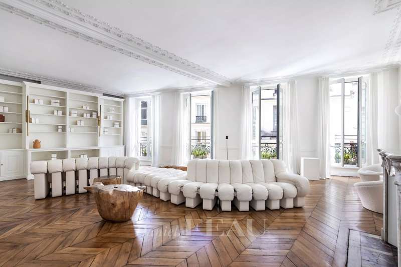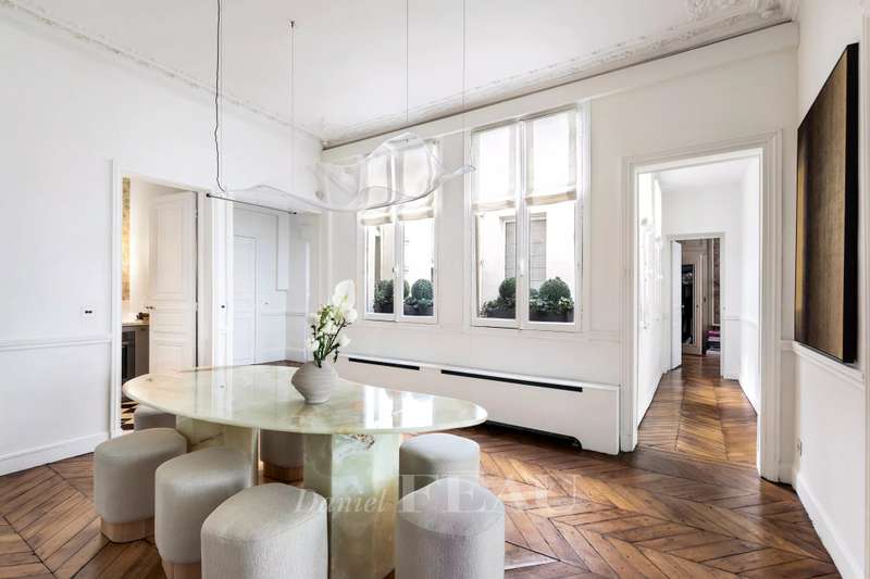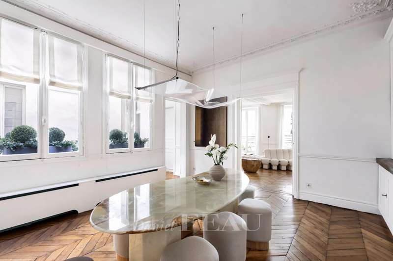 Saint-Germain-des-Prés. This east and west facing apartment benefiting from an excellent floor plan and in mint condition is on the 2nd floor of a fine 18th century building. Featuring 3.15 metre-high ceilings, it offers 160 sqm of living space as defined by the Carrez Law including a double living/reception room, a dining room, an equipped kitchen, two bedrooms, a study, a dressing room, a bathroom, a shower room and a utility room. The study could create a third bedroom if required. The apartment has been meticulously renovated throughout while preserving and highlighting period features including parquet flooring, a fireplace, mouldings and interior shutters. With a cellar.