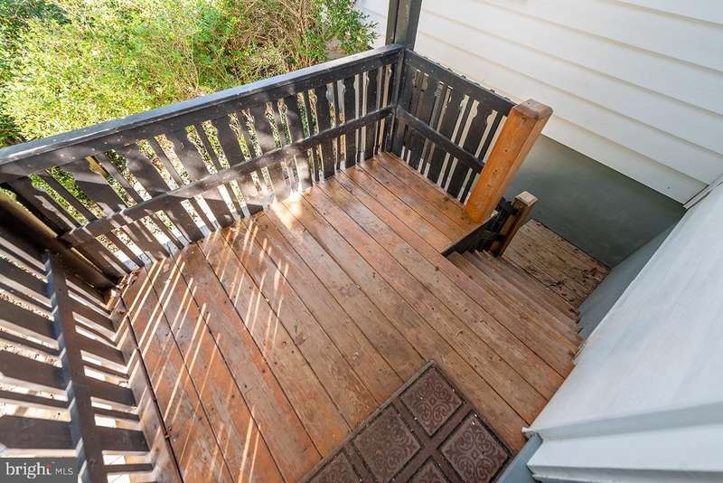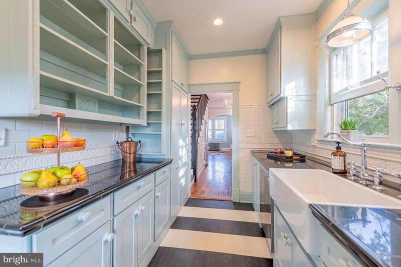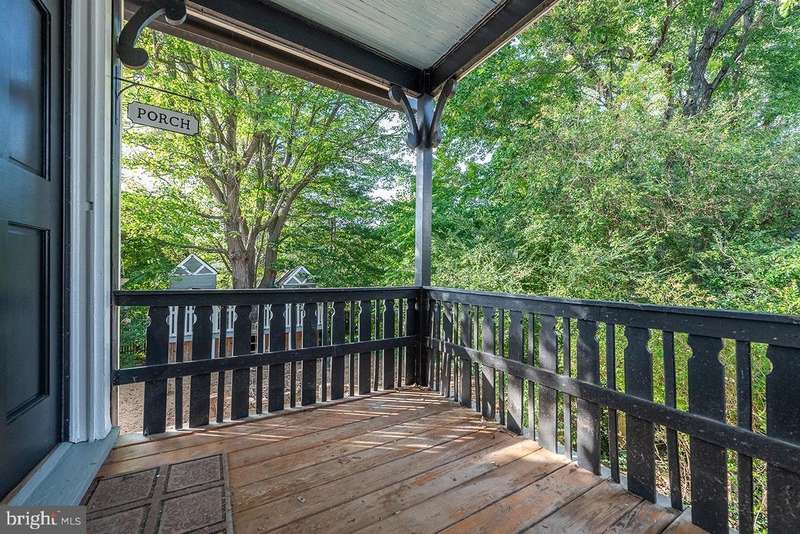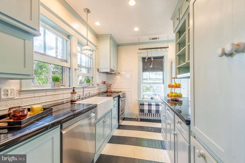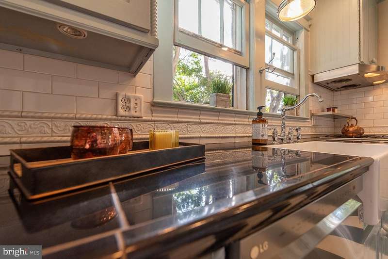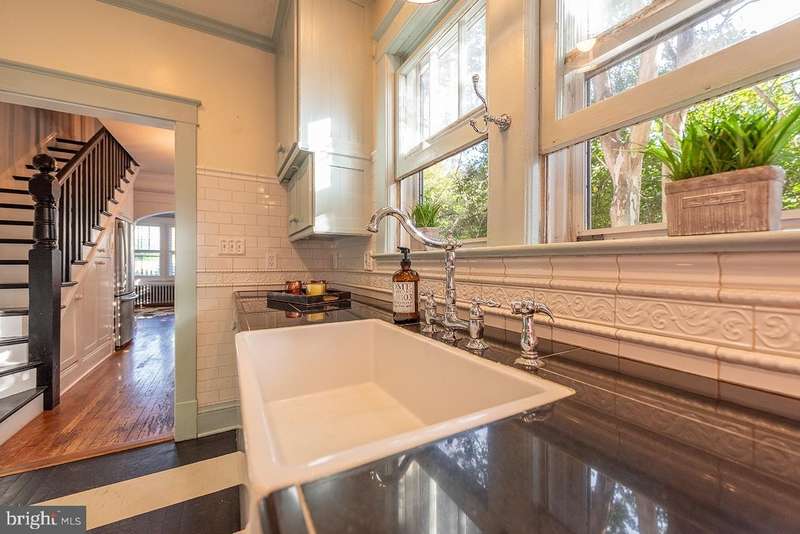 The galley kitchen has tile counters, farmhouse sink and custom cabinetry. A small covered porch off the kitchen is perfect for reading or bird watching.