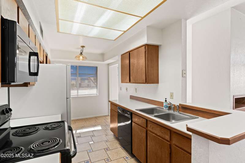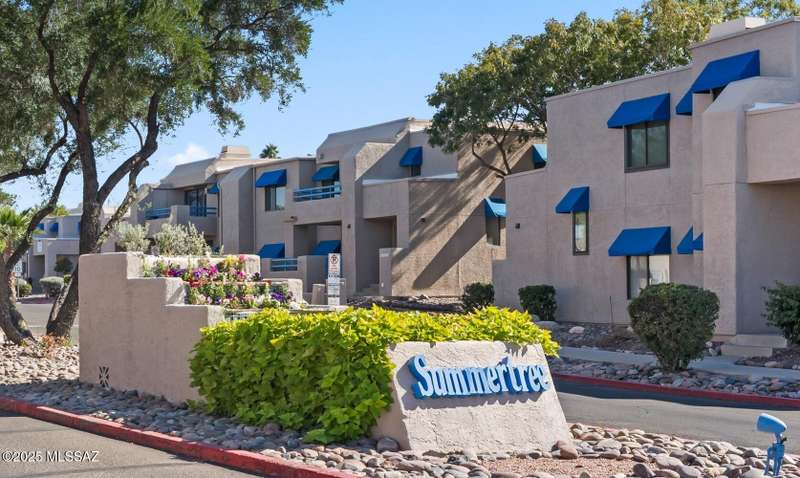 Move-in ready first-floor condo in Summertree with no steps & easy access to the west pool. Fresh paint, new bedroom carpet, ceramic tile/ laminate in main living areas, new mini blinds on all windows, new over-range microwave, and an in-unit stacked washer/dryer that conveys. Water heater replaced 4/2025 & refrigerator replaced 5/2025. HOA covers water, sewer, trash, security, termite service, roof, & exterior maintenance. Community features two pools and hot tubs, close to shopping and dining along Pantano, Speedway, and Broadway. Welcome Home!