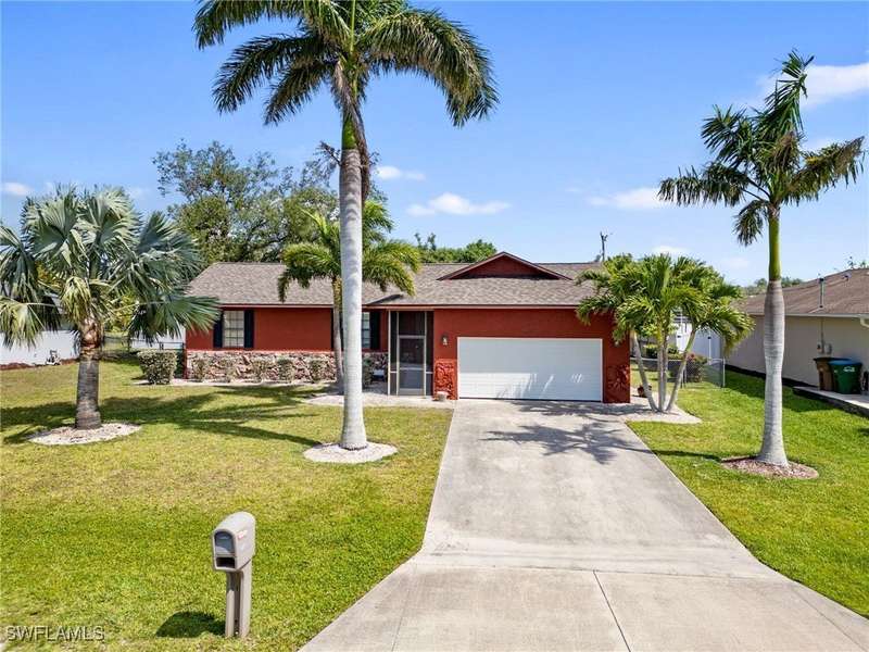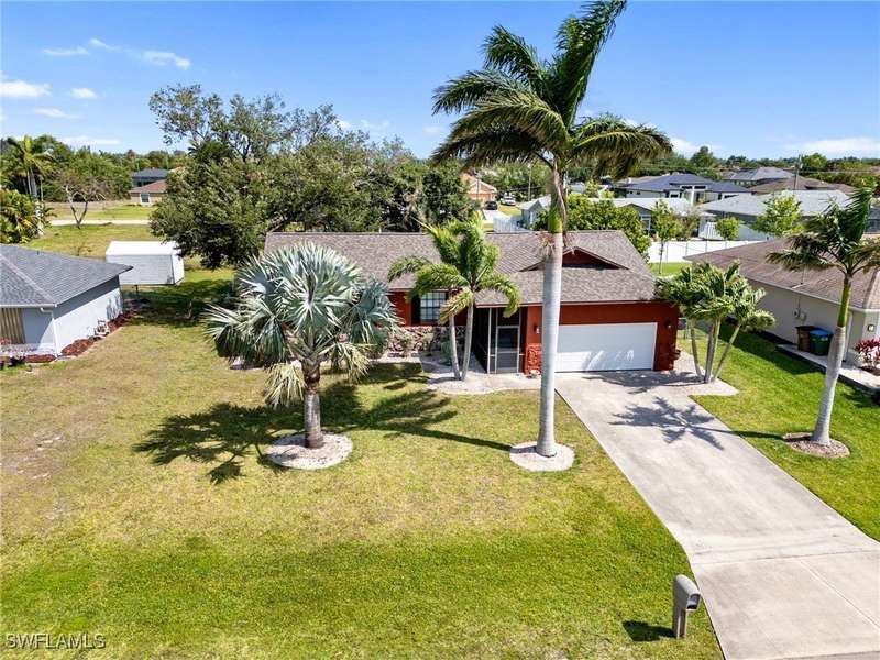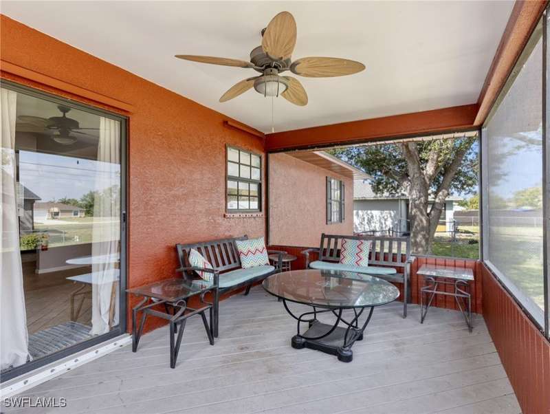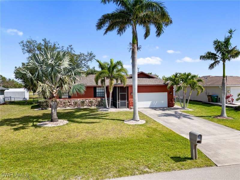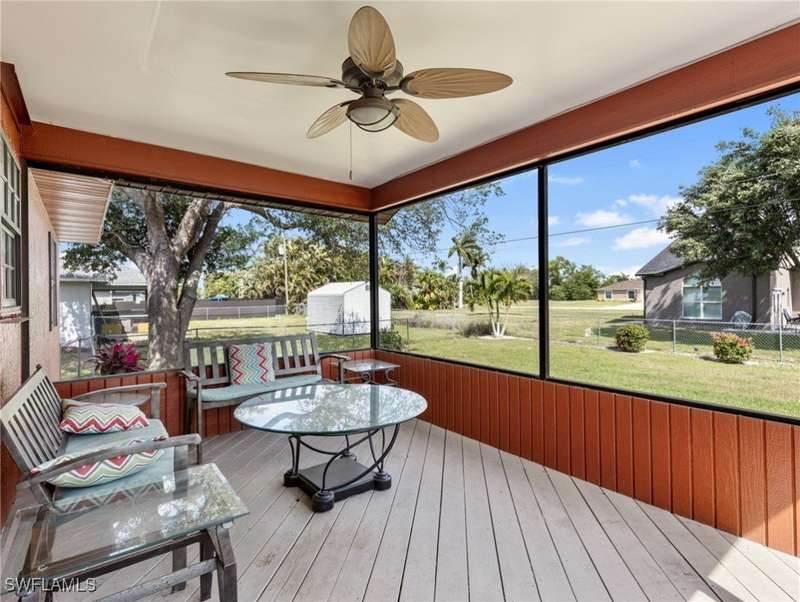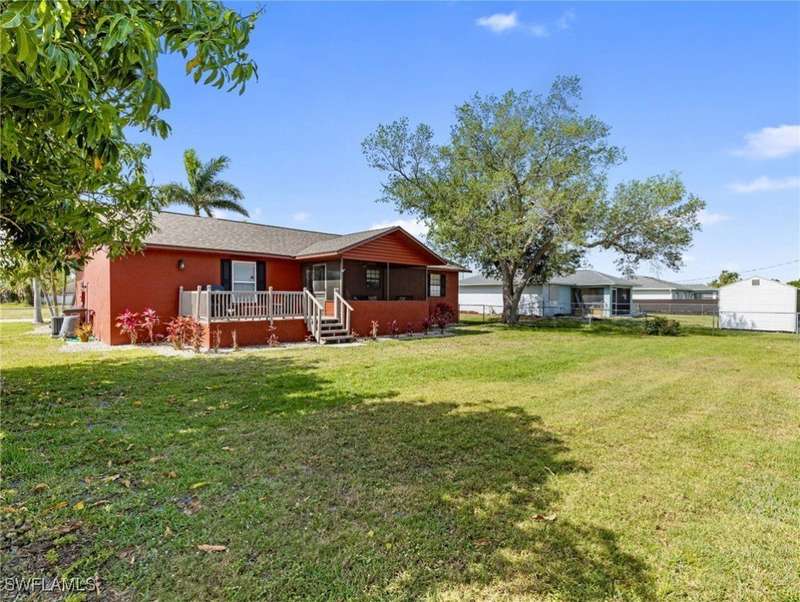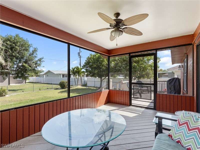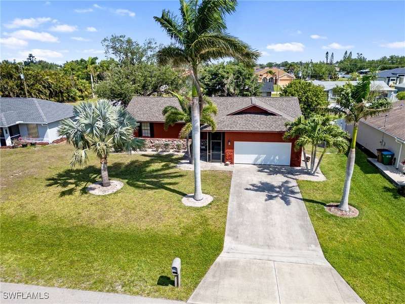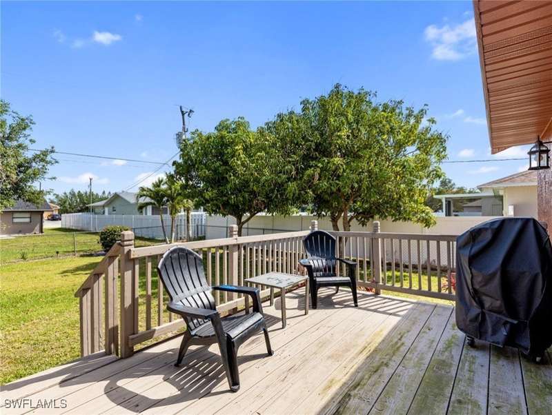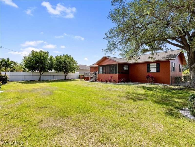 Now is your chance to own a great home in Cape Coral. The current owners used this as a seasonal retreat plus generated rental income when not in the home. Sold Turnkey, this 3 bedroom 2 bath home has tile that flows throughout. Split bedrooms for privacy, plus the primary suite has a seperate owners closet should you choose to treat as an investment rental. Large kitchen with new refrigerator and dishwasher, plus two Maple and Oak bar top sitting areas to gather the family. Expansive fenced backyard with Oak Trees, Triple Palms, Mango Trees, and lush landscaping. Plus, there is a screened porch and elevated sitting deck. Roof is 2023, AC 2024, Garage Door 2025. Assessments are paid in full - city water and sewer! Room for pool. You are now HOME!