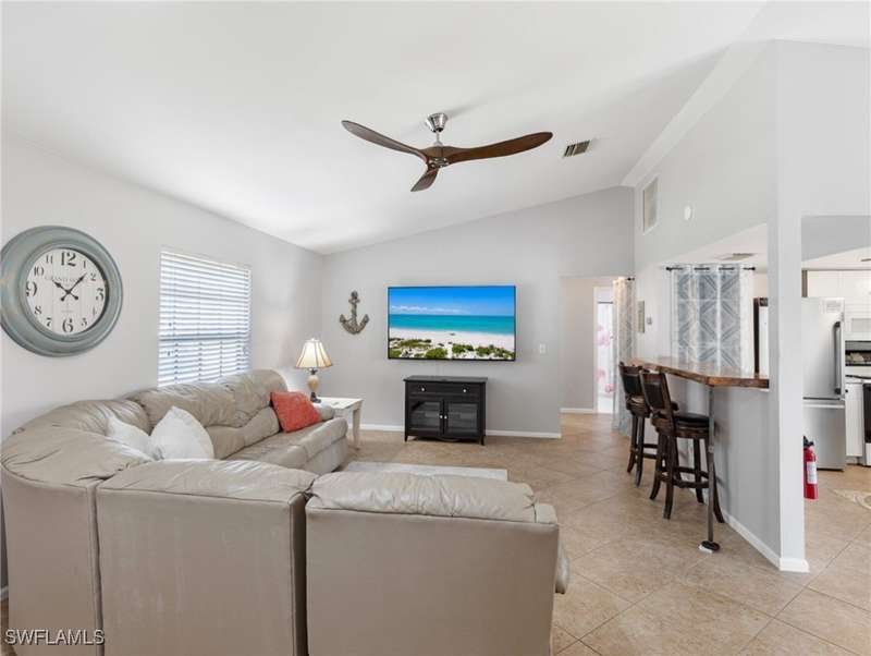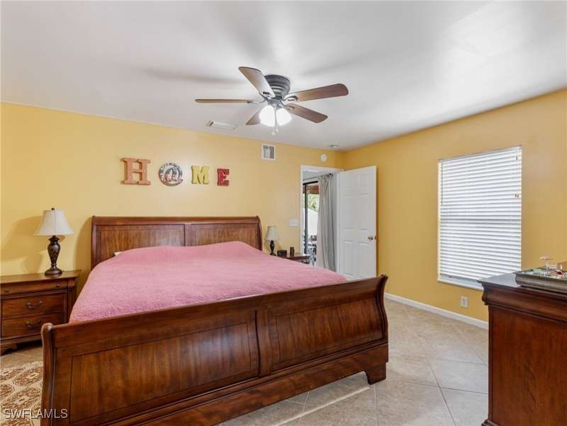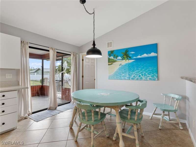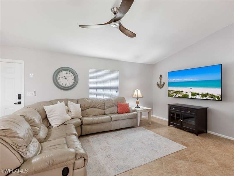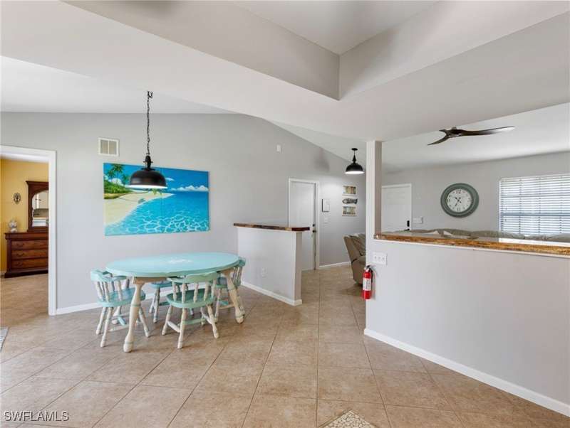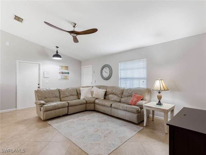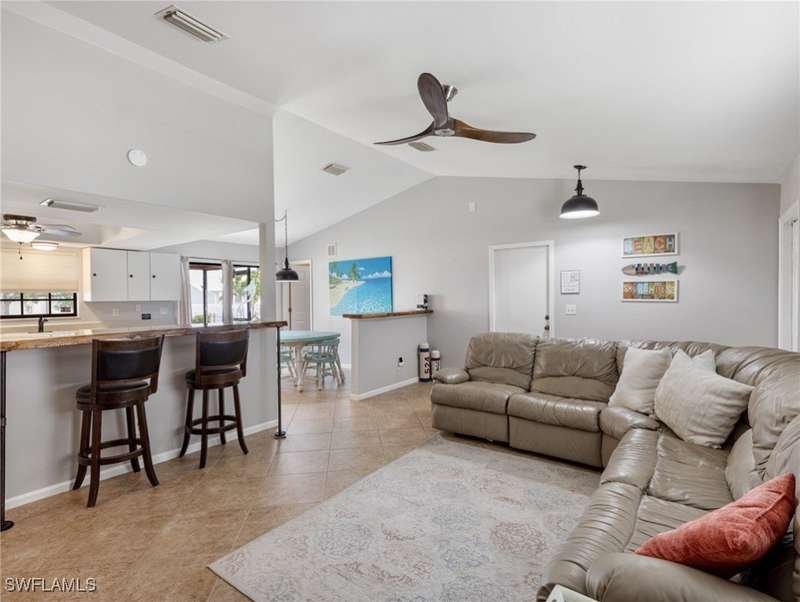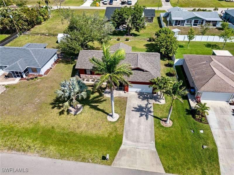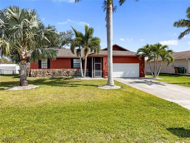 Now is your chance to own a great home in Cape Coral. The current owners used this as a seasonal retreat plus generated rental income when not in the home. Sold Turnkey, this 3 bedroom 2 bath home has tile that flows throughout. Split bedrooms for privacy, plus the primary suite has a seperate owners closet should you choose to treat as an investment rental. Large kitchen with new refrigerator and dishwasher, plus two Maple and Oak bar top sitting areas to gather the family. Expansive fenced backyard with Oak Trees, Triple Palms, Mango Trees, and lush landscaping. Plus, there is a screened porch and elevated sitting deck. Roof is 2023, AC 2024, Garage Door 2025. Assessments are paid in full - city water and sewer! Room for pool. You are now HOME!
