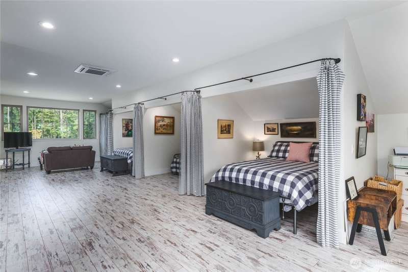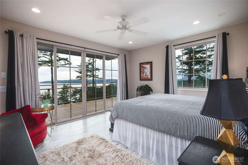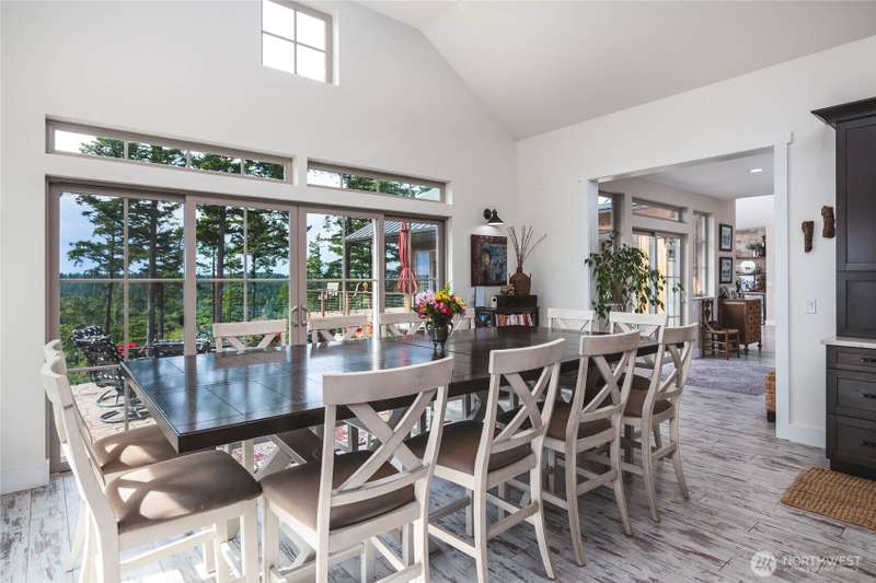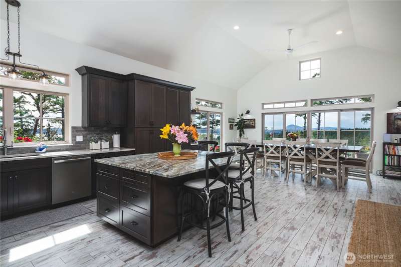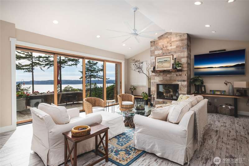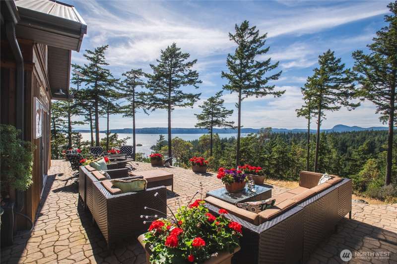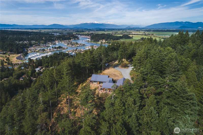 Secluded paradise situated at the top of Eagles Nest. At 5.85 acres, this magnificent property boasts almost a 360° view of the surrounding area. Water, mountain, island and valley views as far as the eye can see. Home features a spacious main level primary suite with a fabulous walk-in closet, as well as upper separate living quarters with living room, office area, 4 bed sleeping nooks, kitchenette, washer/dryer and 3/4 bath. Spacious kitchen/dining area is a chef's delight. Living room features a fireplace, wet bar and gaming area. Views from every room in the home! Outdoor firepit/picnic area with view! Subdividable into 2 lots, utilities in place. Room for a helipad! Be sure to view the video! This home is truly one of a kind!