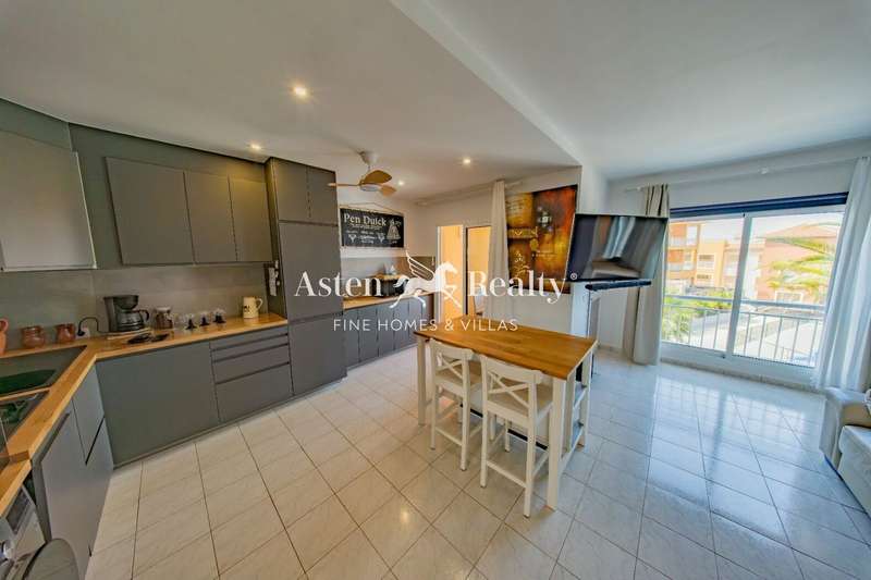 The heart of the apartment is a bright, spacious kitchen open to the living room, creating an open and functional living space. From both rooms, you can access a 7 m2 terrace with views of the pools and partial sea views.