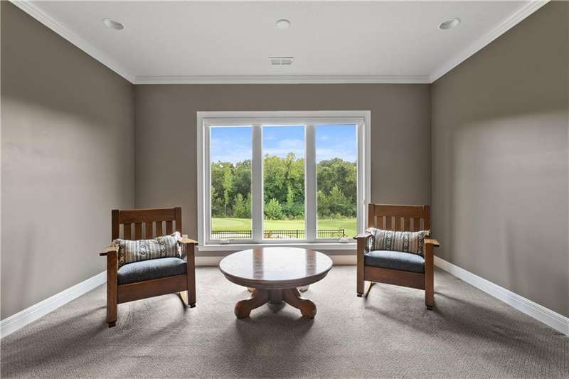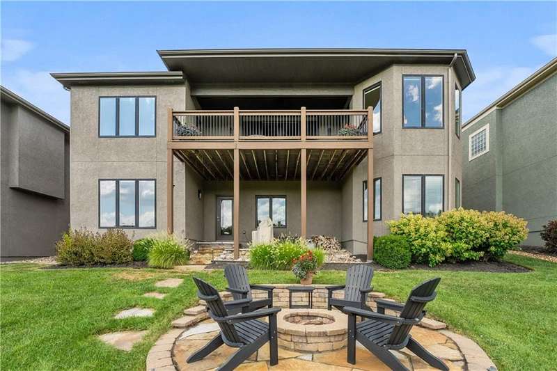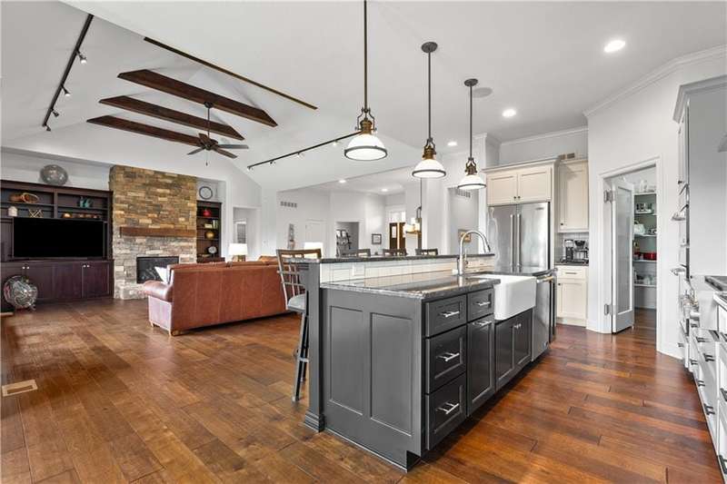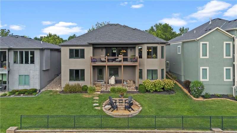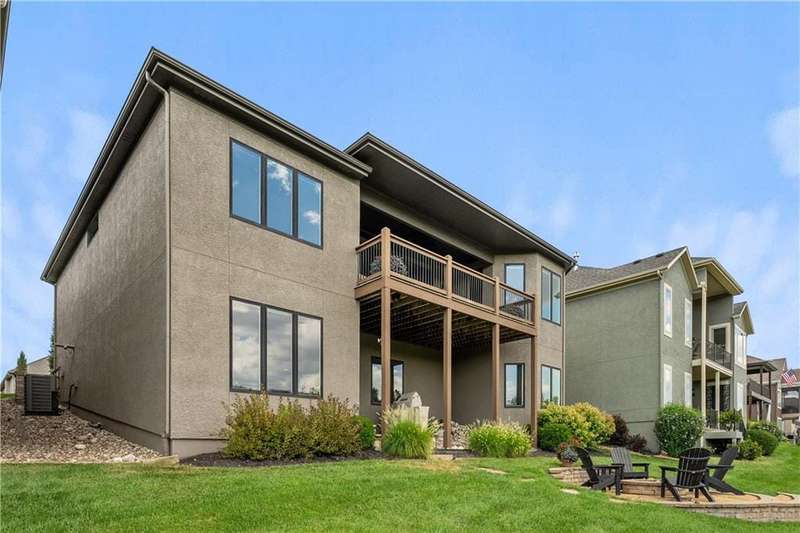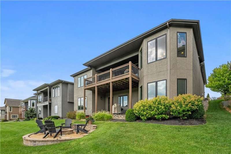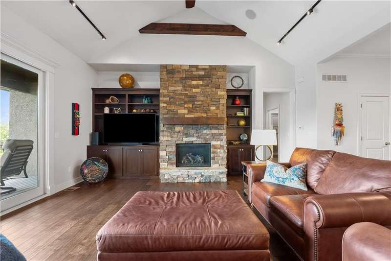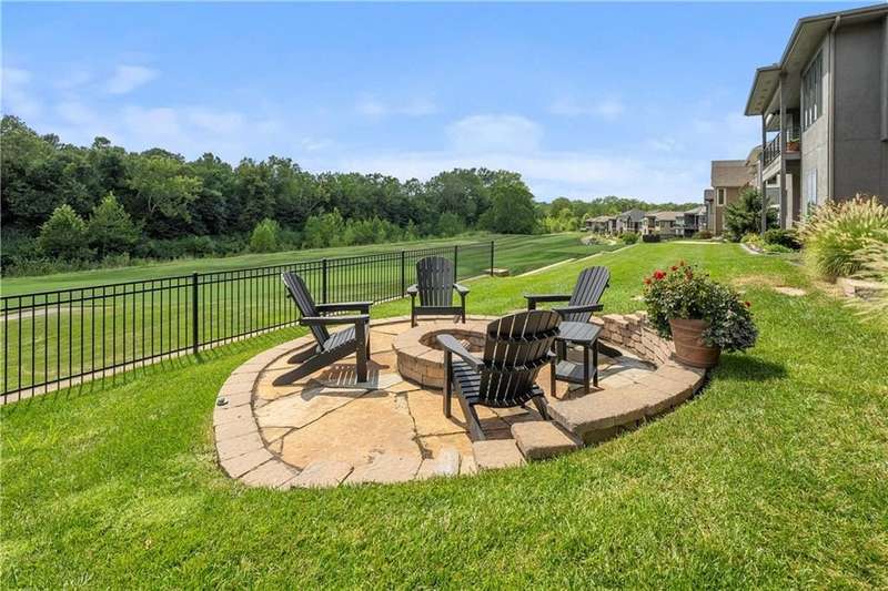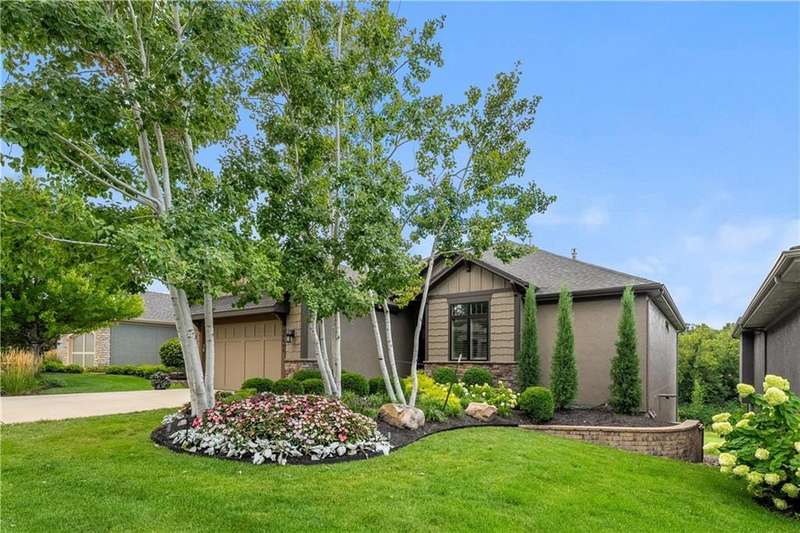 Rare gem in highly desired Cottonwood Canyon! Experience luxury living at its finest in this stunning reverse 1.5-story backing to the 15th green of Canyon Farms Golf Course, where every window frames panoramic views of rolling fairways and lush greens.From the moment you step inside, the vaulted great room steals the show with striking wood-beam ceilings, a dramatic stone fireplace, designer lighting, and custom built-ins. Wide-plank hardwoods flow seamlessly into the large dining area and chefs dream kitchencomplete with an oversized granite island, Jenn Air stainless steel appliances, Zephyr hood, U-Line wine fridge, custom cabinetry, and enviable walk-in pantry. A paned-glass door opens to a private office with plantation shutters, perfect for working in style.The expansive wall of Marvin windows and sliding glass doors bring the outdoors in, leading to a covered deck with golf course views and dual access to the private primary suite. This retreat offers spa-like luxury with a soaking tub, huge walk-in shower, dual vanities, and a spacious walk-in closet with direct access to laundry.The walk-out lower level is an entertainers paradise. Host game nights or cozy gatherings in the rec room with wet bar, beverage fridge, and microwave. Step outside to the flagstone patio with built-in grill pad and fire pit to take in the spectacular southern-exposure sunsets. Two additional bedrooms, a full bath with walk-in shower, half-bath for guests, and abundant storage round out this level.Every detail has been thoughtfully curated: Hunter Douglas remote-controlled shades, a retractable deck screen, built-in sound wiring, upgraded alarm system, and extensive landscaping with stone accents and lighting that add curb appeal galore. Unbeatable location, minutes to Lenexa City Center, Mill Creek trails, Shawnee Mission Park, and easy highway access + 35 minutes to the airport. Dont miss this rare opportunity to own a luxury home with unmatched golf course views!
