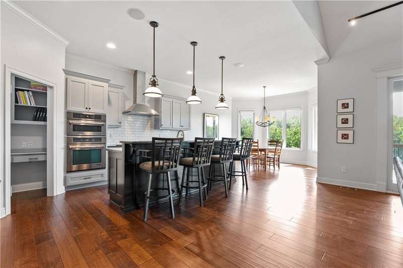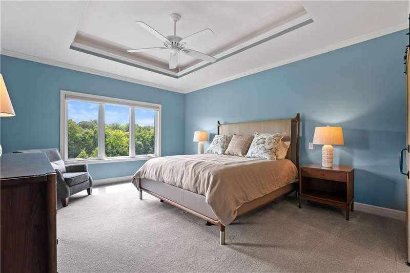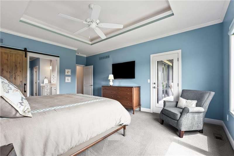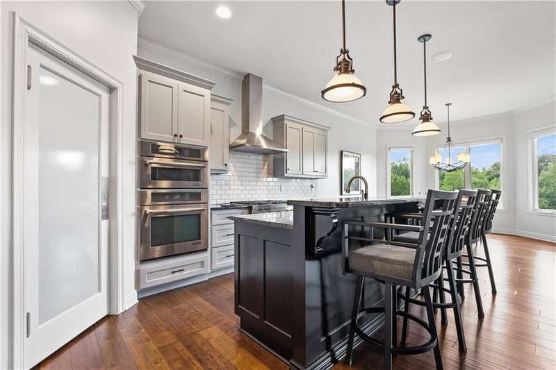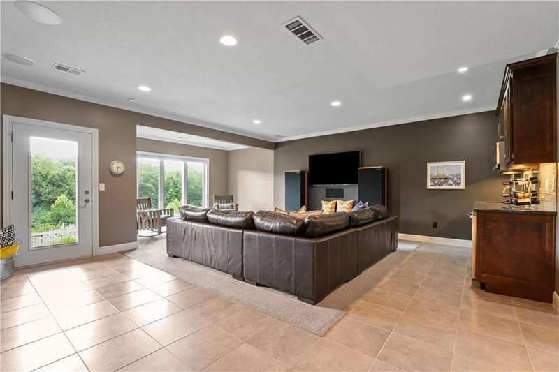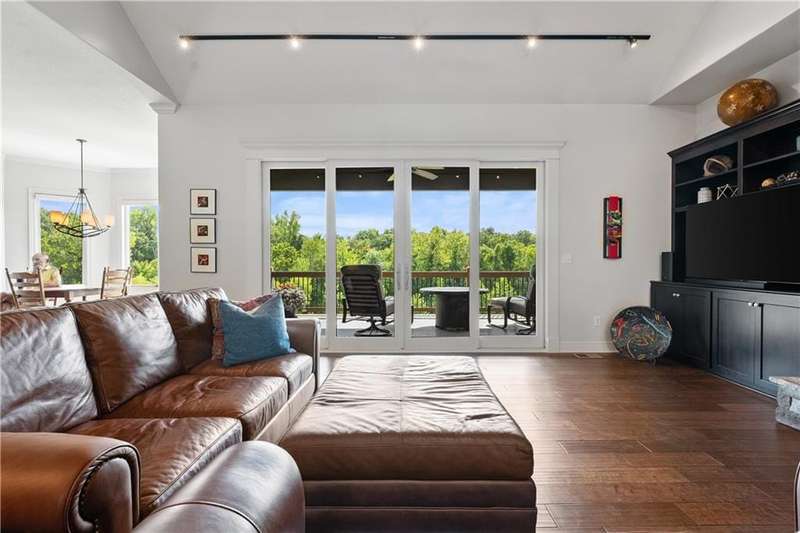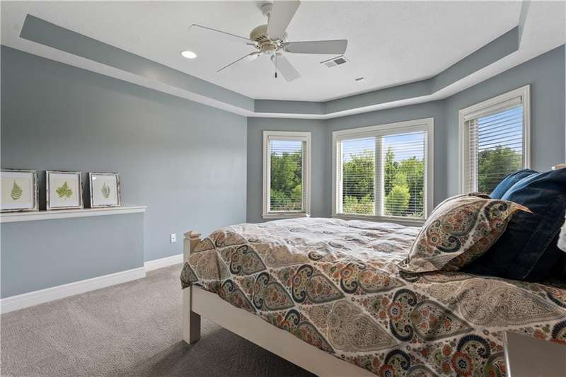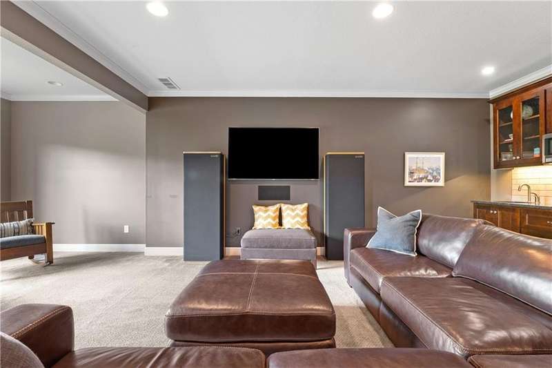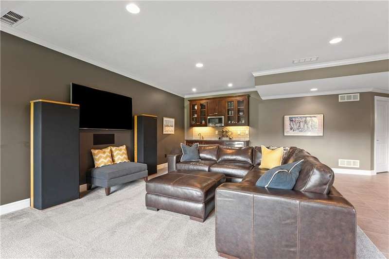Rare gem in highly desired Cottonwood Canyon! Experience luxury living at its finest in this stunning reverse 1.5-story backing to the 15th green of Canyon Farms Golf Course, where every window frames panoramic views of rolling fairways and lush greens.From the moment you step inside, the vaulted great room steals the show with striking wood-beam ceilings, a dramatic stone fireplace, designer lighting, and custom built-ins. Wide-plank hardwoods flow seamlessly into the large dining area and chefs dream kitchencomplete with an oversized granite island, Jenn Air stainless steel appliances, Zephyr hood, U-Line wine fridge, custom cabinetry, and enviable walk-in pantry. A paned-glass door opens to a private office with plantation shutters, perfect for working in style.The expansive wall of Marvin windows and sliding glass doors bring the outdoors in, leading to a covered deck with golf course views and dual access to the private primary suite. This retreat offers spa-like luxury with a soaking tub, huge walk-in shower, dual vanities, and a spacious walk-in closet with direct access to laundry.The walk-out lower level is an entertainers paradise. Host game nights or cozy gatherings in the rec room with wet bar, beverage fridge, and microwave. Step outside to the flagstone patio with built-in grill pad and fire pit to take in the spectacular southern-exposure sunsets. Two additional bedrooms, a full bath with walk-in shower, half-bath for guests, and abundant storage round out this level.Every detail has been thoughtfully curated: Hunter Douglas remote-controlled shades, a retractable deck screen, built-in sound wiring, upgraded alarm system, and extensive landscaping with stone accents and lighting that add curb appeal galore. Unbeatable location, minutes to Lenexa City Center, Mill Creek trails, Shawnee Mission Park, and easy highway access + 35 minutes to the airport. Dont miss this rare opportunity to own a luxury home with unmatched golf course views!