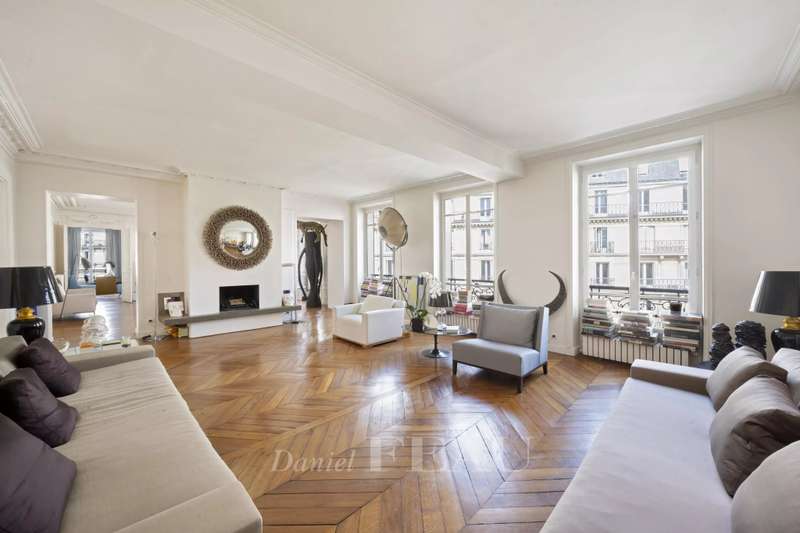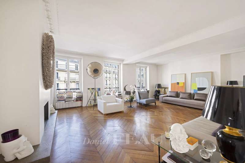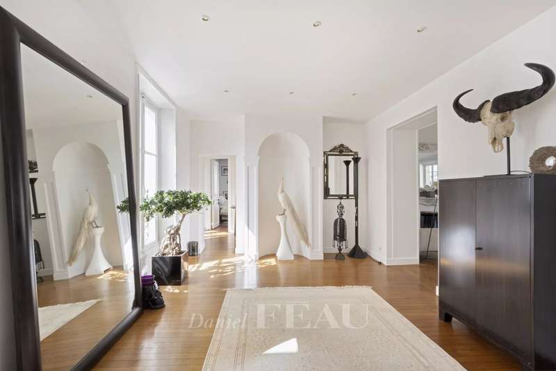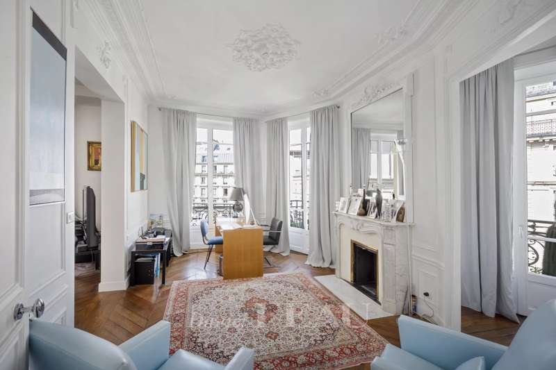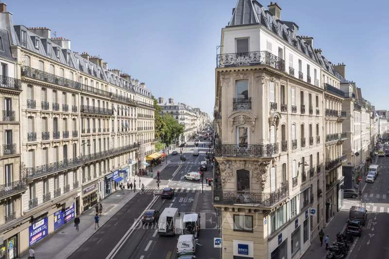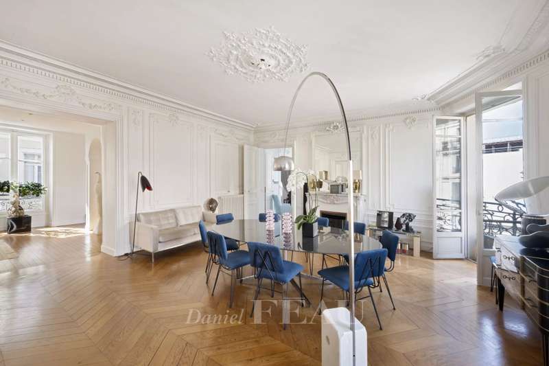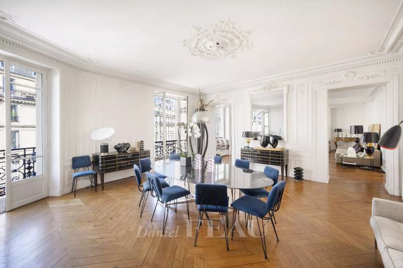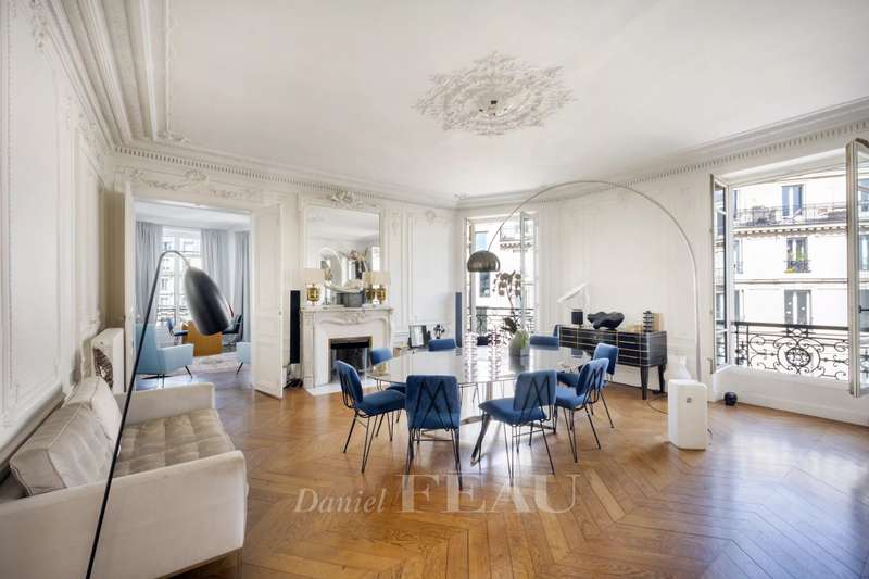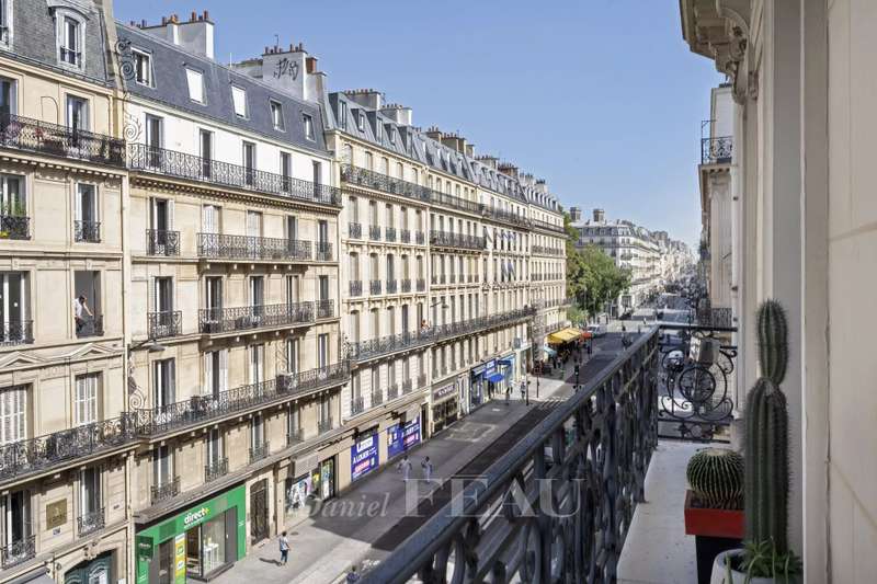 Cadet neighbourhood. This corner apartment offering 240 sqm of floor space and 227 sqm of living space as defined by the Carrez Law is on the 3rd floor of a fine mid 19th century Haussmannian building. Meticulously renovated, it includes a 45 sqm living/reception room, a dining room, a separate kitchen, a master suite with a study, two further bedrooms with bathrooms and wc, and a dressing room. A 4th bedroom would be possible. The apartment is particularly bright, and opens onto a continuous balcony benefiting from open views. Possible premises for a self-employed professional.