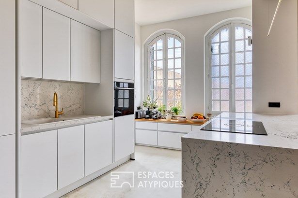 The vast living space bathed in light thanks to its large arched openings and its 3-meter ceiling height, is structured around a kitchen with a refined design. It also includes a laundry area opening onto a convivial dining room with access to the terrace, as well as a comfortable living room with a fireplace.