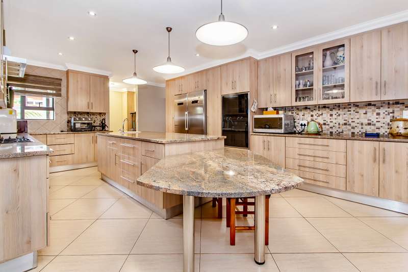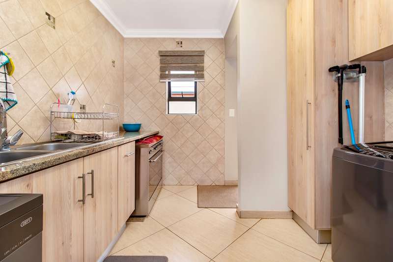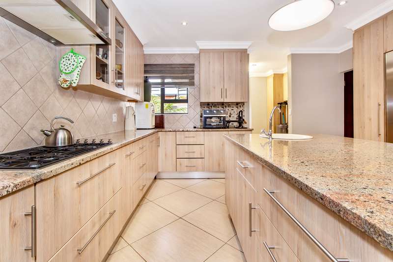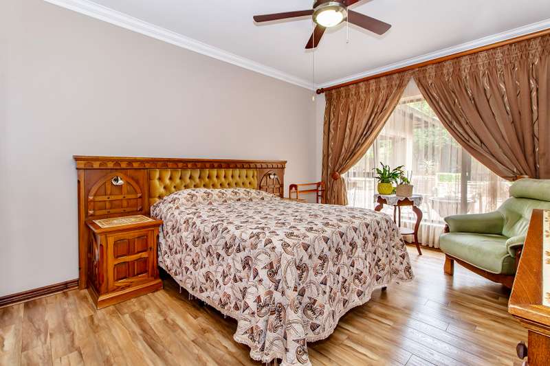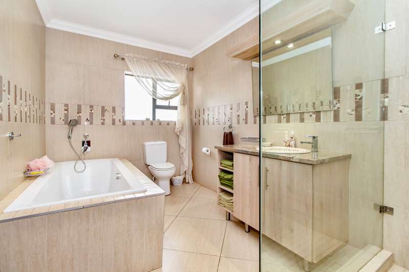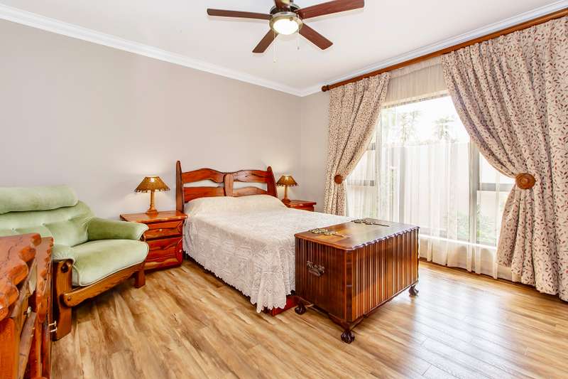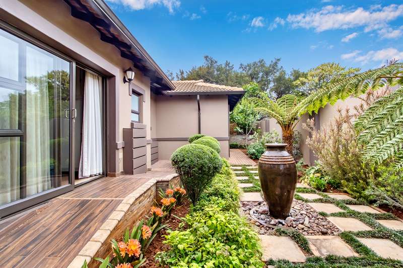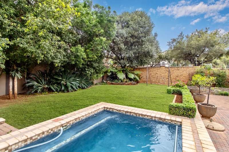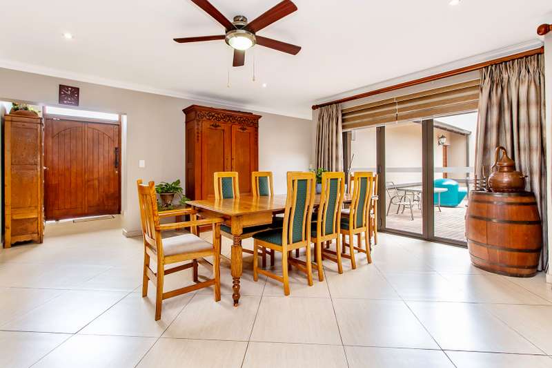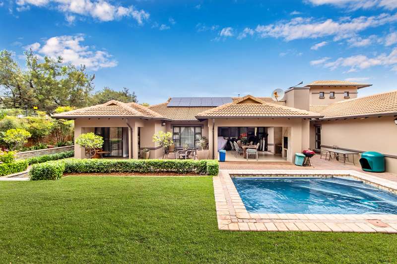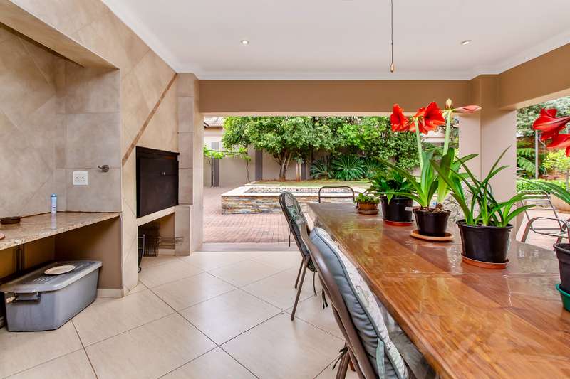 This beautifully designed single-storey home in the sought-after The Wilds Estate combines comfort, practicality, and timeless elegance. With four spacious bedrooms, including a private flatlet with its own bathroom and kitchenette, this home is ideal for families looking for versatility and space. As you enter through the welcoming double doors, you are greeted by a flowing open-plan living and dining area filled with natural light. To the right, you’ll find a well-appointed study and access to the garages, perfectly positioned for convenience. The modern kitchen features granite countertops, a central island that doubles as a breakfast nook, a scullery tucked away for functionality, and premium appliances including a double mid-level oven and gas hob. The living area seamlessly opens onto a covered patio with a built-in braai, overlooking the beautifully landscaped garden and sparkling swimming pool, perfect for entertaining and enjoying relaxed outdoor living. The main bedroom boasts vinyl flooring, a luxurious walk-in closet, and a spacious en-suite bathroom with a double vanity and walk-in shower. The other bedrooms are well-sized and share a modern bathroom with a shower, toilet, and basin. One of these bedrooms also features a private sliding door leading out to a small garden space. The attached flatlet, accessible near the kitchen, provides excellent flexibility with its own bathroom and kitchenette, making it an ideal guest suite, teen pad, or private work-from-home space. Practicality is key, with garaging for five cars (two double garages plus one single) and excellent flow throughout the home. This is more than just a house, it is a home designed for modern living, offering space, style, and comfort in one of Pretoria East’s most prestigious estates.
