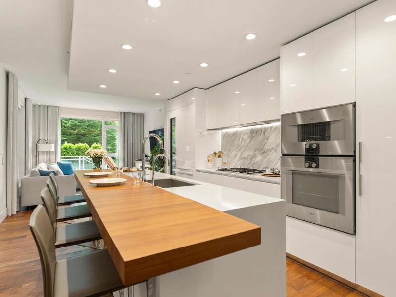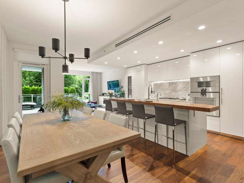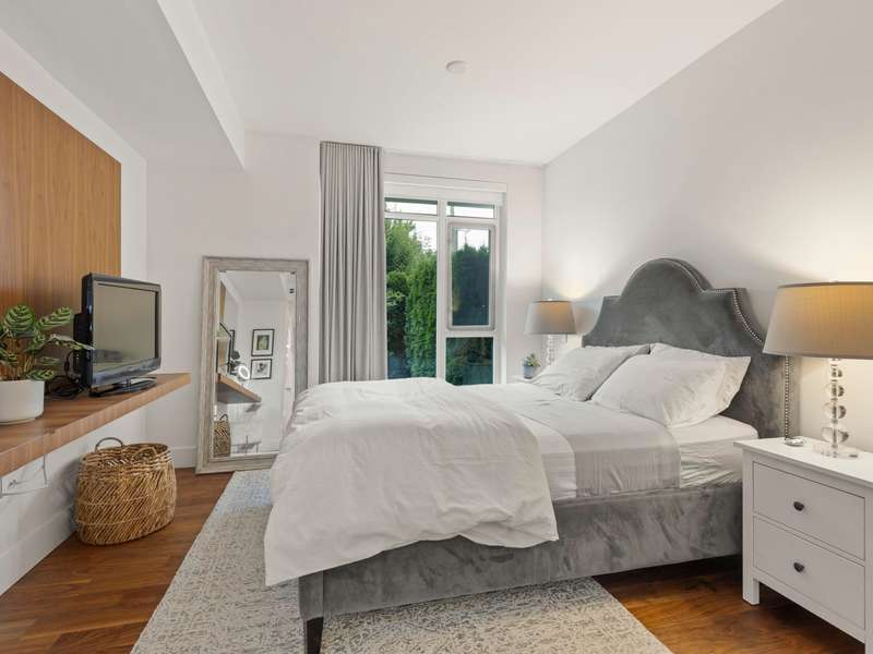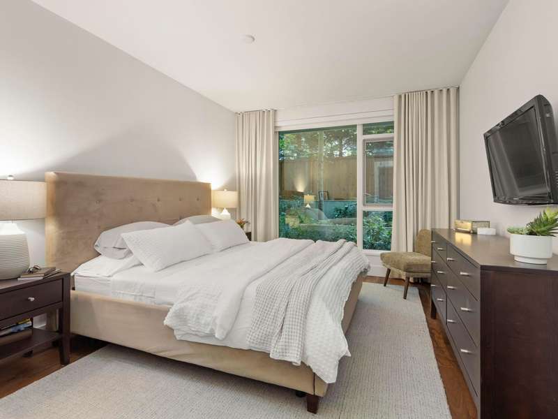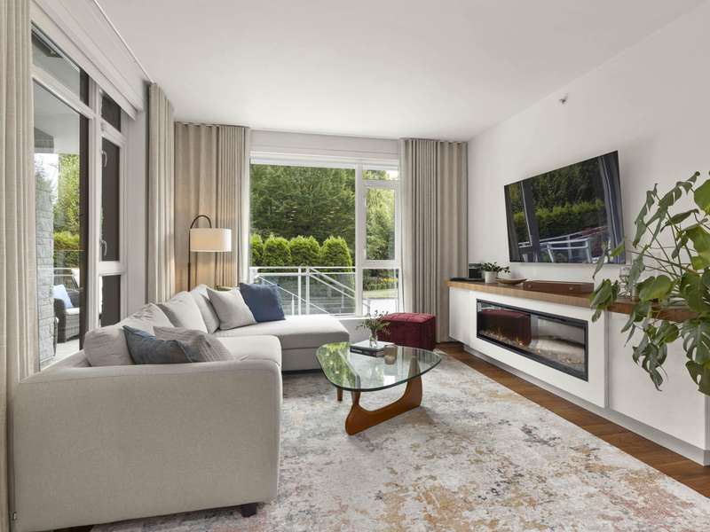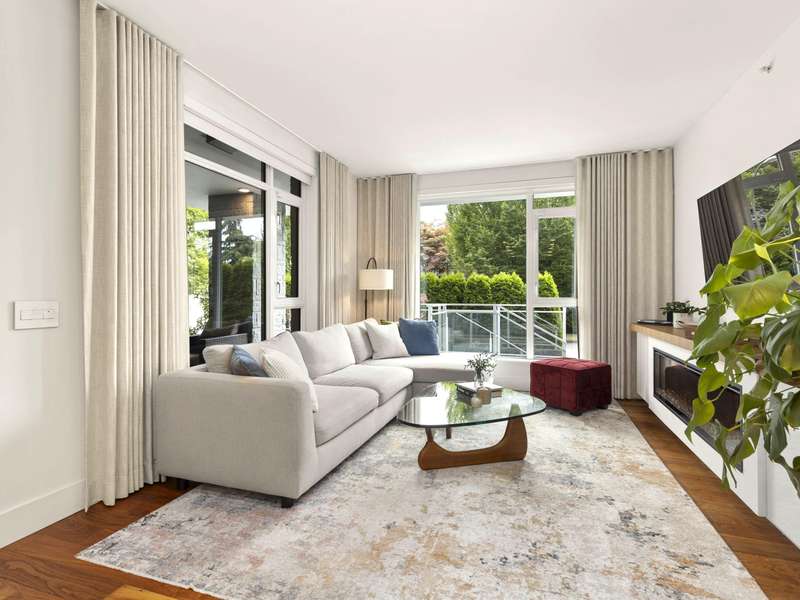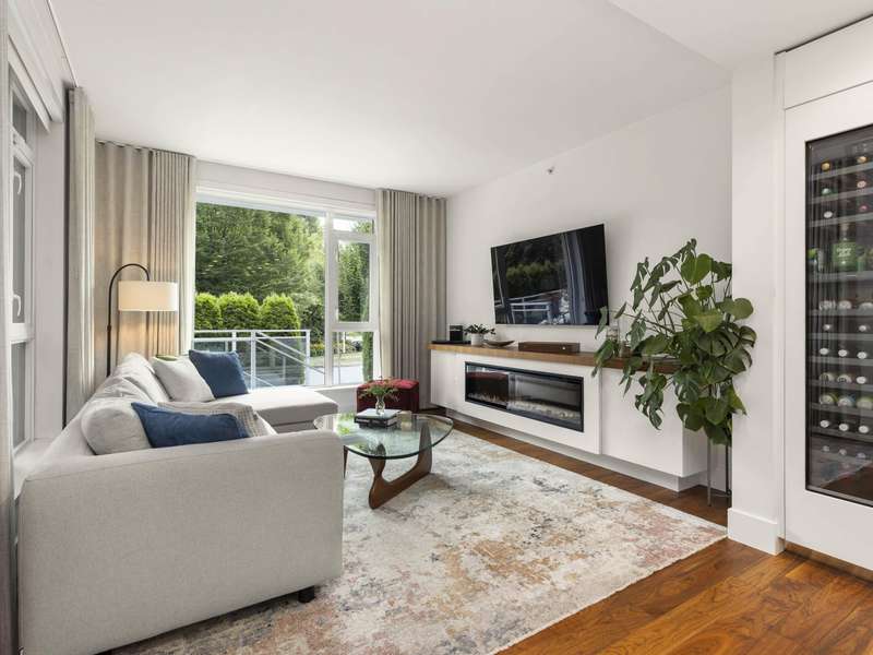 Modern elegance meets tranquil sophistication in this rare garden-level residence at Belpark by Intracorp.This 3 bed+flex luxury SE corner home blends refined European design w/ warm natural elements, featuring a sleek chef's kitchen, high-end appliances, steam-oven, wine fridge, Italian cabinetry, marble slab backsplash & quartz stone counter. Floor-to-ceiling windows bathe the open concept space in natural light, complemented by custom millwork, full-length fireplace & wide-plank matte walnut hardwood floors. Enjoy the seamless outdoor living w/ your private oasis surrounded by lush greenery. Belpark offers peaceful reflecting pool surrounded by landscaped courtyard, concierge, gym, lounge. Steps from parks, Churchill High, Langara College, YMCA & Golf Course. True Westside Master Piece!