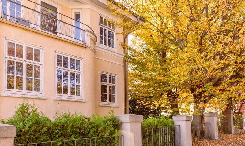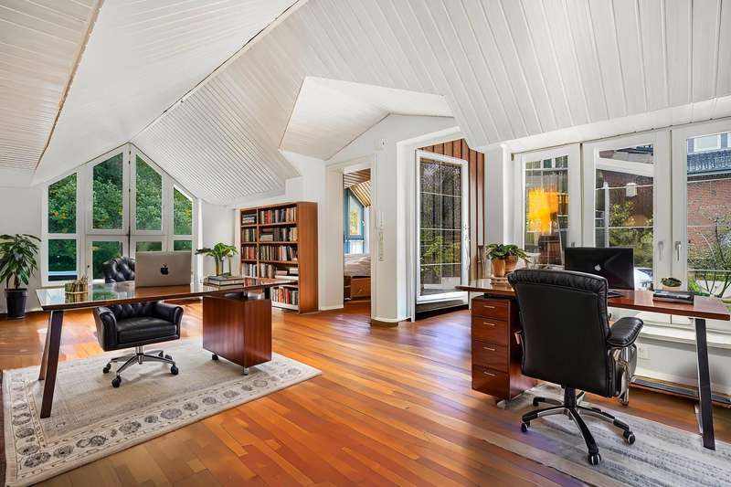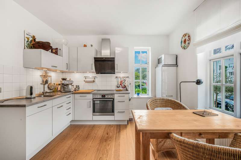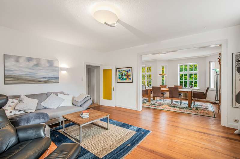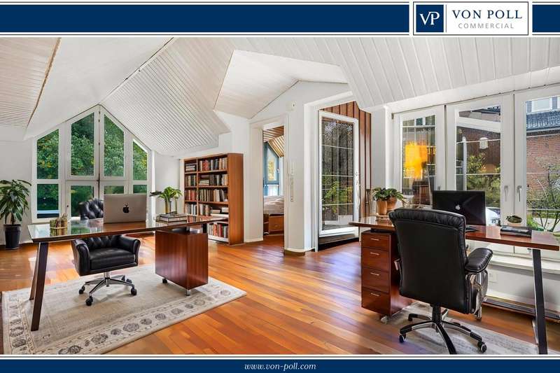This impressive residential and commercial building in the style of an Art Nouveau villa with a spacious extension is located in a quiet side street on an idyllic, ingrown plot. It is an architectural gem with a wide range of potential uses. The combination of prestigious living, flexible commercial use and solid capital investment makes this property particularly attractive. There is a self-contained apartment on the upper floor, which is currently rented out and therefore guarantees a stable rental income. Further living and working areas can be individually designed, for example as a practice, studio, office or additional residential unit. The main house impresses with its high ceilings, large window fronts and the warm character of the original wooden floorboards. An open kitchen area and a stylish fireplace room on the first floor create an inviting ambience. From here you can access one of the balconies and the spacious terraces, which invite you to linger and enjoy the outdoors. The spacious floor plan on the first floor offers plenty of room for creative usage concepts. In addition to the rented apartment, there is a charming, converted studio on the upper floor. Here, too, balconies provide additional open space and a wonderful view of the greenery. The large extension with separate entrance area can be used in a variety of ways - ideal for business, hobbies, guests or as an additional residential unit. The basement has its own terrace and a private sauna with shower - a real feel-good highlight. The property is technically state of the art: a roof covering as good as new, a modern heating system with solar thermal energy and a high-performance photovoltaic system ensure energy efficiency and sustainability. Two parking spaces in the double garage and a carport round off this attractive offer. This stylish residential and commercial building combines historical substance with modern comfort and is ideal for anyone who wants to combine spacious living, working and investment under one roof.