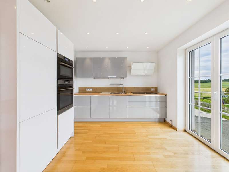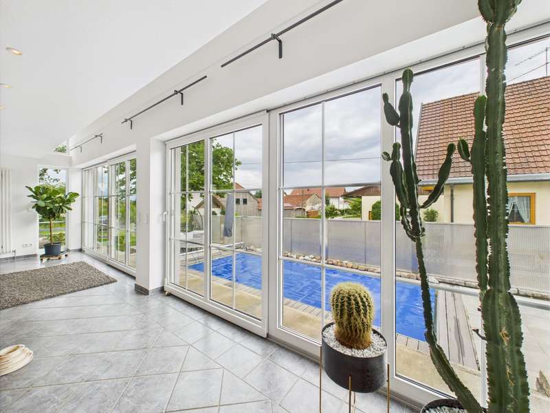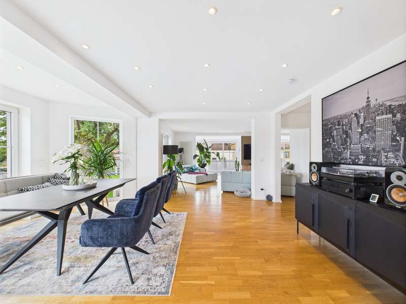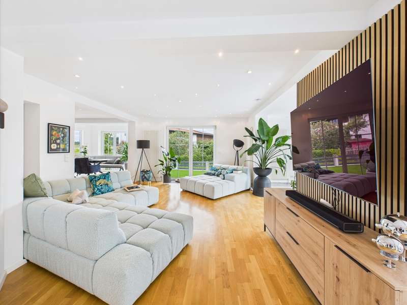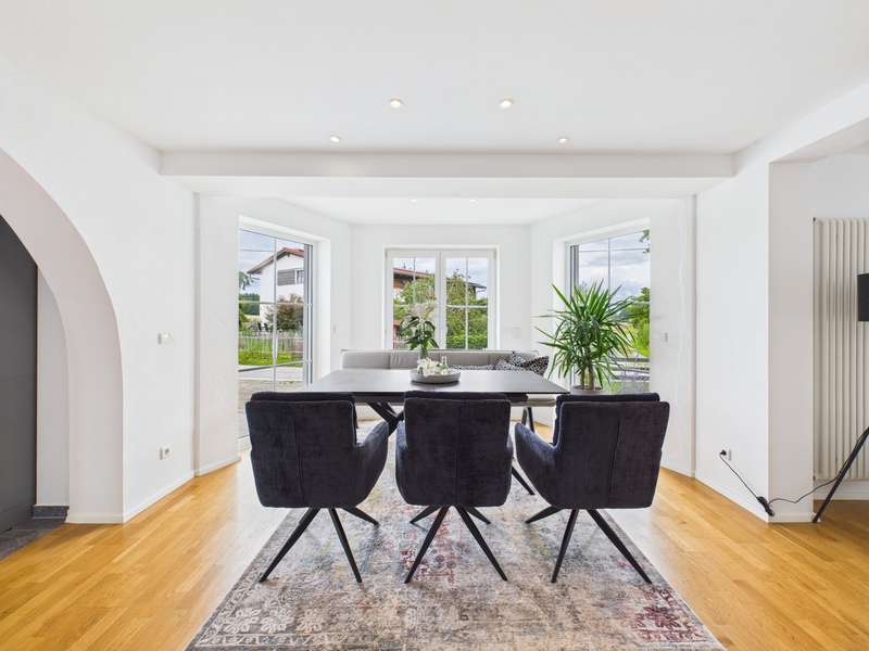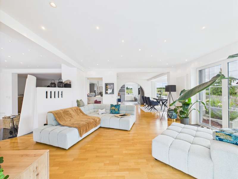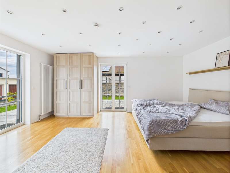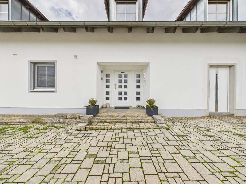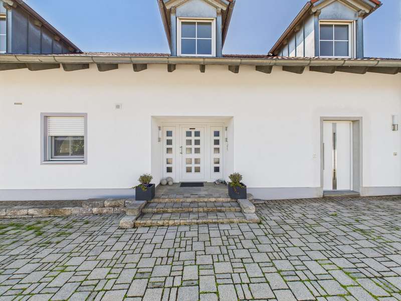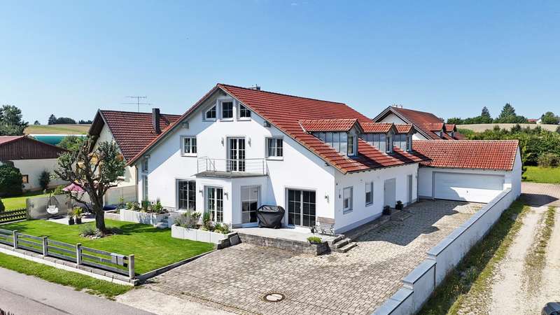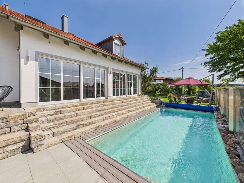 Spacious detached or semi-detached house with wellness area, pool and a variety of uses - close to Landshut in a quiet location in Oberdessing This property, built from scratch in 2001, impresses with its spaciousness, well-kept condition and upscale furnishings. A living space of approx. 350 m² is spread over three floors - currently used as a two-family house, with a declaration of division already in place. With little effort, the house can also be ideally designed as a spacious single-family home. On the first floor, you are greeted by an impressive living/dining area with fireplace and open kitchen concept. The modern fitted kitchen, high-quality materials such as parquet flooring and tiles, as well as the light-flooded architecture give the living space an almost loft-like ambience. There is a real highlight in the basement: a spacious fitness and wellness area with panoramic sauna, shower and relaxation zone - ideal for hobbies, home office or practice use. The second residential unit is fully self-contained and could be rented out as an investment or sold separately if required. The house is also perfect as a multi-generational solution. The approx. 850 m² plot offers a beautifully landscaped garden with pool, spacious driveway, several terraces as well as two garages and four parking spaces. The rural location combines tranquillity with ideal proximity to the city - you can reach the Landshut city limits in just a few minutes. A house with many options: whether as a spacious family home, a capital investment or living and working under one roof - many things are possible here.