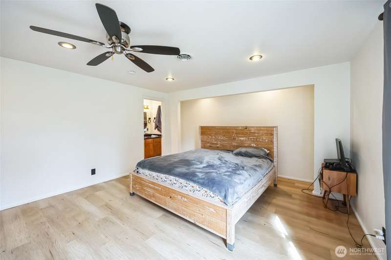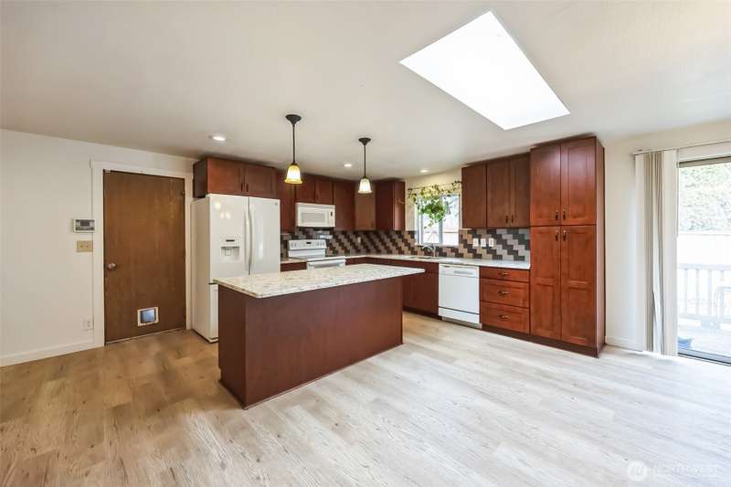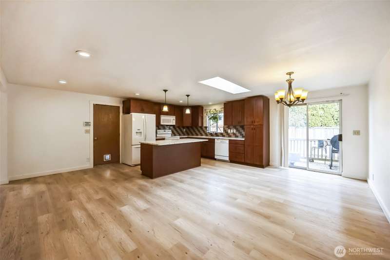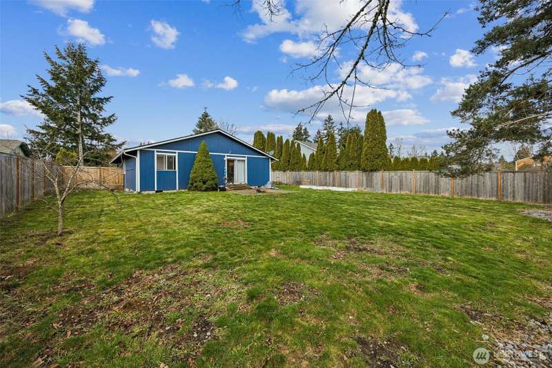 Take a look at this charming 3 bedroom, 2 bath Puyallup rambler on a fully fenced quarter acre lot! The covered porch-perfect for seasonal decorating-leads to the red front door. Gleaming brand new laminate floors throughout, mini split heating and cooling, recessed can lighting for comfort. Newer cabinetry, quartz countertops, center island, tile backsplash and all appliances stay complete the very large open kitchen. Living room, kitchen & dining area flow together making the perfect space to entertain. Oversized primary bedroom includes walk-in closet + large en suite. 2 additional bedrooms have closet organizers and are served by 2nd full bath. Roof is just 5 years old. 2 car garage, expansive driveway & RV parking and NO HOA!