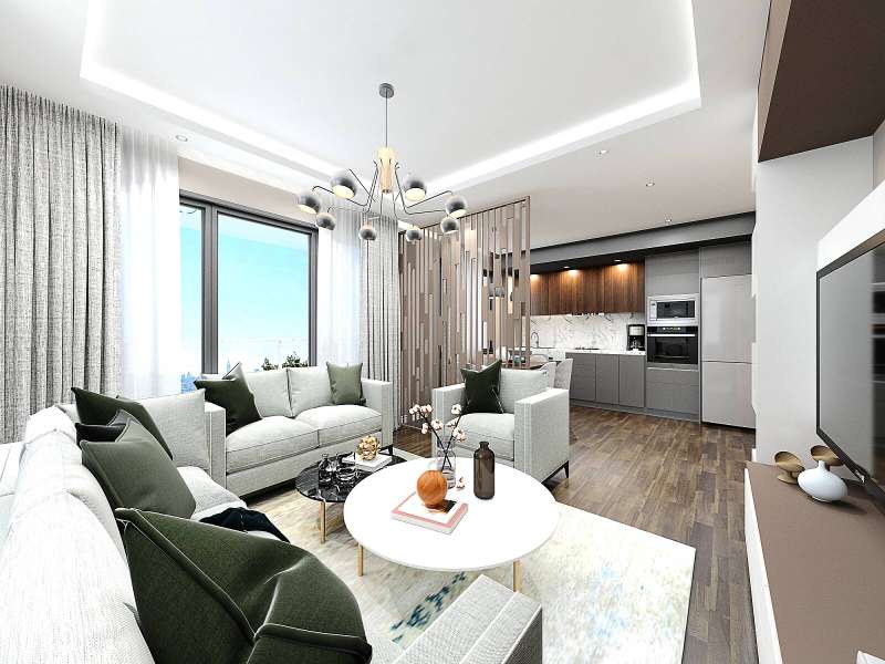 The complex with a private beach includes different types of apartments with different room numbers. Flats for sale will be delivered with electric and water infrastructure, isolation systems, kitchen and bathroom cabinets, floorings, lighting, interior and exterior doors, balcony parapet and stair rail, and also bathrooms with shower cabins.