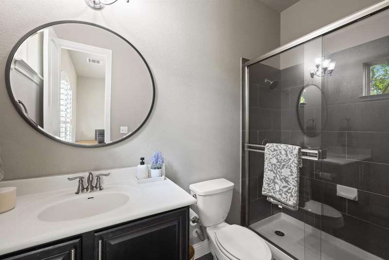 The primary suite offers a remodeled spa-like bath with designer finishes, dual vanities, and two generous walk-in closets. Upstairs you'll find two additional bedrooms, a full bath, a game room, and a media room ideal for movie nights or play. The office on the main floor could easily serve as a fifth bedroom.