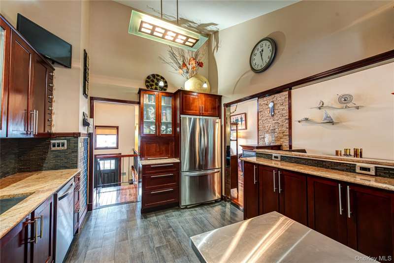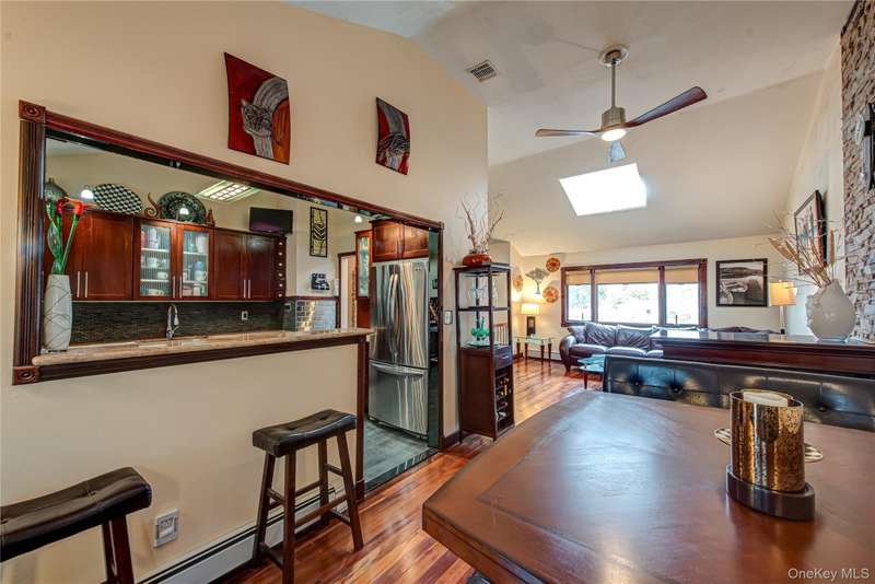 At the headwaters of Little Neck Creek Canal in the Village of Lindenhurst, this original owner commissioned the build of a modern home in 1988. A high ranch layout was chosen, and no expense was spared in its construction. Continuously maintained and updated, it sits as one of the finest examples of this style. With views of the water and village docking opportunity right across the street, this is your ticket to coastal living in one of the most acclaimed communities on Long Island! The main living space is on the second level, featuring soaring ceilings, hardwood floors and a stunning kitchen with stainless appliances, granite counters and bold tile details. Down the hall is 3 bedrooms and a beautiful full bathroom. Beyond the dining room, a covered porch blends the indoors and out, with exterior stairs leading to the carefully manicured yard. Downstairs is accessible both from interior stairs as well as an outside entrance around back, offering several interesting opportunities for its use. With a huge additional living space, a 4th bedroom, full bathroom, a kitchen and dining room, this could easily be approved for an accessory apartment permit, or just be your fun extra entertaining space! The back yard has enjoyed the same enthusiasm for enhancement, with a covered deck, paver patio, a vinyl pergola, and mature landscaping. Essential upgrades like gas heat and hot water heater, updated electric, vinyl siding, replacement windows and a healthy roof, this home truly lets you move right in and start your life. This is the whole package, come and get it!