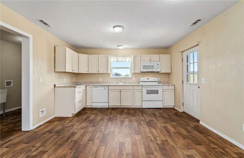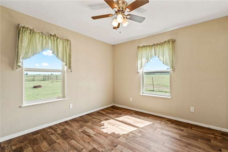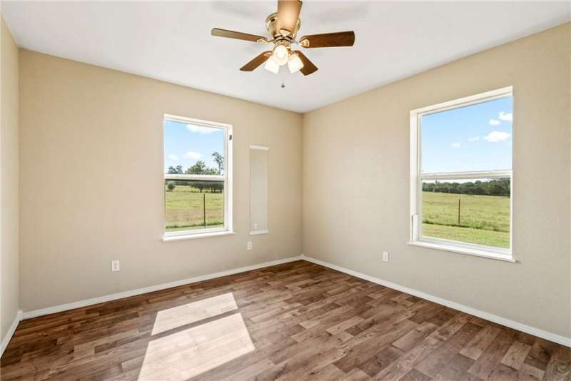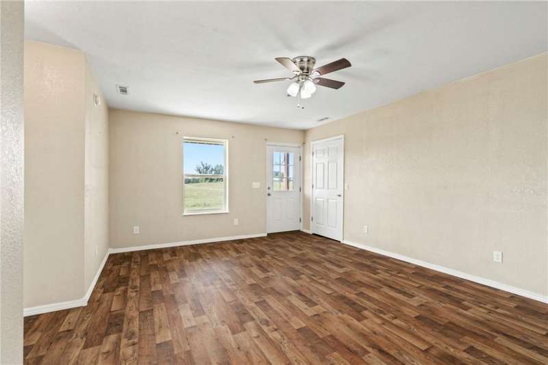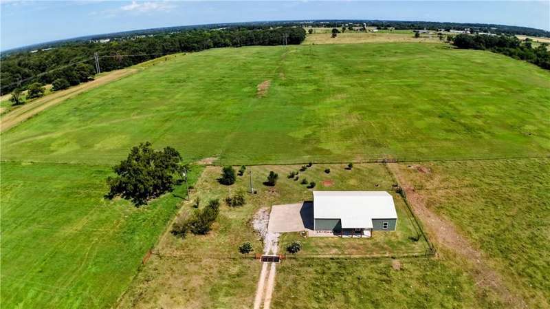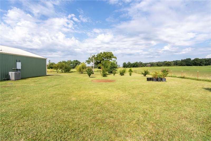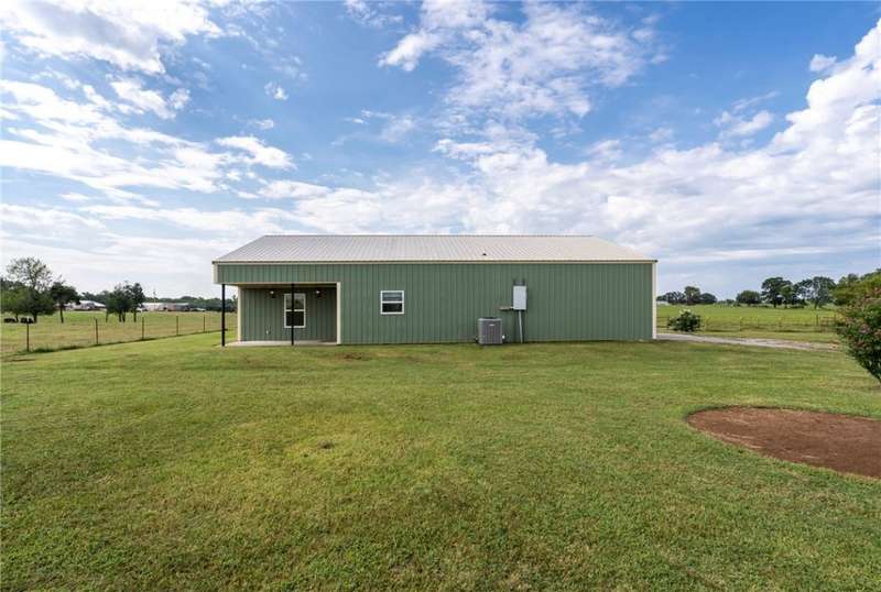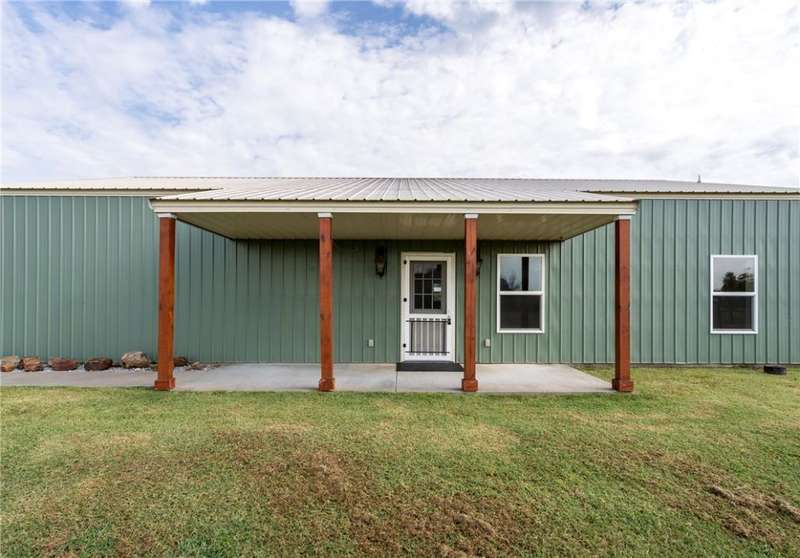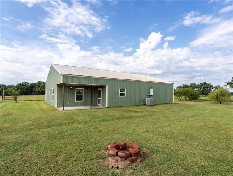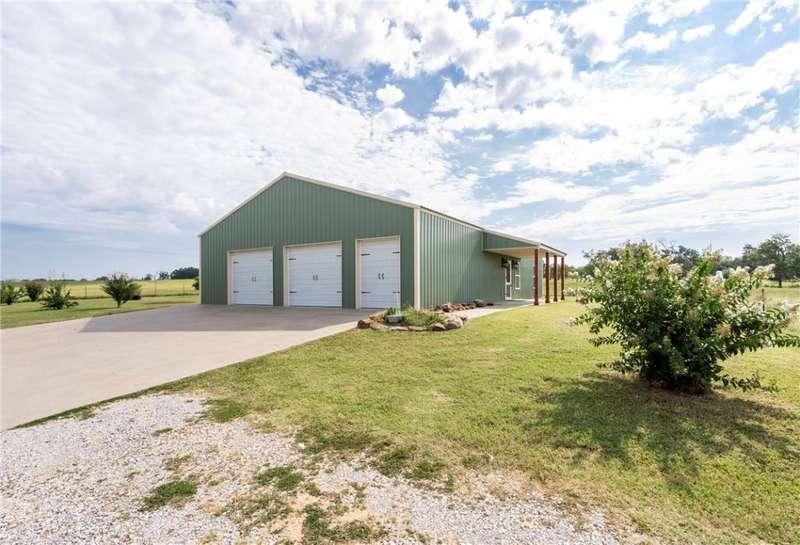 Country living just outside of town! 2bd, 2ba home with 1352sf sitting on 7.5 ac m/l. Metal exterior & roof. Open floor plan. Storm shelter accessible from the interior of the house. Huge storage/pantry area. Safe step walk-in tub in primary, shower in guest bath, both with bathroom safety bars. Covered front and back porches. 3-car oversized garage, large enough for workshop area. 2x6 walls, foam insulation with fiberglass in attic. Pasture land with a small patch of mature trees. Fenced & cross-fenced yard with cattle guards at the road & entering the yard. Less than 1/2 mile of dirt road. Built in 2017. Rural water & septic.