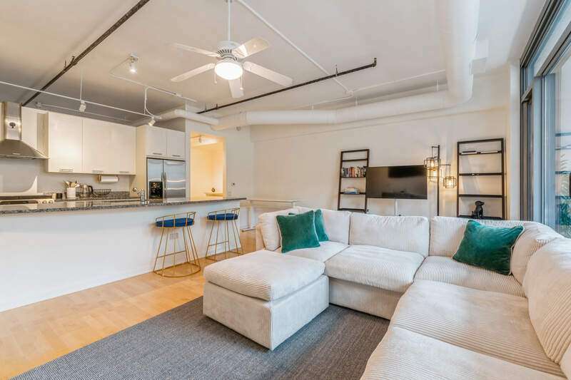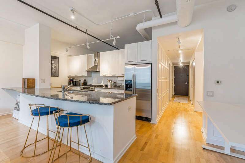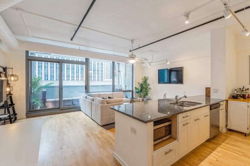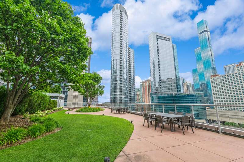 Spacious newly remodeled South facing loft in the perfect Streeterville location. Walking distance to Navy Pier, Northwestern, Riverwalk, Whole Foods, Target, AMC Movie Theater and all of your favorite dining spots. Enjoy the light filled 18 x 5 ft terrace with spectacular high-rise city views. Kitchen boasts newly resurfaced shaker cabinets, stainless appliances, gas range and expansive granite island counter. Generous one bedroom with ceiling fan & fabulous walk-in closet. The bath features stone and marble accents as well as Kohler fixtures. Other new highlights include freshly painted and wallpapered throughout, all California closets, built in dining banquet, skim coated ceilings and new washer and dryer. Features not to be missed are 10 foot ceilings, floor to ceiling sliding glass doors, maple hardwood floors throughout and a desk inlet. Exterior storage cage included in attached garage. Amenities include cardio room, weight room, roof top pool with deck & community grills, movie/media theater, bike room, dog run, party room with catering kitchen, dry cleaner on site, business center, 24 hour doorman & security. On site building management. Parking is available to rent in attached garage. Assessments include: All amenities listed plus heat, air, gas, water, cable, internet, scavenger, landscaping & snow removal. Lofts can be rented. No Rental Cap. Minimum 1 year lease.