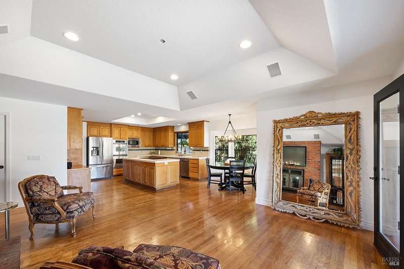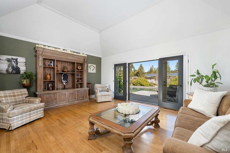 Single-story Eastside Estates home on a 10,000+ square foot lot with mature landscaping and mountain views to the north. This 3-bedroom home with generous bathrooms plus a flexible bonus room is perfect for an office or gym. The formal entry opens to wood floors, 8-foot doors, and soaring ceilings. The living room's wall of French doors fills the home with natural light and opens to the backyard. The generous kitchen features a large island, lots of cabinets and pantry space, brick fireplace wall, breakfast nook, built in desk and an open-concept great room, ideal for larger meals or entertaining friends and family. Off of the kitchen is the laundry/mudroom with additional storage. The primary suite includes a walk-in closet, spacious bathroom with double sinks and a Jacuzzi tub, and French doors that open to the backyard. The resort-style outdoor area showcases a 36' x 18' saltwater sports pool with a Baja bench, adjoining hot tub, firepit, and multiple seating areas, perfect for outdoor entertaining or movie night. Located on a tree-lined street in one of Sonoma's favorite neighborhoods and close to the Sonoma Historic Plaza, fine dining, and boutique shopping. Easy access to Napa, San Francisco, vineyards and the coast. Elegant, private, and ideal for Sonoma Valley living.