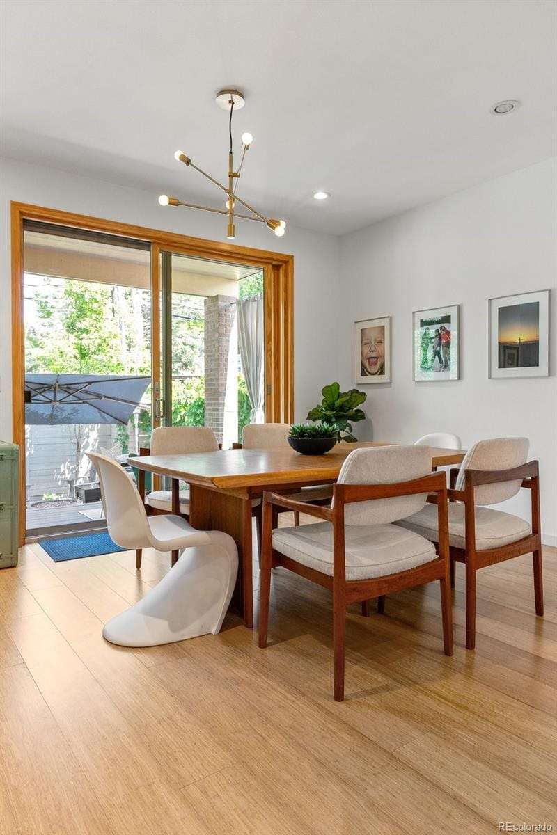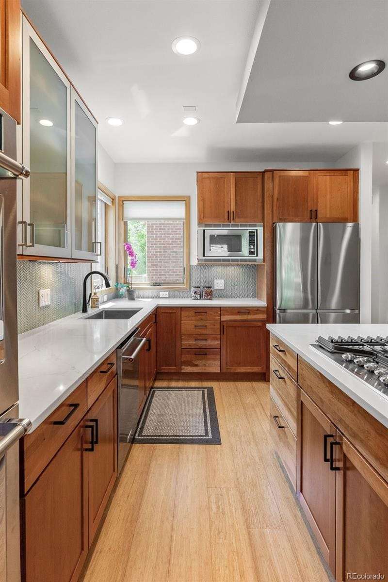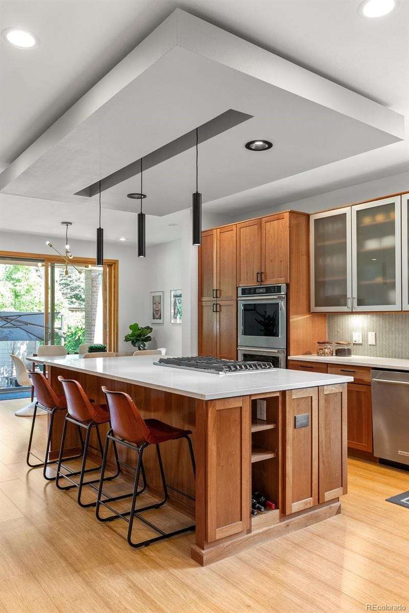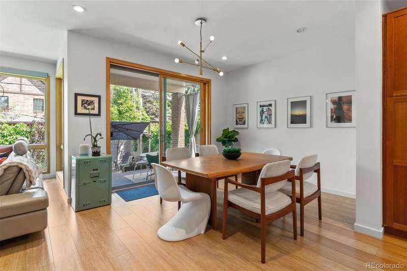 Tucked away in the heart of Hilltop, this beautifully updated residence offers the perfect blend of classic architecture and modern sophistication. Bathed in natural light and thoughtfully designed for both everyday living and elegant entertaining, every detail of this home reflects warmth, intention, and style. The main level welcomes you with thoughtfully designed ceiling heights, expansive windows, and newer bamboo flooring that flows throughout the open-concept living and dining spaces. A striking floating staircase serves as an architectural centerpiece, while the adjacent home office with custom built-ins offers a quiet place to focus or create. The kitchen has been tastefully updated with quartz countertops, a statement backsplash, solid cherry cabinetry, and double ovens which are equally suited for casual mornings or dinner with friends. Upstairs, the primary suite is a serene retreat, featuring two customized closets, a private west-facing balcony, and a fully renovated five-piece bath that feels like a page from a design magazine. Two additional spacious bedrooms and a second full bath complete the upper level. The finished lower level offers incredible flexibility with its own living area, bedroom, full bath, kitchenette, workout space, and private laundry hookupsan ideal solution for long-term guests, extended family, or an au pair. Outside, enjoy a recently landscaped backyard designed for both relaxation and connection. A newer high-efficiency HVAC system brings comfort and peace of mind, rounding out a truly turnkey home. Located just blocks from Cranmer Park and within the boundaries of Carson Elementary, this is a rare opportunity to own a thoughtfully renovated property in one of Denvers most beloved neighborhoodswhere tree-lined streets, timeless homes, and a true sense of community define the lifestyle.