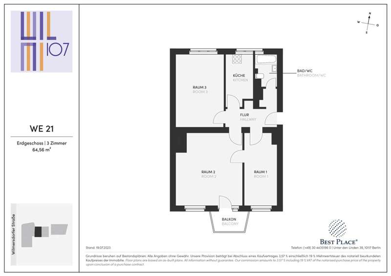 The modern building ensemble Wilmi 107 is located in the sought-after City West between Ku'damm and Kantstrasse. The 2- to 3-room apartments and commercial units are solidly rented and most have balconies or loggias and bathrooms with access to natural ventilation and light. Efficient floor plans, practical apartment sizes and elevator access make them lucrative investments. The offered apartment WE21 is located on the ground floor. With three rooms and approx. 64.56 m², it has a particularly sought-after apartment size. A balcony guarantees relaxing hours in the fresh air and a bathroom with natural light and bathtub provides comfort in everyday life. The apartment is ideal for singles and couples of all ages and will also rent very well in the future.
