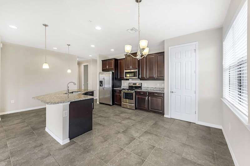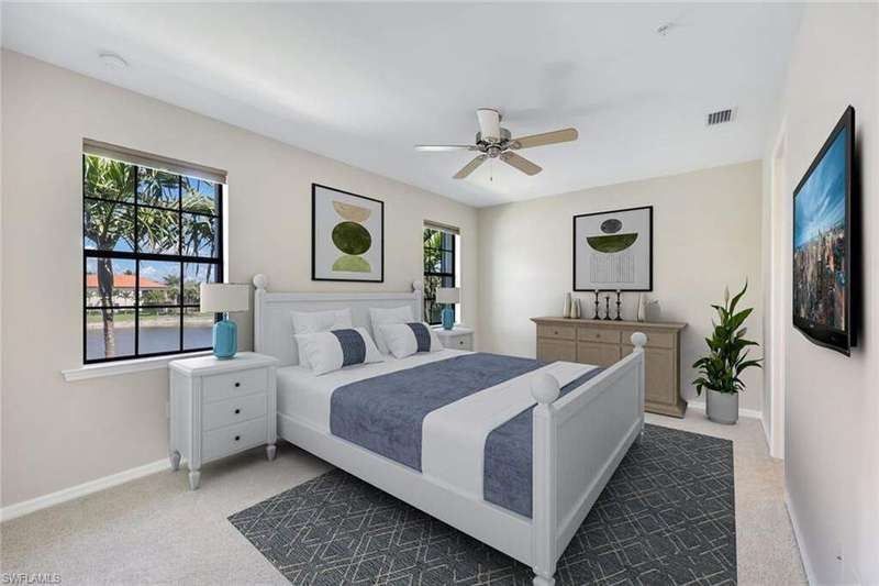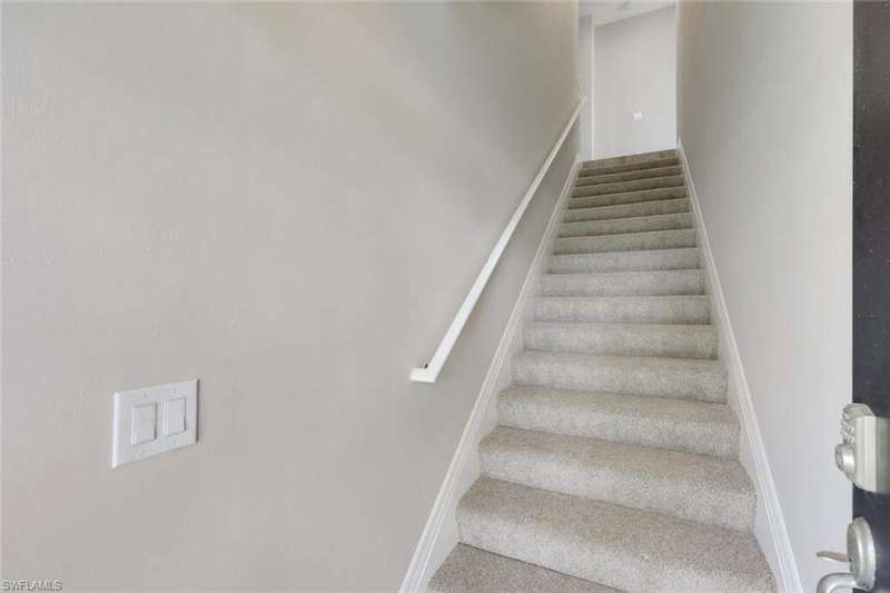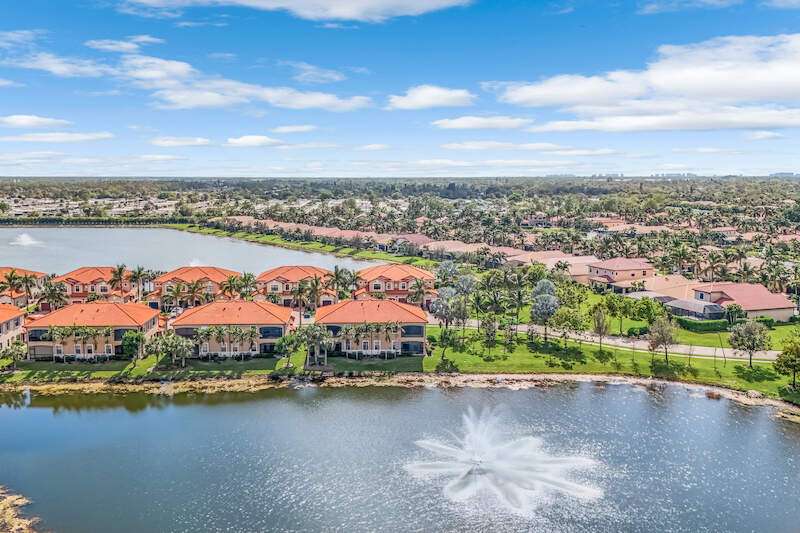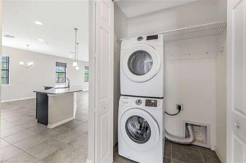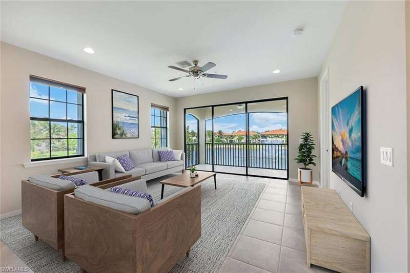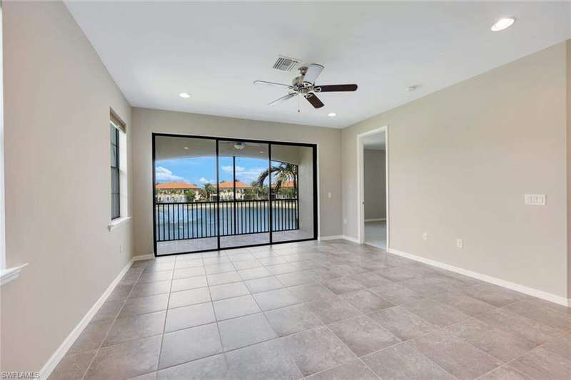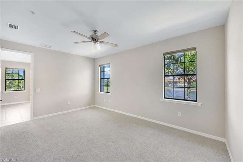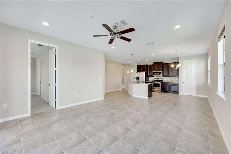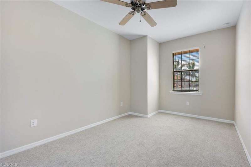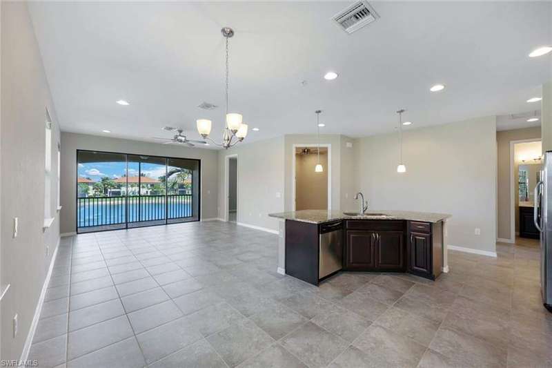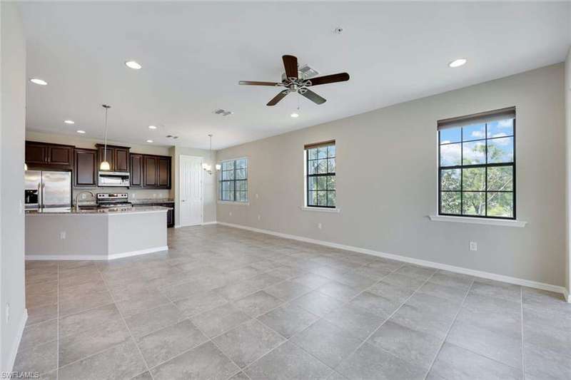 A MUST SEE Light & Bright second floor end unit offers a fantastic lake and fountain view. Just freshly painted throughout this 3 bedroom plus den features a spacious open floor plan with ceramic tiled living areas and 2 full baths. Beautifully appointed with 42" upper kitchen cabinets, granite counter tops, stainless steel kitchen appliances and a huge walk-in pantry makes for a cooks kitchen. For your convenience there are New accordion and rollup shutters added in 2022. At Paloma you'll enjoy a maintenance free lifestyle and resort style amenities with swimming pool, bocce court, fitness and club house with card room, gathering room, catering kitchen and tennis courts! Paloma is a gated community located in Bonita Springs, just off Imperial Pkwy with only minutes to the beach and Coconut Point Mall.