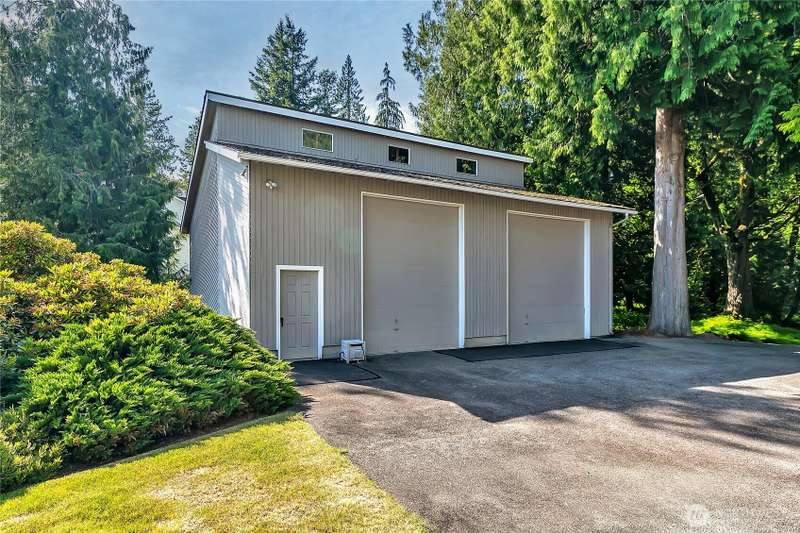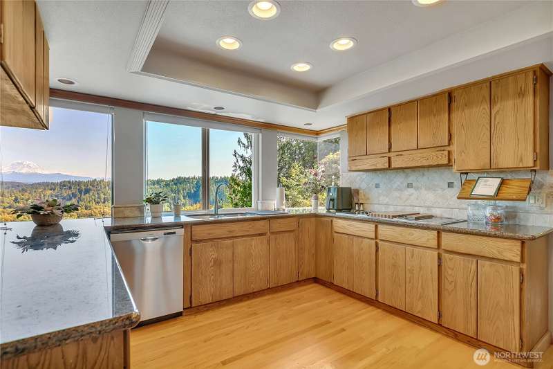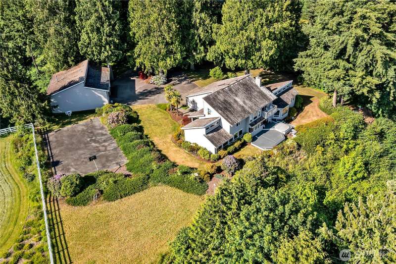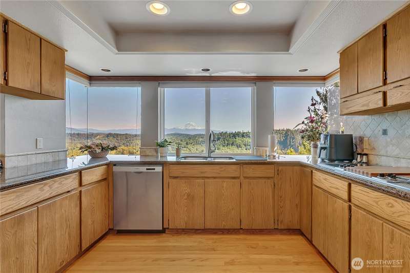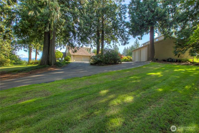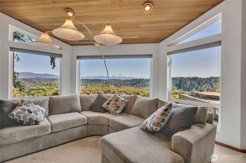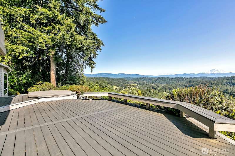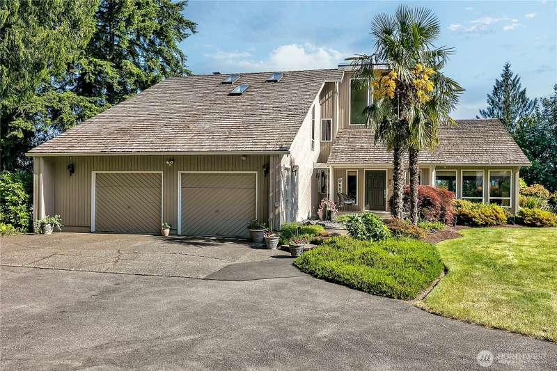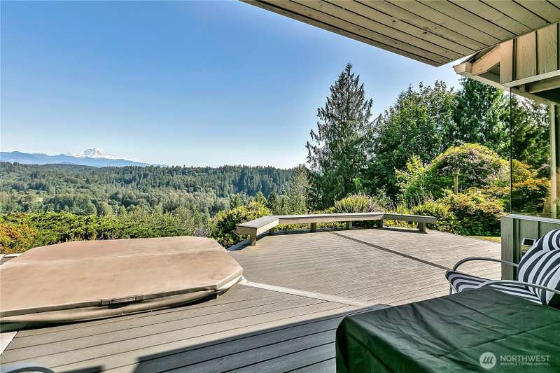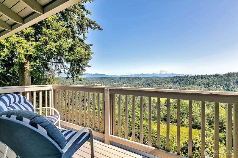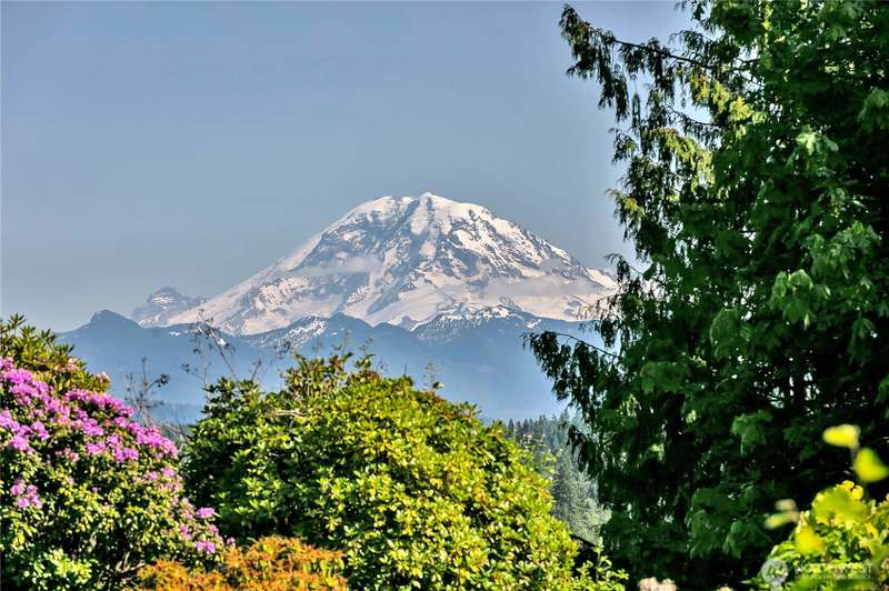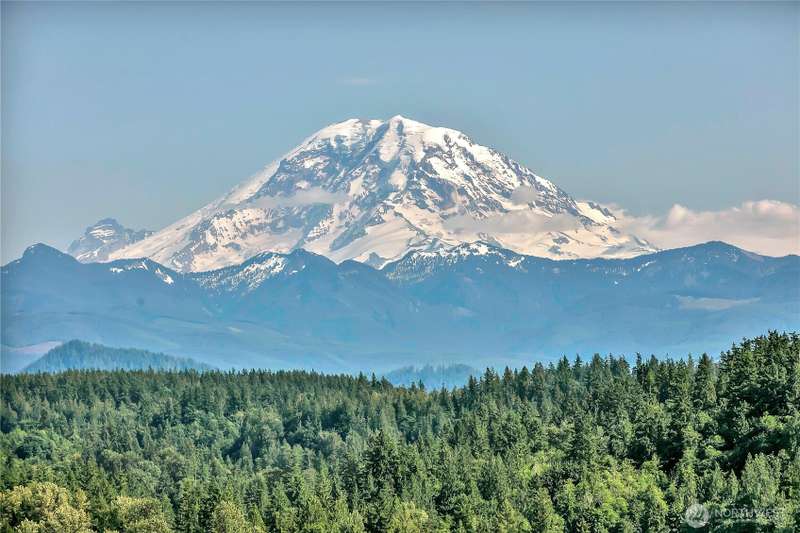 Experience Serene Luxury with Unparalleled Mt. Rainier Views. Nestled on a private 2.62-acre lot, 4-bedroom, 2.75-bath custom home. Vaulted ceilings welcome you into the formal living and dining areas. Expansive kitchen, complete with a cozy breakfast nook, provides ample space for culinary creations and entertaining. Adjacent to the spacious family room are two dedicated offices, perfect for remote work. The primary bedroom features an en-suite bath and a private deck on the second level with breathtaking views of Mt. Rainier. Step outside to the main-level deck with hot tub and meticulously maintained nature-inspired landscaping. Sport court with basketball hoop. Oversized 40'x40' shop for all your toys. Make this your next home!!