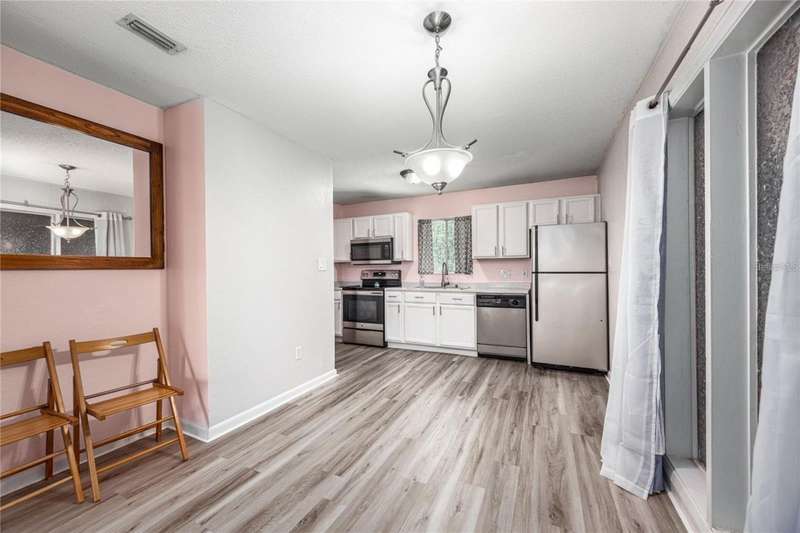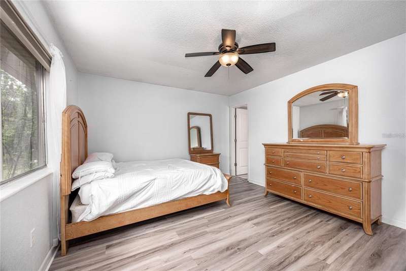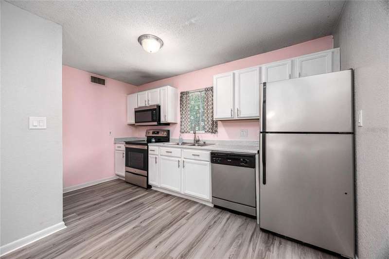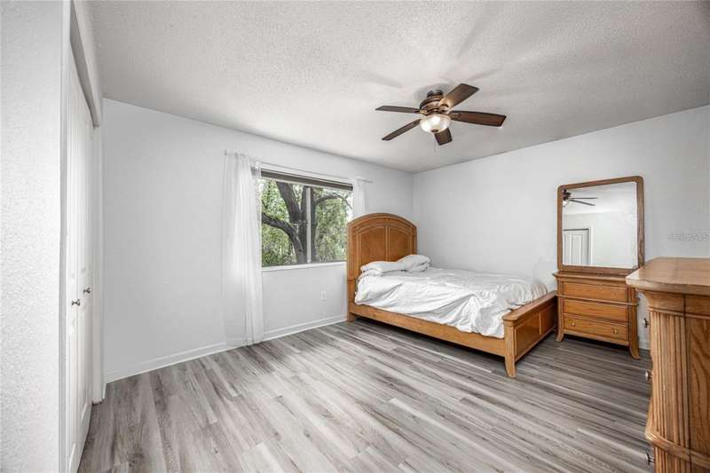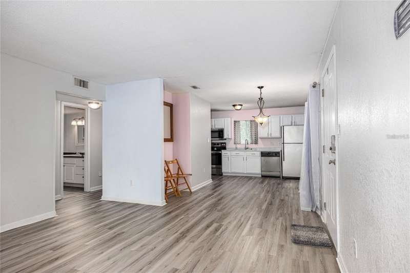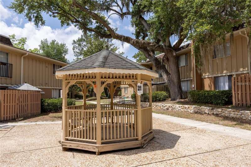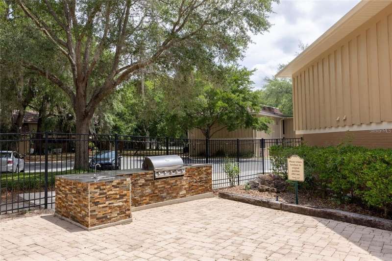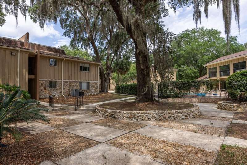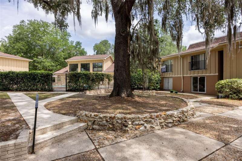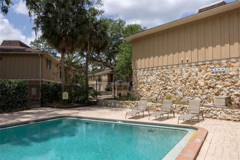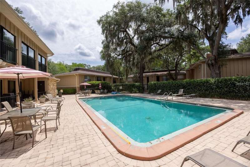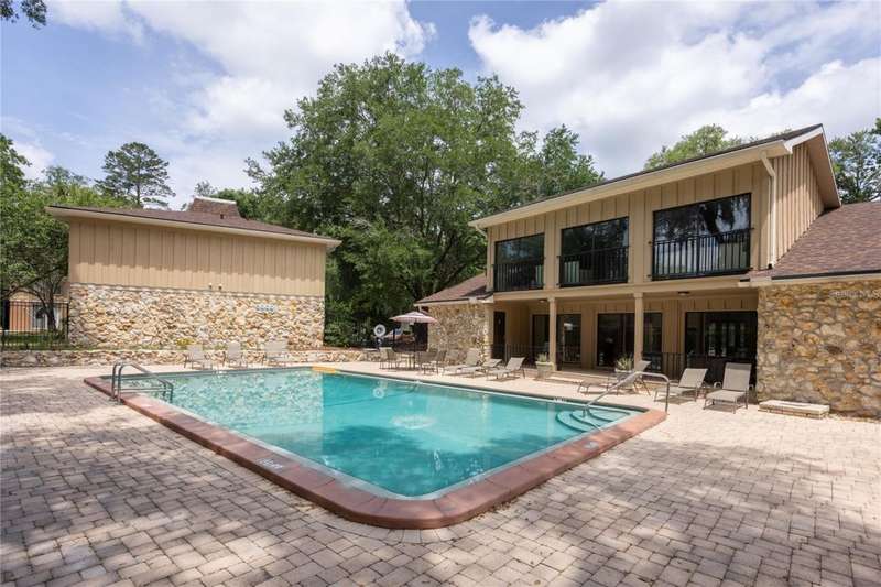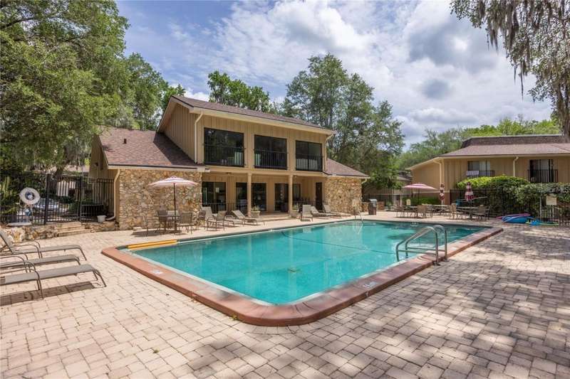 Prime Location for this top floor unit condo. Renovated to include luxury vinyl flooring in the living and bedrooms areas, along with freshly painted walls and trim throughout. This charming 2 Bedroom, 2 Bathroom condo offers convenience living. You walk into an open plan living, dining, kitchen area, while the split bedroom situation allows privacy with a roommate, guest or have a separate office/work from home space. Master bedroom includes an en suite bath and a large double closet. The quiet community provides amenities like a clubhouse you can rent out, a beautifully maintained swimming pool with a grilling area, tennis courts and a dog park space. This condo complex in on the public bus line and just over 2 miles from Ben Hill Griffin football stadium and the University. This location is idea for students and professionals alike. Water and Sewer are included in HOA fee.