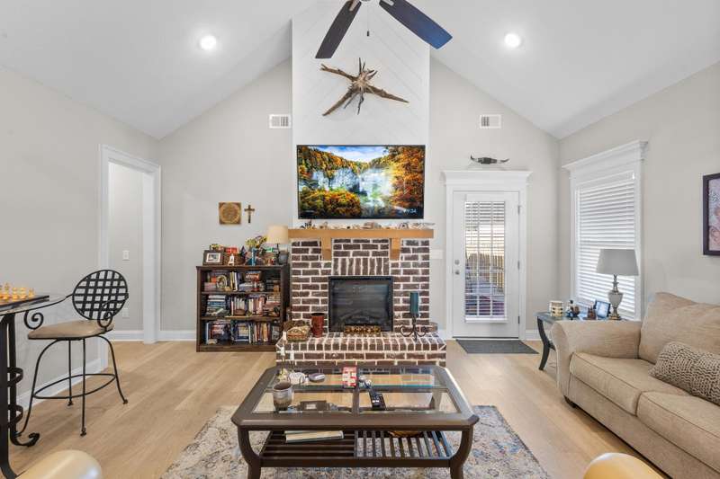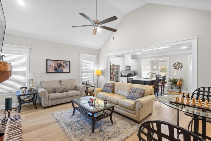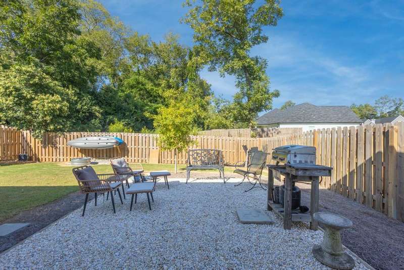 Welcome to this gorgeous one-story home offering 3 bedrooms and 2 full bathrooms, thoughtfully designed with an open floor plan that provides ample living space. A charming rocking chair front porch sets the tone, leading into a bright entry with a formal dining area. The great room features a vaulted ceiling and a cozy brick fireplace, seamlessly flowing into the kitchen. Here you'll find quartz countertops, a stylish tile backsplash, stainless steel appliances, and a center island perfect for gathering. The owner's suite is bright and spacious, highlighted by a statement wall and an en-suite bathroom with a double sink vanity, tiled walk-in shower, and walk-in closet. Additional bedrooms are well-sized and filled with natural light. Step outside to enjoy your spacious backyard with a covered patio and an extended patio, ideal for entertaining or relaxing complete with a buffer of common space between neighbors, adding privacy. The oversized garage provides plenty of space, even fitting a full-sized truck. Located in The Sanctuary, residents enjoy sidewalks, a large community garden, a neighborhood walking trail, and streetlights. All this, just minutes from Downtown Aiken, Bruce's Field, Hitchcock Woods, equestrian venues, shopping, and fine dining! Better than new with extended patio for grilling, accent wall in the primary bedroom, gutters and blinds!