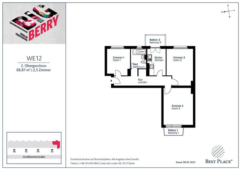 Your investment in the centre of trendy Kreuzberg: with this efficiently designed 2.5-room flat, you are investing where young people, professionals and families want to live. The flat with approx. 70 m² is located on the 2nd floor of the six-storey residential building. It has two beautiful balconies, one facing the garden courtyard to the east and one on the opposite side facing Großbeerenstraße. The bathtub in the bathroom provides a wellness feeling. The practical layout and size of the flat make it ideal for families and couples. Our sought-after investment project Big Berry offers investors solid rented flats in one of Berlin's most sought-after neighbourhoods. The six-storey residential building with four storeys was built in the 1950s and a new top floor was added in 2023. It has 76 flats with one to four rooms and approx. 26 to 108 m². A lift was added as part of the loft extension, which also benefits the existing flats. Big Berry also includes an idyllic garden courtyard and 17 car parking spaces.