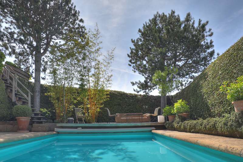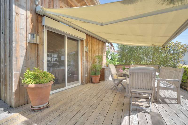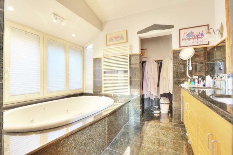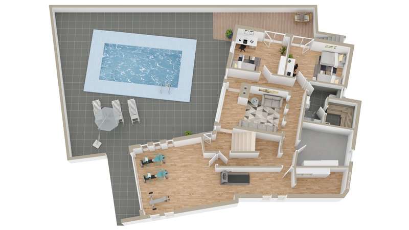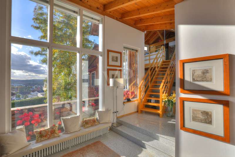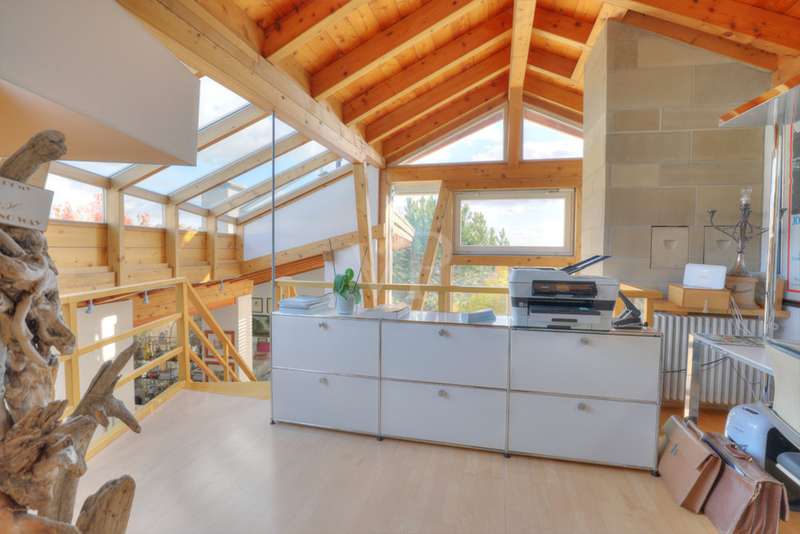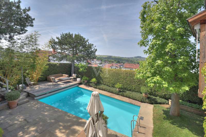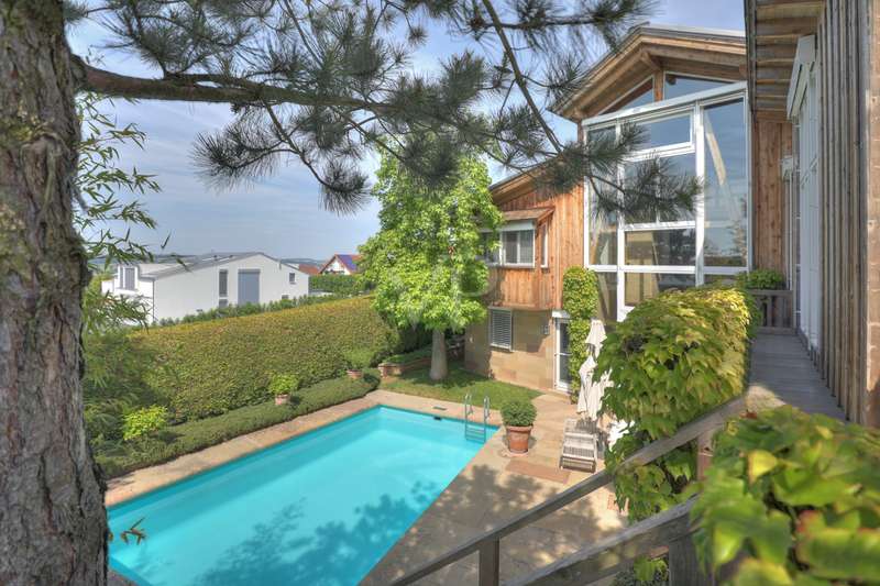If you appreciate modern design, spacious room concepts and light-flooded living spaces, you will be delighted by this exclusive architect-designed house in a quiet location in Sinsheim with distant views. On a plot of approx. 475 m², the villa combines stylish living, working and relaxing at the highest level - ideal for families with discerning tastes. Highlights at a glance: -227 m² of living space on three floors -8 versatile rooms -Two terraces, outdoor pool & sun deck -Wellness with sauna and indoor fitness area -High-quality fitted kitchen, air conditioning & smart features -Architectural design with wood and natural stone elements -Two parking spaces directly at the house Living with vision & style As soon as you enter the light-flooded hallway, a well thought-out living concept opens up to you: the open kitchen with high-quality equipment invites you to cook and enjoy. In the approx. 35 m² living and dining area, you can enjoy an exceptional sense of space thanks to floor-to-ceiling windows. The adjoining south-facing terrace offers a breathtaking 180° view over the fields - the ideal place for hours of sunshine or balmy summer evenings. An external staircase leads from the living area to the lower terrace with outdoor pool and cozy lounge area. Old trees and modern bamboo planting create a private oasis with Mediterranean flair. The 30 m² master bedroom boasts its own fireplace, dressing room and a luxurious en suite bathroom with whirlpool bath, rain shower and double washbasin. A separate office with its own guest WC is available for productive working from home. Wellness, retreat, family life A real highlight awaits you on the garden floor: the open fireplace room with a view of the pool creates a special atmosphere - perfect for reading, relaxing or as a retreat on cooler days. Two children's rooms with their own west-facing terrace offer space for the youngest family members or guests. The exclusive wellness area with sauna and indoor fitness area turns your own home into a private spa landscape. The floor is practically completed by utility and storage rooms, including a laundry room. Airy, bright & flexible: the top floor A free-floating maple wood staircase takes you up to the open loft. The gallery is currently used as an office, with an additional bedroom for guests or as a retreat. Electric awnings with wind monitors and modern air conditioning systems ensure the best living comfort here too. Conclusion: This villa is an architectural statement for stylish living with comfort and vision. Natural stone meets wood, modern technology meets a relaxed atmosphere - a home that leaves nothing to be desired.