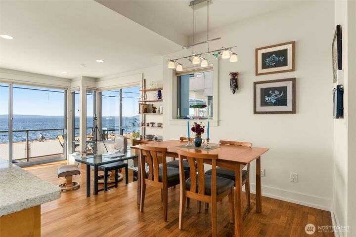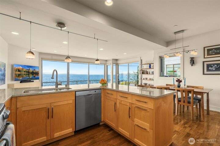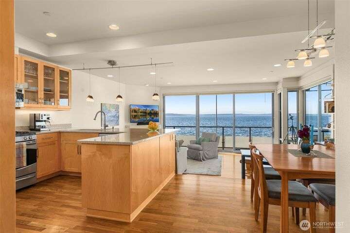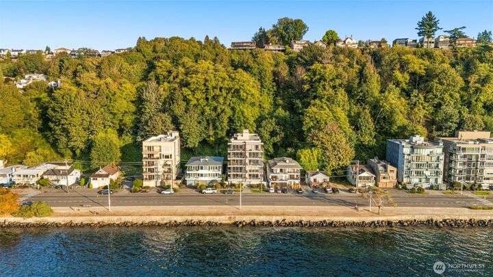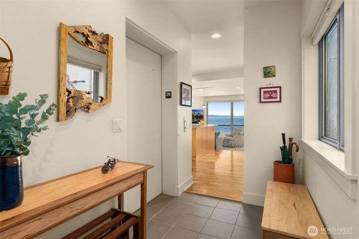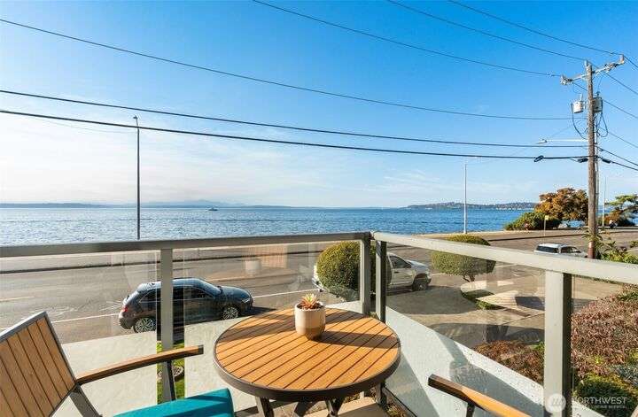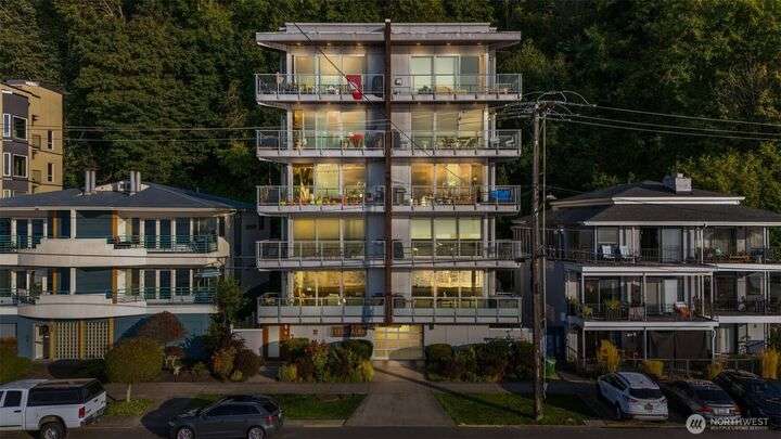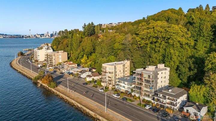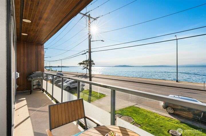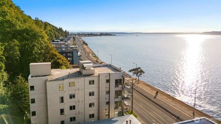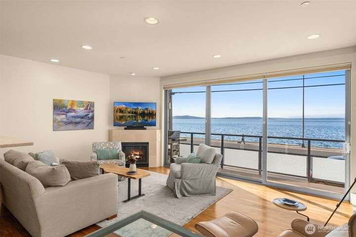 Experience sophisticated waterfront living in this rarely available contemporary boutique building. A secure elevator opens directly into your exclusive unit. Inside, floor-to-ceiling glass frames a dynamic view of Puget Sound, layered mountains & passing ferries. West-facing open floor plan is filled w/ natural light, inviting you to host or unwind while enjoying magnificent sunsets. Spacious primary ensuite offers a walk-in closet & five-piece bath (dual vanity, decadent soaking tub & spa shower). Excellent location! Easy access to scenic paths, beach parks, a promenade of restaurants, shops & cafes. Just a quick water taxi ride to downtown for work or play. High-quality construction, low dues & well-run HOA. Secure parking w/ EV charger.
