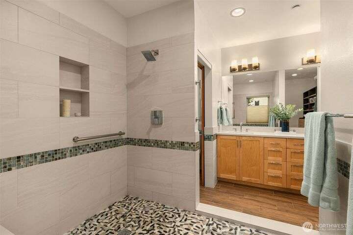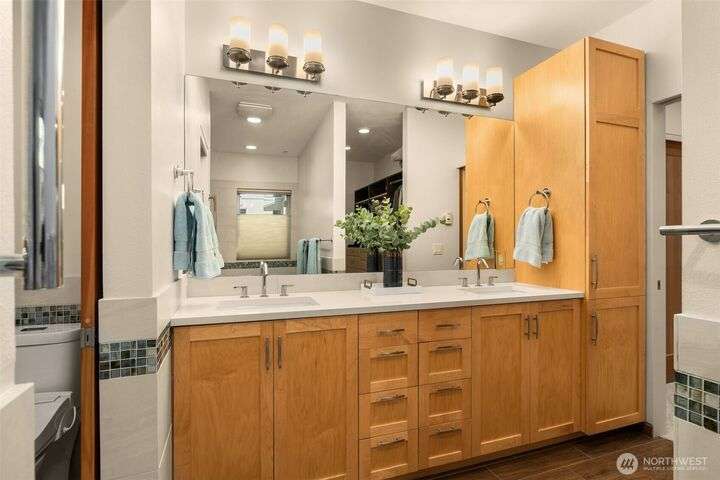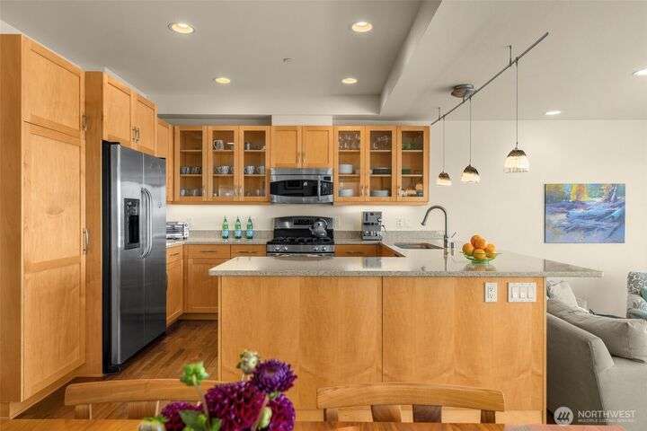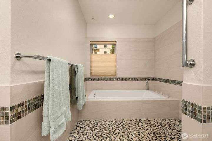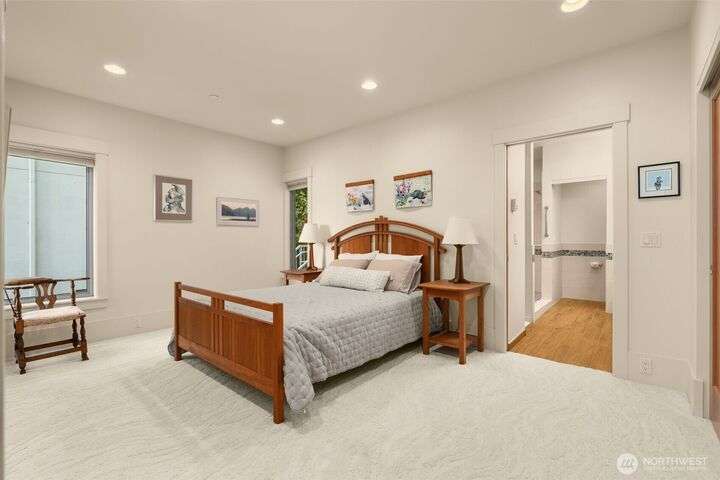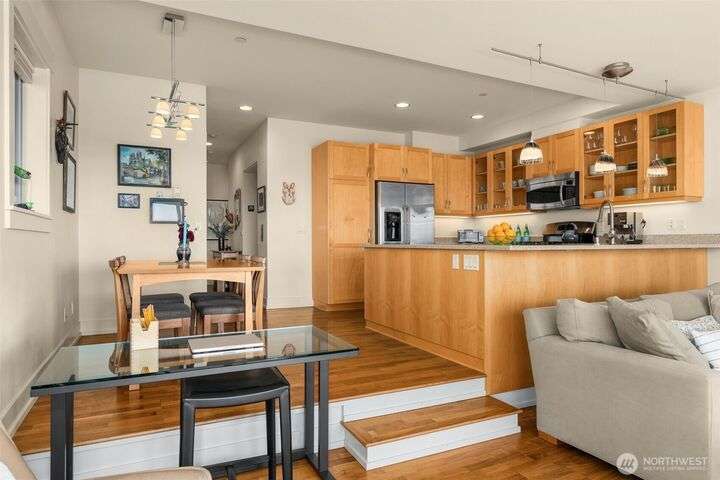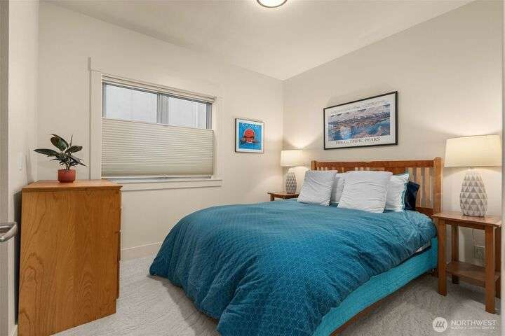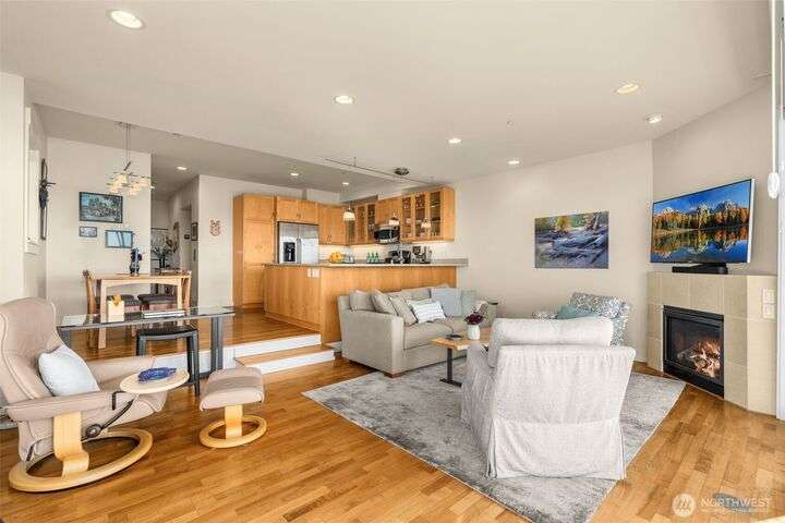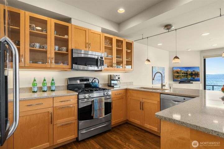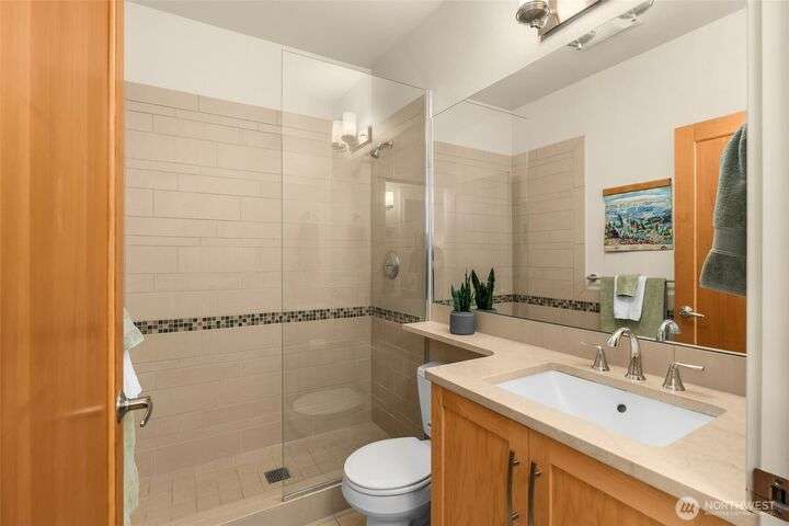 Experience sophisticated waterfront living in this rarely available contemporary boutique building. A secure elevator opens directly into your exclusive unit. Inside, floor-to-ceiling glass frames a dynamic view of Puget Sound, layered mountains & passing ferries. West-facing open floor plan is filled w/ natural light, inviting you to host or unwind while enjoying magnificent sunsets. Spacious primary ensuite offers a walk-in closet & five-piece bath (dual vanity, decadent soaking tub & spa shower). Excellent location! Easy access to scenic paths, beach parks, a promenade of restaurants, shops & cafes. Just a quick water taxi ride to downtown for work or play. High-quality construction, low dues & well-run HOA. Secure parking w/ EV charger.
