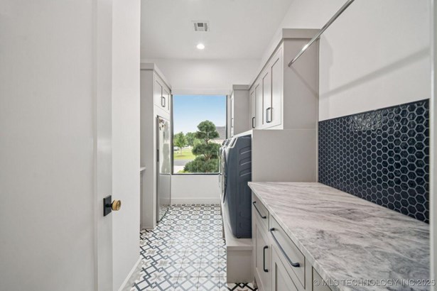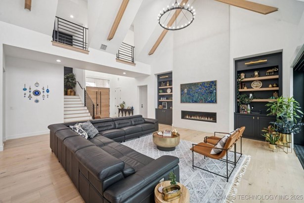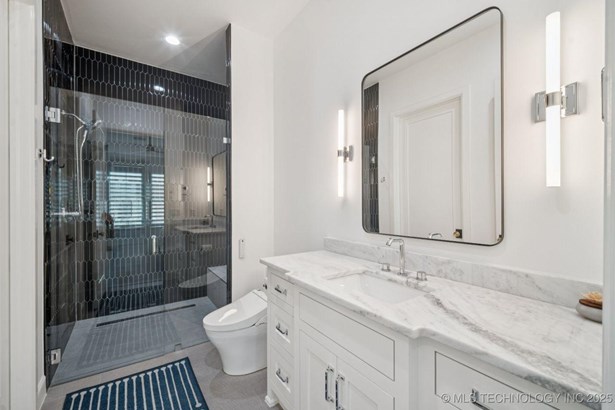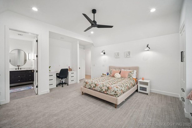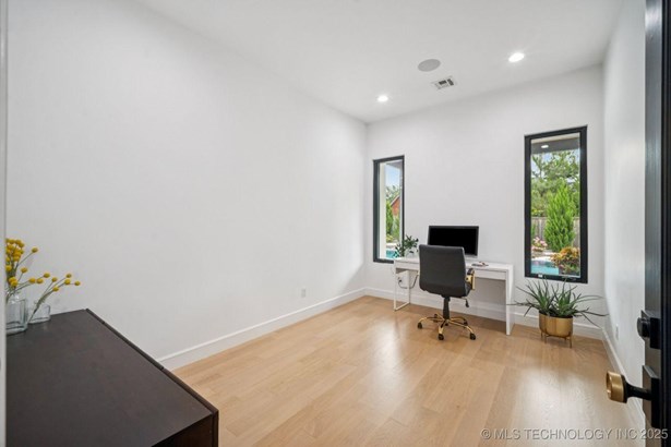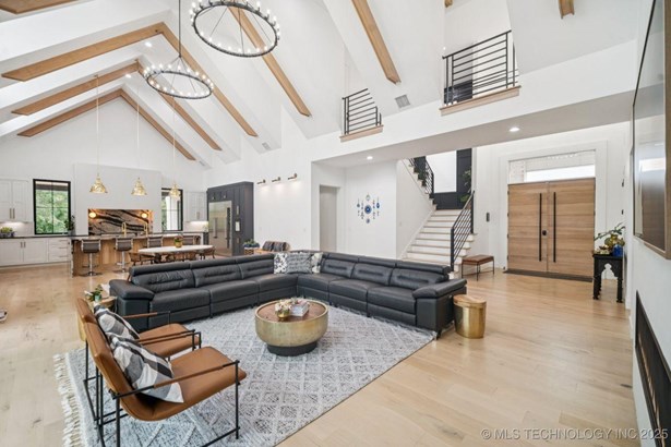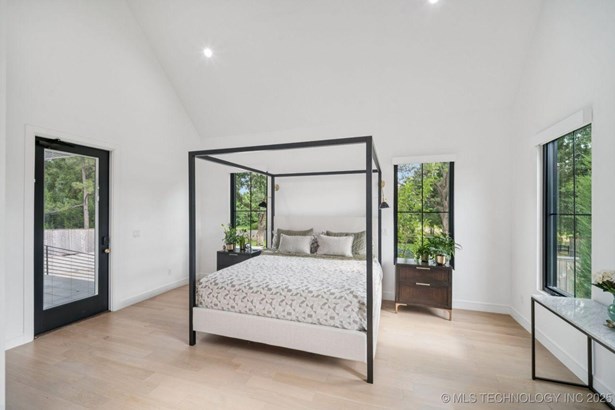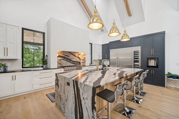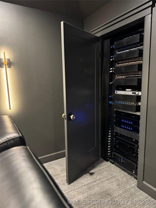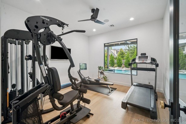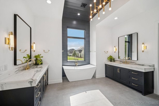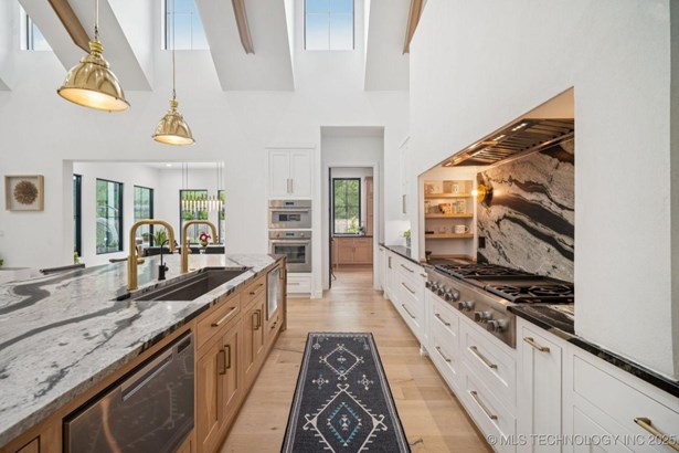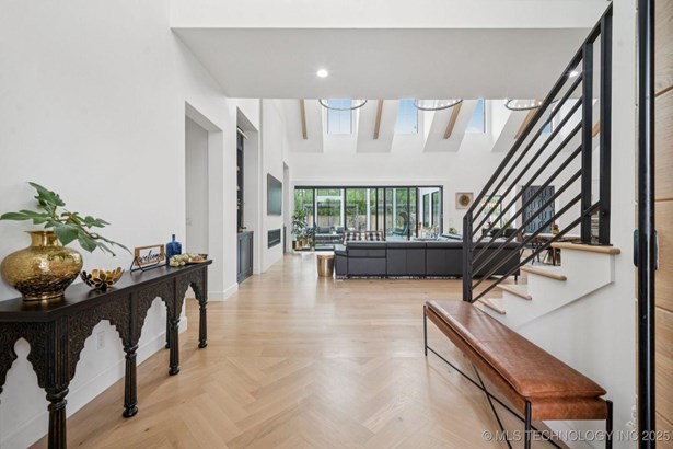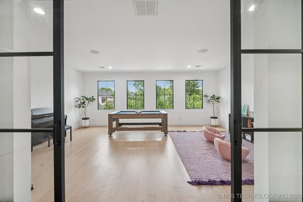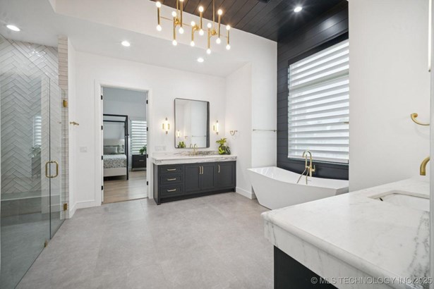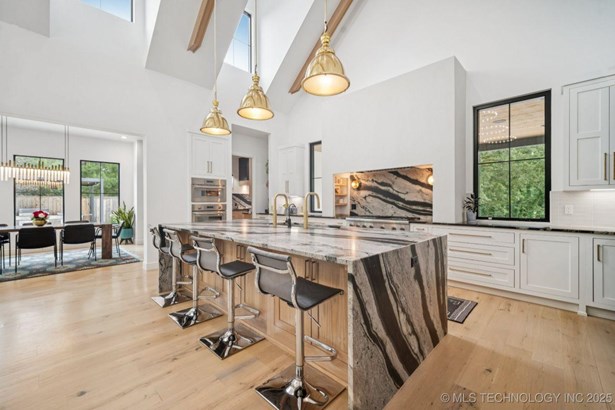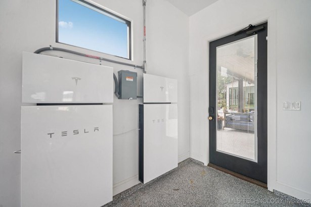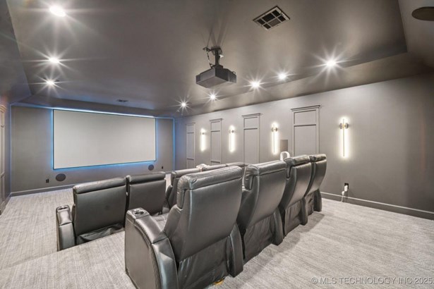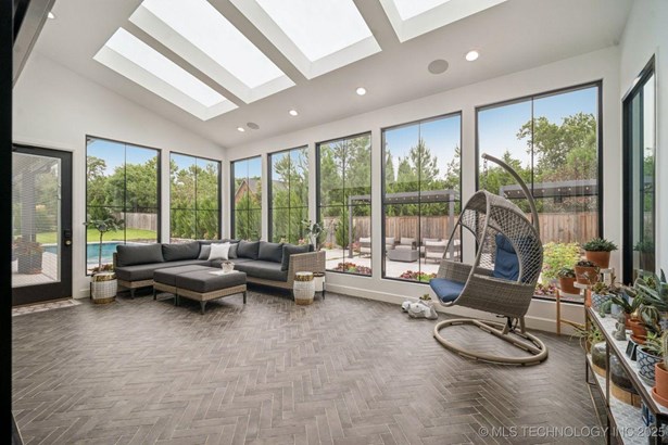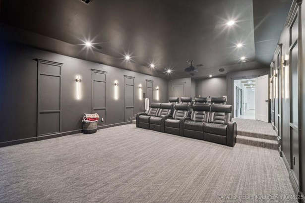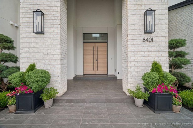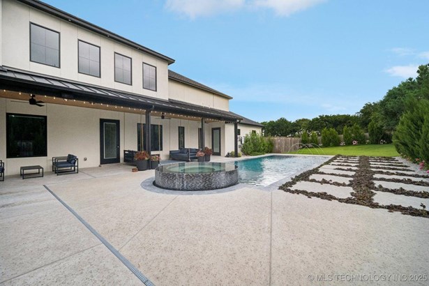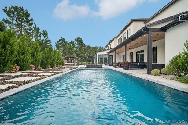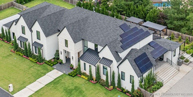 Modern Eco-Luxury Smart Home with Solar, Tesla Powerwall, Pool & Resort-Style Outdoor Living. Built in 2023, this modern estate combines contemporary elegance, energy efficiency, and future-ready technology. A striking exterior and lush evergreen landscaping welcome you inside, where soaring ceilings and floor-to-ceiling windows fill the home with light. The main level offers a designer kitchen with Thermador appliances, prep pantry, and reverse osmosis system-perfect for both everyday living and entertaining. Flexible living spaces include 5 bedrooms (all with ensuite baths + walk-in closets), 6 bathrooms, office, gym, enclosed sunroom, theater with wet bar, game room, hobby room, and dual laundries. A future elevator shaft and storm shelter add comfort and peace of mind. Step outdoors to a private resort retreat: sleek pool with spa, shaded pergolas, outdoor kitchen, covered patios (including a private patio off the primary suite), mature oak trees, raised garden beds, fruit trees, and drip irrigation. Smart features include rooftop solar panels, Tesla Powerwall, whole-home audio, integrated security with surveillance, motorized shades, wall iPorts, and EV-ready outlets in the oversized epoxy-finished 4-car garage. Located in the award-winning Bixby School District, this property blends sustainability, innovation, and luxury into one lifestyle. Special Features: Solar Panels Tesla Powerwall EV Charging / 4 car Smart Home Whole-Home Audio Motorized Shades Chef's Kitchen + Full Prep Kitchen / Pantry Theater Gym Sleek Pool & Spa Outdoor Kitchen Pergolas Seamless Indoor / Outdoor living Storm Shelter Future Elevator Shaft Dual Laundry Irrigated Raised Gardens Private Primary Patio. Be sure to view the video (https://iframe.videodelivery.net/5d62837dbdb4c3eabbff880f08a89753)