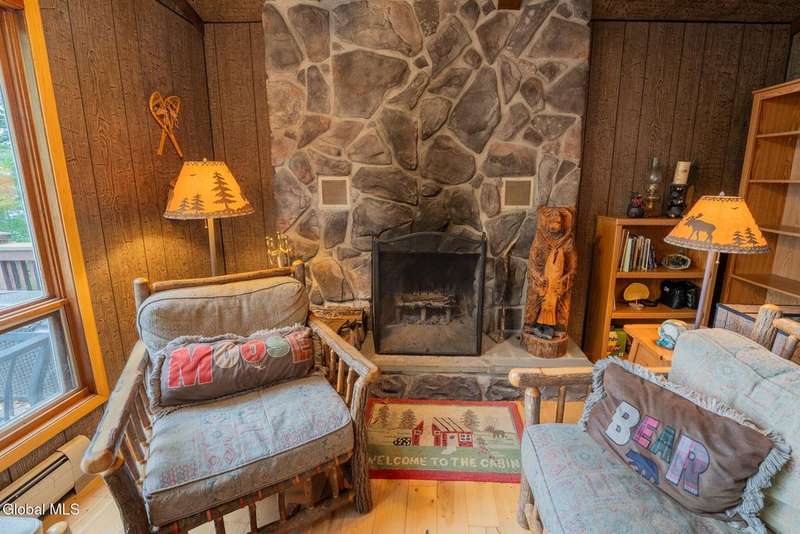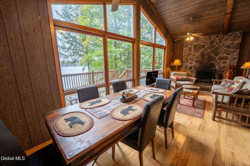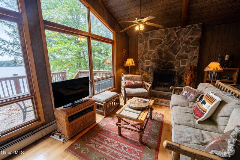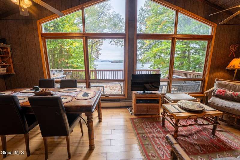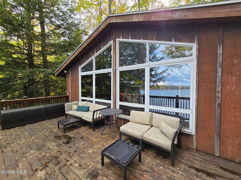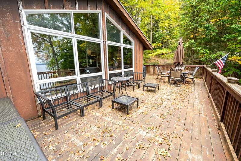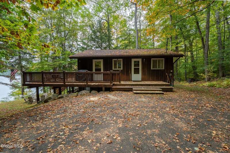 Nestled on the shores of Lake Pleasant, this year round 3-bedroom, 2-bath cabin offers 120 feet of direct waterfront, including sandy beach and an aluminum dock. The home features an open floor plan with wall to wall glass on the lake side and a spacious wraparound deck with abundant lake and mountain views. Vaulted ceilings, wood floors and a wood-burning fireplace complete the Adirondack charm of this home. The finished walk-out basement expands your living space with a large family room overlooking the water, a second full bath, and a bonus bedroom?perfect for guests or a private office. A paved driveway makes for easy year-round access. Just minutes from the Village of Speculator and Oak Mountain Ski Center, this property offers four-season recreation in a serene, private setting. The area provides easy access to snowmobile and hiking trails throughout the Adirondack Mountains. Whether you're seeking a weekend retreat or a year-round residence, this lakeside classic is a rare opportunity to own a piece of the Adirondacks.
