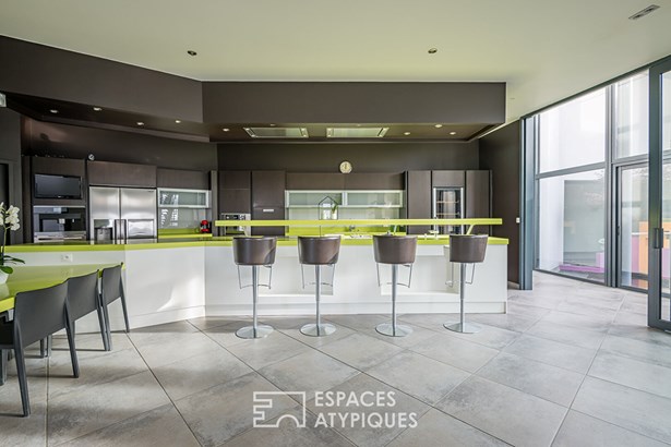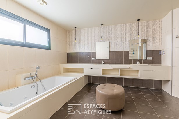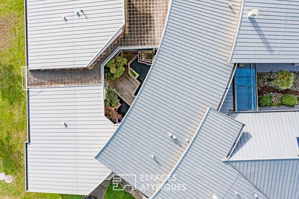 Set on nearly 3 hectares of land, just 2 km from the center of Sainte-Bazeille and 5 km from Marmande, about an hour from Bordeaux, this ultra-contemporary property offers 487 sqm of living space amidst an open horizon. Nestled in a peaceful and secluded setting, it benefits from over 1,295 sqm of outbuildings, including 217 sqm of covered outdoor spaces, offering exceptional versatility. With its bold architecture, airy volumes, and energy efficiency, modernity is experienced on a grand scale. Conceived as a fluid structure, the house is organized around a light-filled central atrium, the true backbone of the interior circulation.
